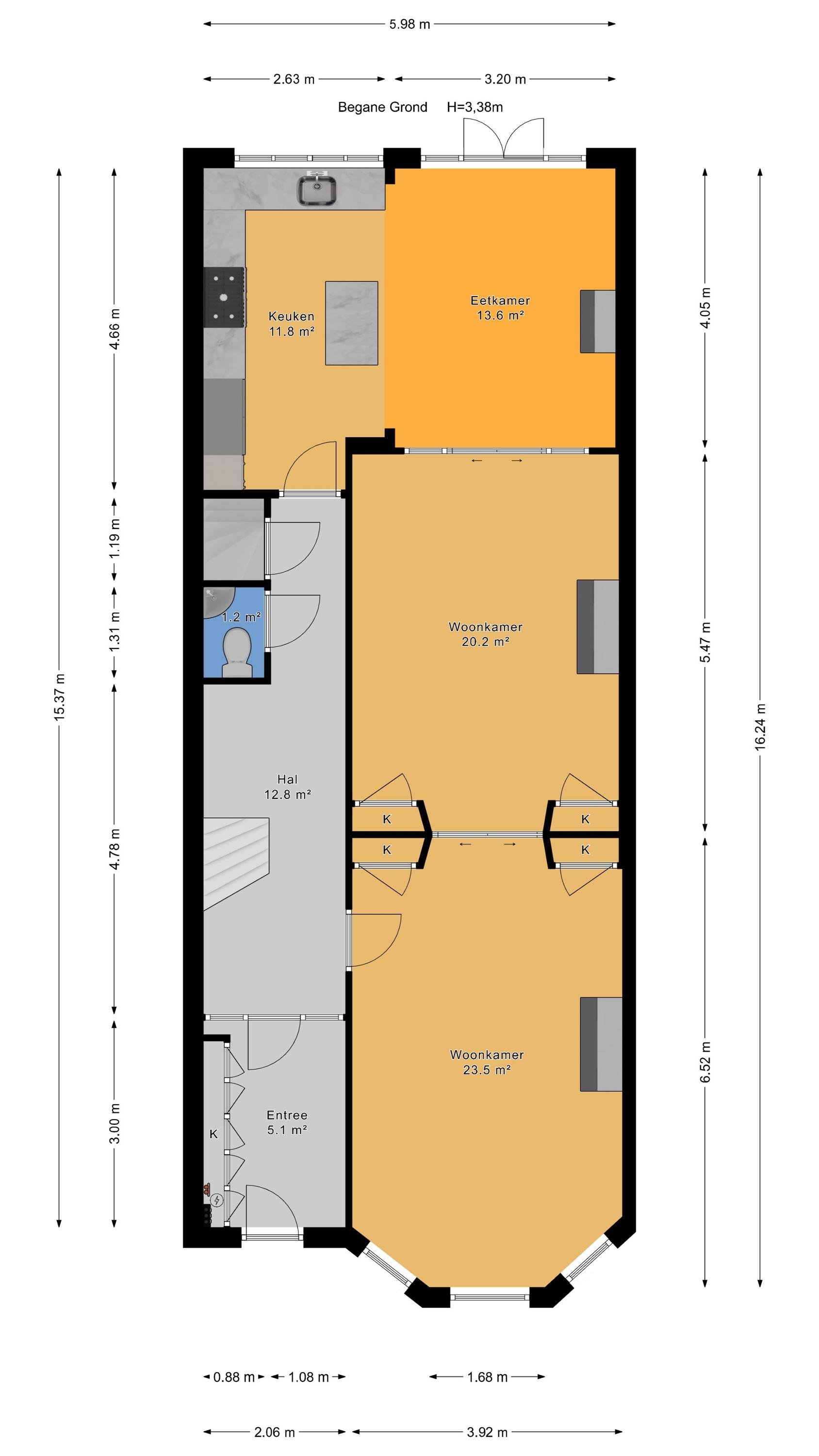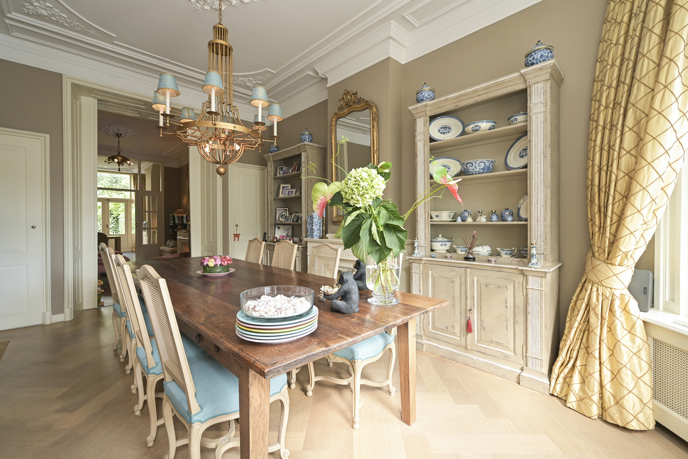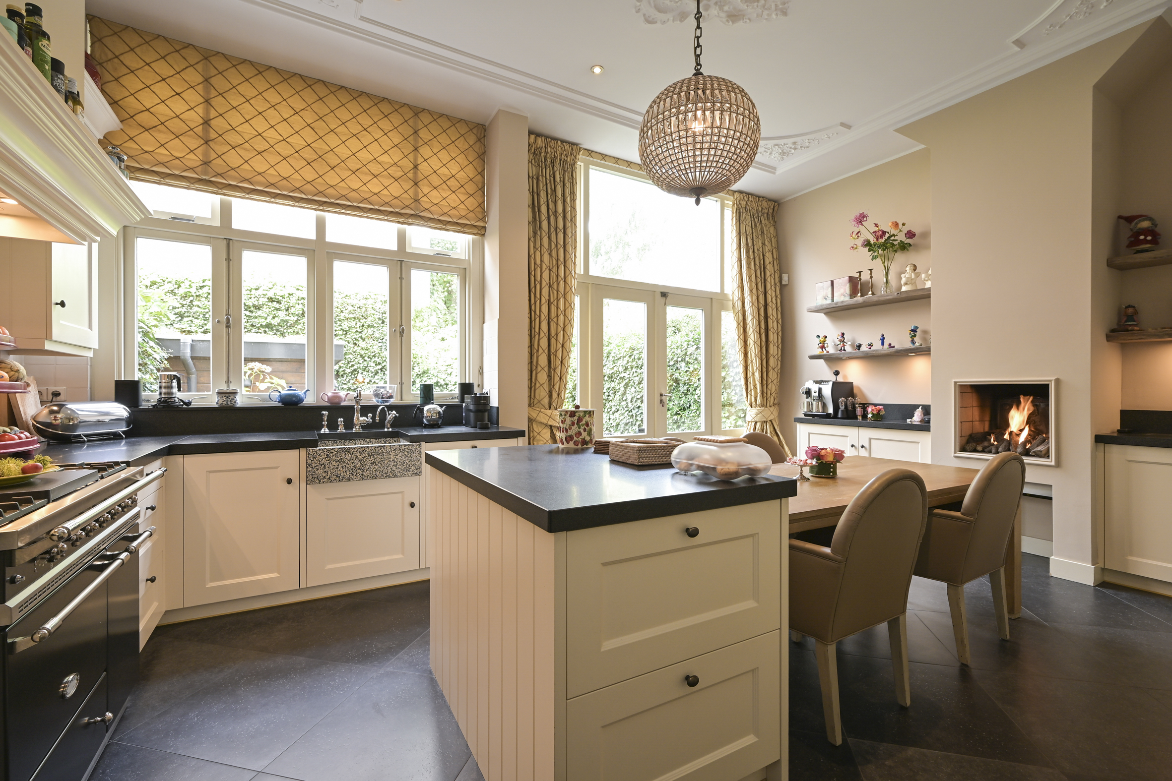 Layout: entrance, vestibule with built-in wardrobes and draft separation, hallway with storage space under the stairs, modern toilet with washbasin, and access to the cellar. Delightful, spacious living/dining room with suite separation featuring high sliding doors and built-in cupboards. Both rooms feature high ornate ceilings, beautiful oak parquet floors, and marble fireplaces with (gas) fires. The back room is connected to the full-width eat-in kitchen by a transparent partition, featuring built-in appliances, an island, and a gas fireplace. Double French doors lead to the delightfully private rear garden with a back entrance.