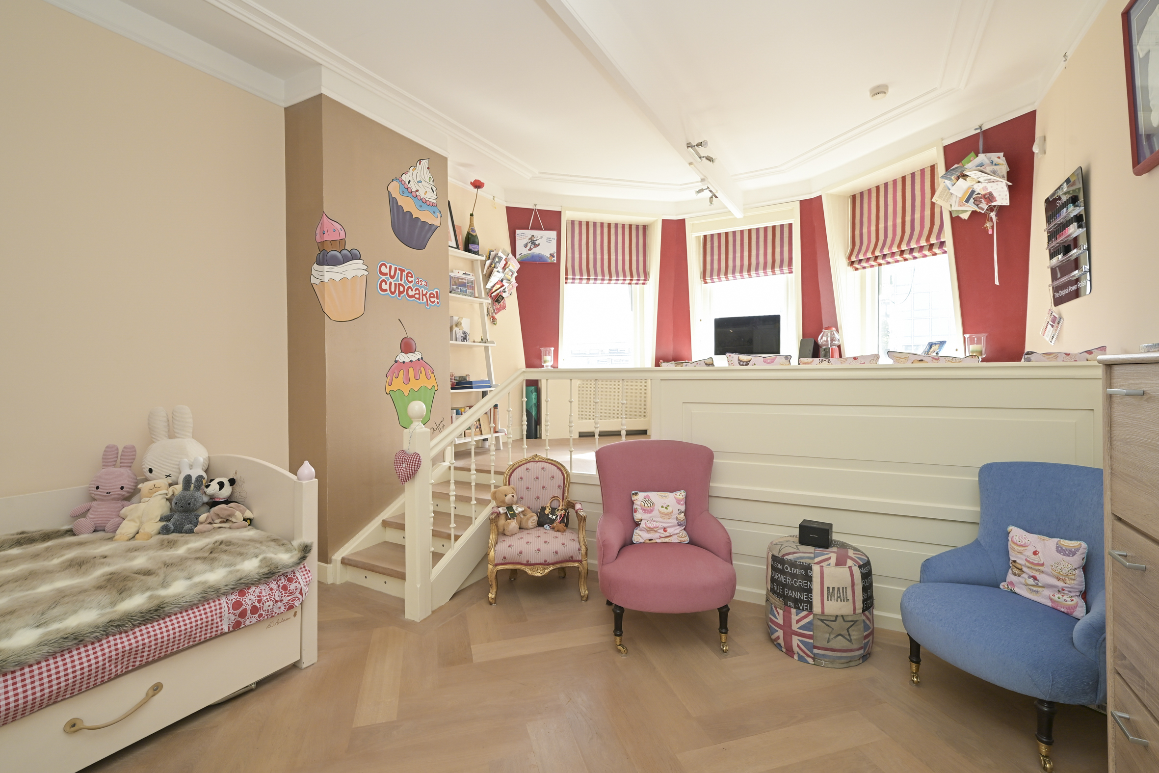 The beautiful staircase leads to the first floor, landing, modern toilet with washbasin, spacious rear bedroom with beautiful oak flooring, fireplace with gas fire, high ceilings, walk-in wardrobe, and an adjoining full bathroom with bathtub, separate walk-in shower, and double sinks with vanity units. At the front is the full-width classic study with high ceilings, fireplace with gas fire, oak floors, built-in bookcases, and an unobstructed view.