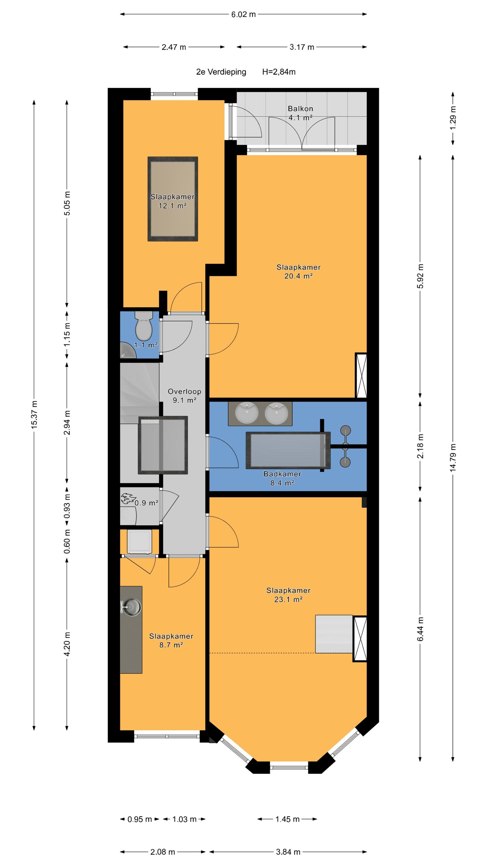 The 2nd floor features a bright landing thanks to the skylight, a modern toilet with a washbasin, a rear side room currently used as a gym, a large bedroom at the rear with French doors opening onto a balcony, a front side room with connections for a washing machine and dryer, a large bedroom at the front, and a complete intermediate bathroom with two separate showers, double sinks with vanity units, and natural light. All rooms on this floor feature oak flooring and air conditioning units.