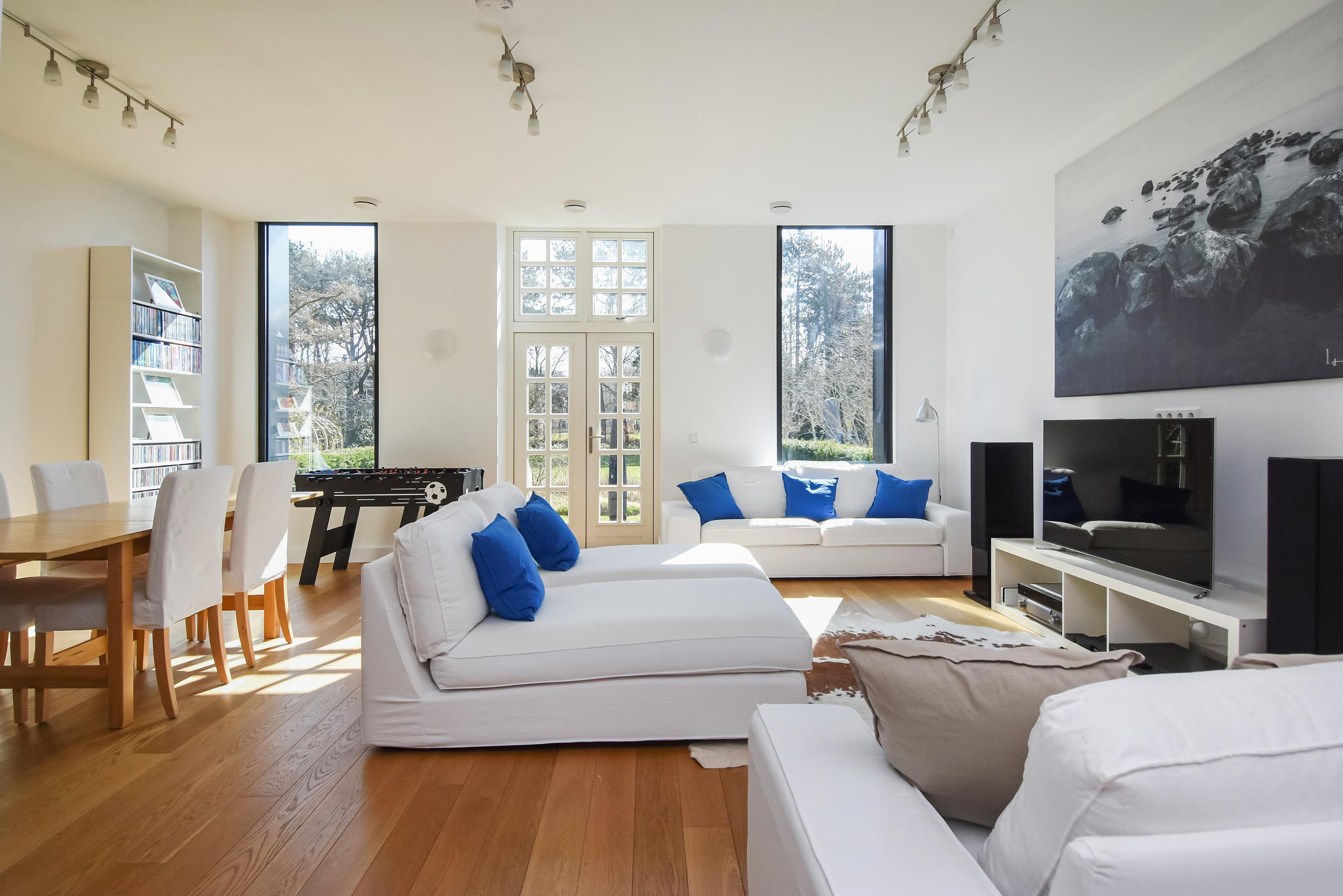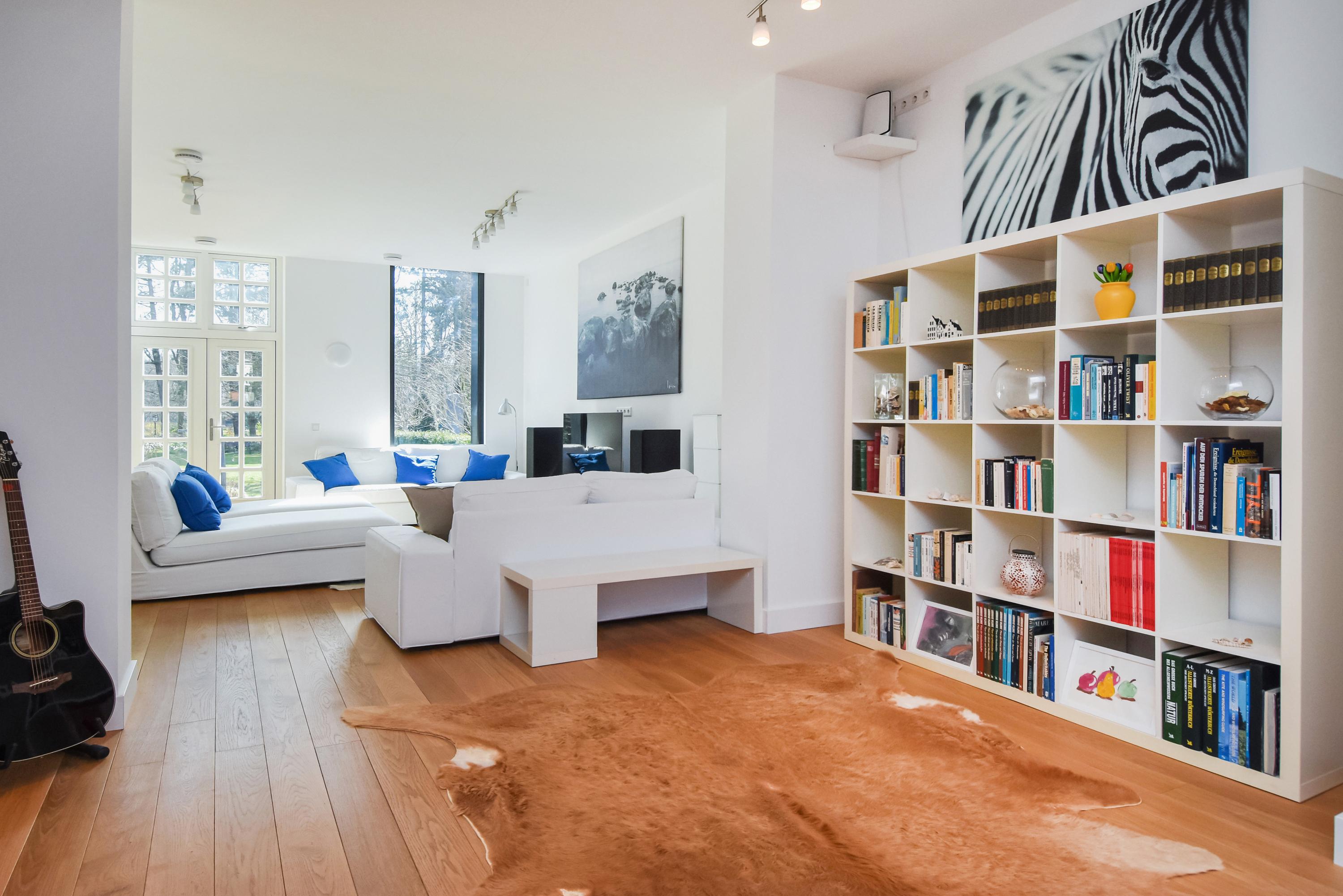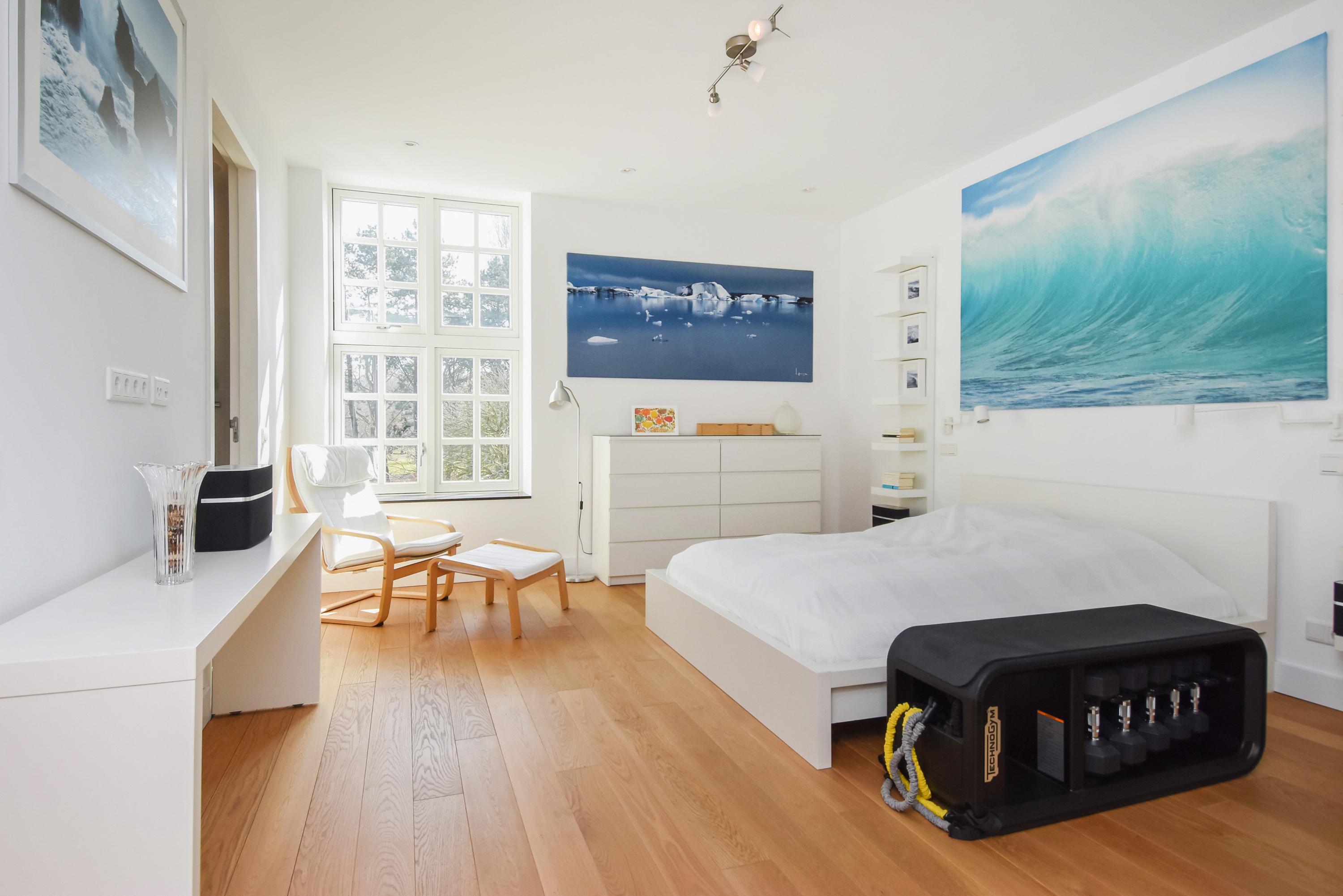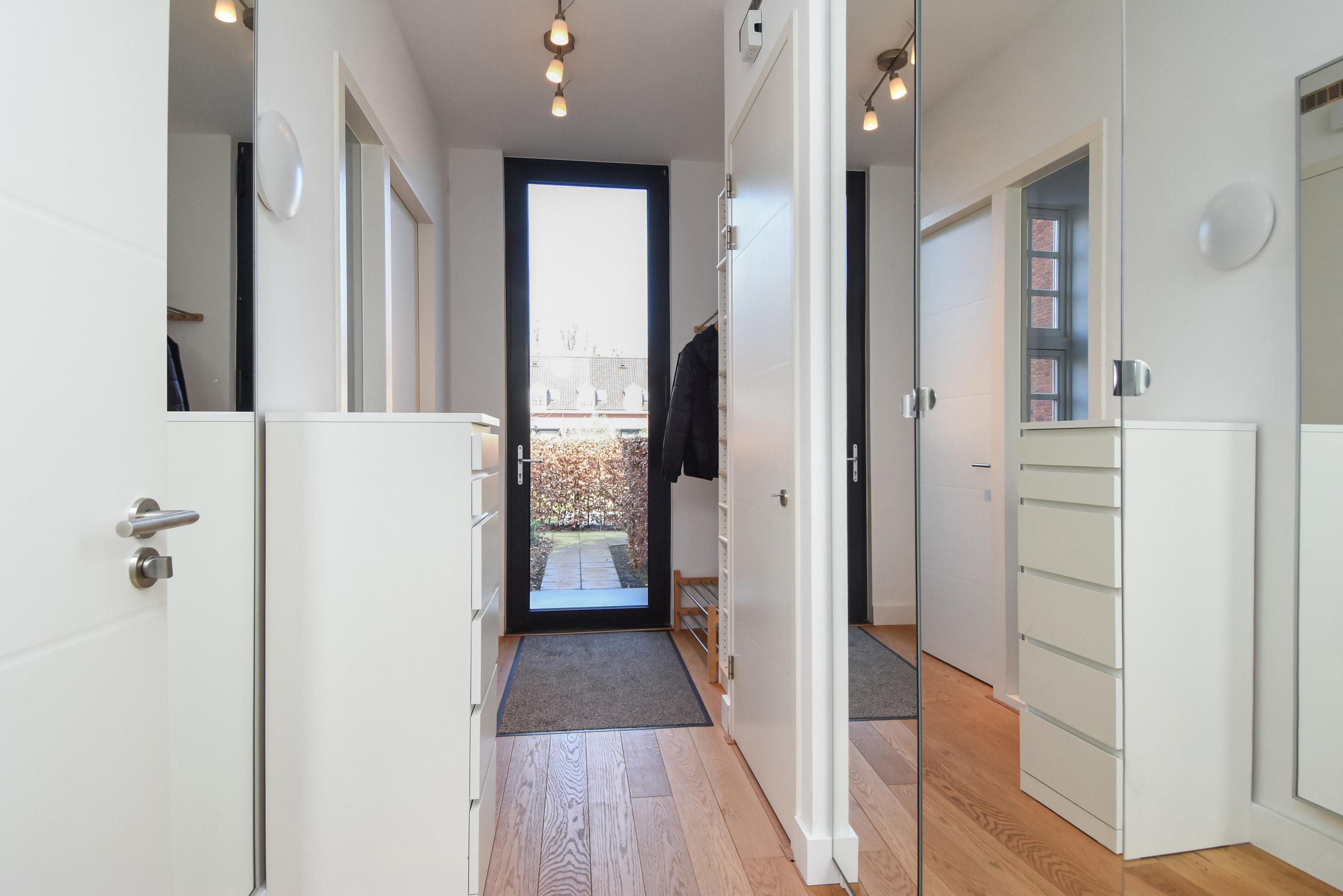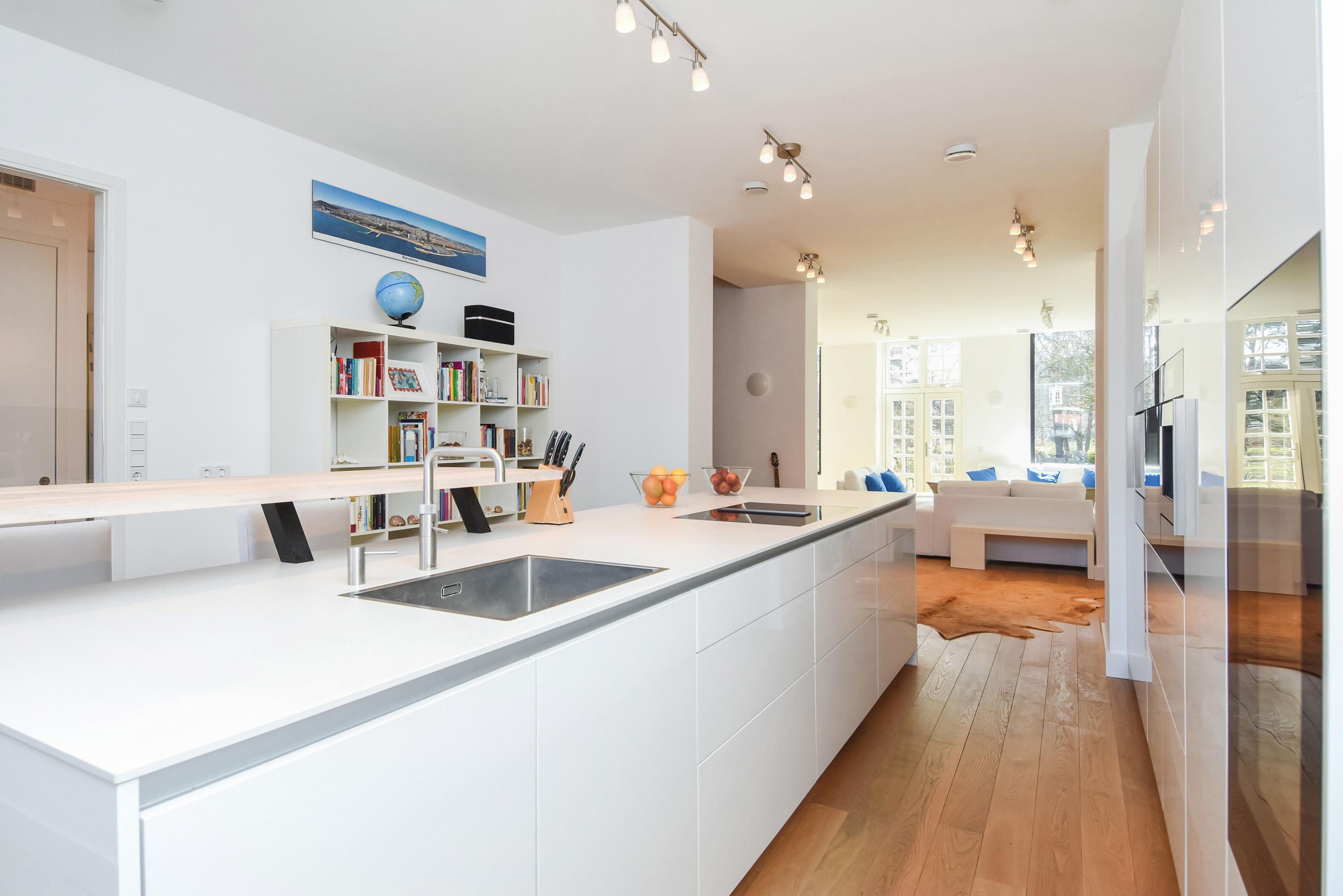 Floor-to-ceiling windows and high ceilings create luminous interiors, while solid oak floors and underfloor heating offer tactile comfort. Double doors open from the main living area to a southeast-facing garden of approximately 58 m², directly adjoining the private park reserved for residents. The ground and upper levels, connected by a fixed staircase, provide expansive spaces for family life or privacy.