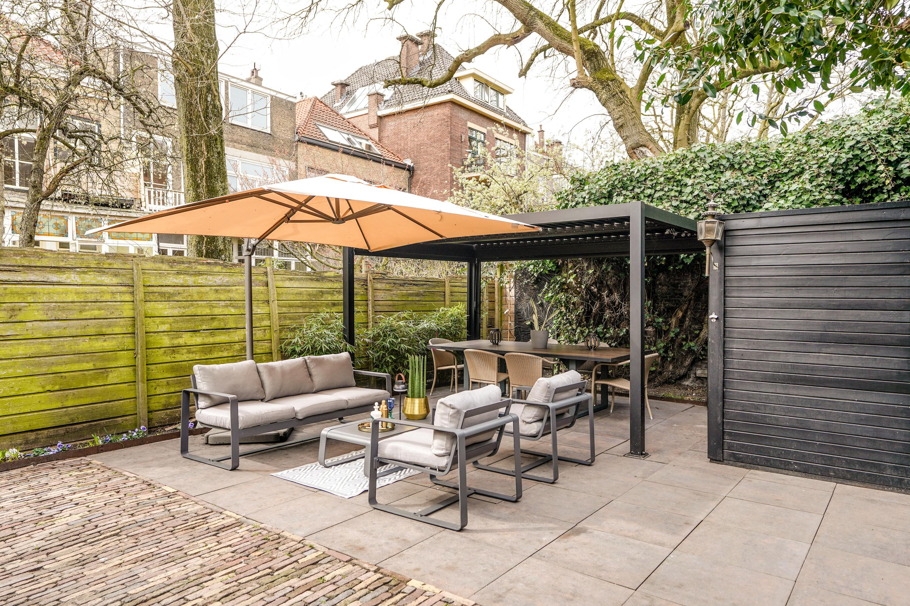From the dining room you access the beautifully landscaped deep rear garden, offering an attractive combination of terrace space, greenery, a covered seating area and a detached storage shed. A wonderful place to sit outside in peace, dine or entertain guests.