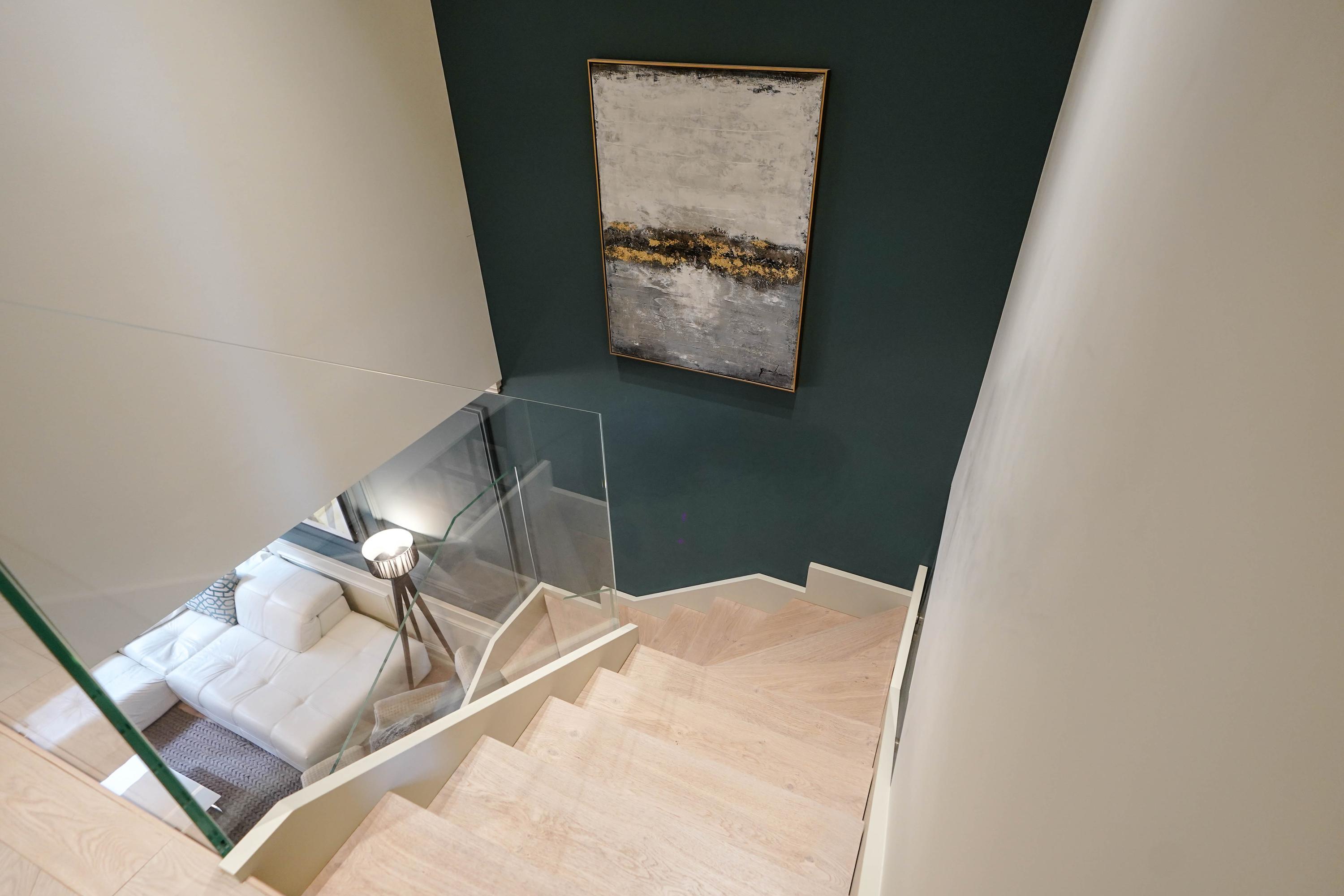 The entrance hall provides access to the generous main living floor. At the front is the living room, featuring a spectacular staircase leading to the first floor, and a spacious bathroom. This is a stylish space with a beautiful finish, high ceilings and an elegant, luxurious feel.