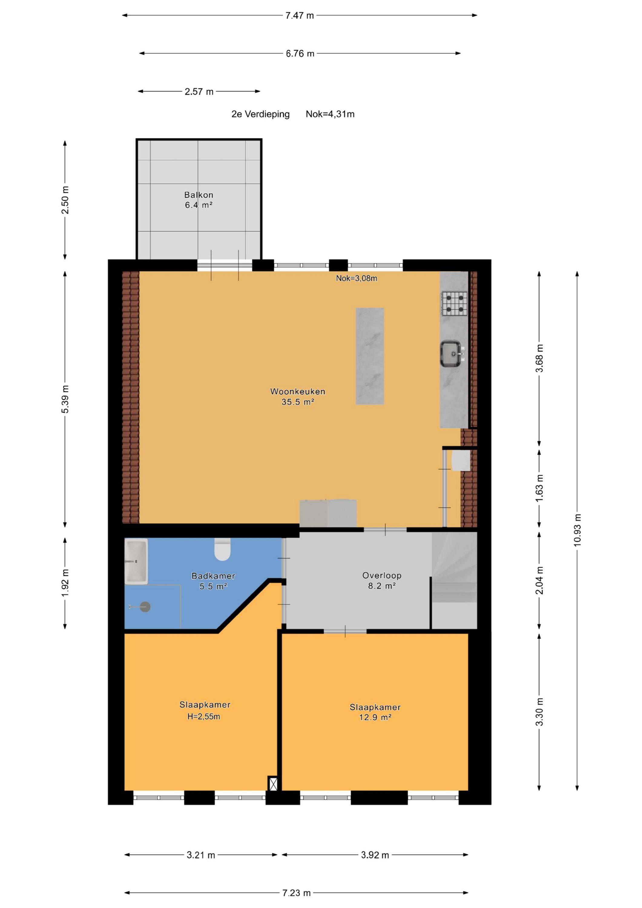 The second floor is arranged as a fully self-contained apartment, accessible via a separate staircase. It includes a spacious kitchen/living area, two bedrooms, a bathroom, a central landing and a private balcony.