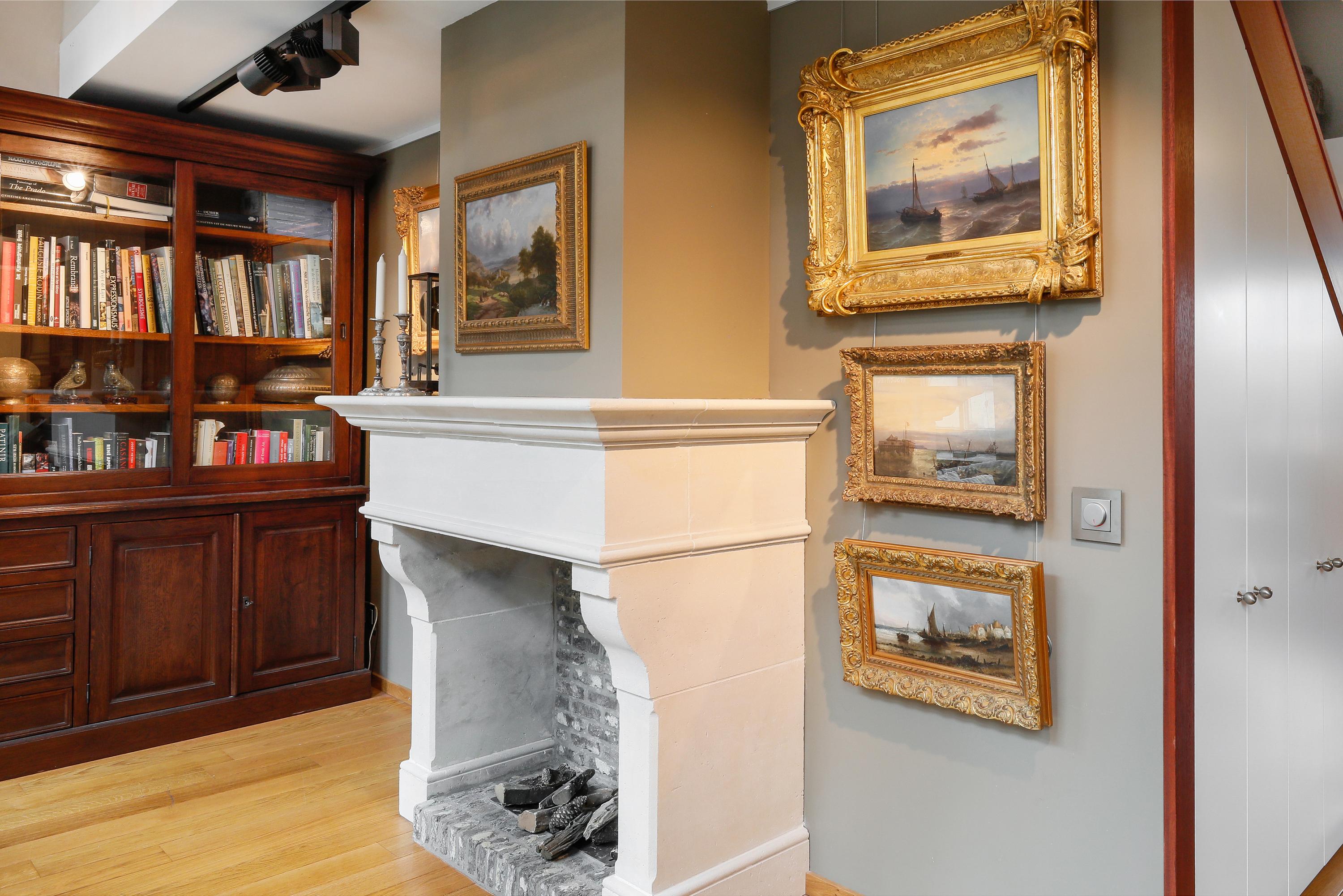 On the street side, you'll find the library. Here, too, a beautiful high ceiling. On a slightly cloudy day, it's bright here, but when the sun comes out, you'll be amazed. The abundant light can be tempered with wooden Jasno blinds. There's a beautiful classic fireplace with a bio-ethanol fire, connected to a central exhaust system via a damper. With a few adjustments, this library space could also be transformed into a fantastic bedroom. It's on the same level as the living area. But the house offers plenty of opportunities for long-term living for all ages and mobility levels.