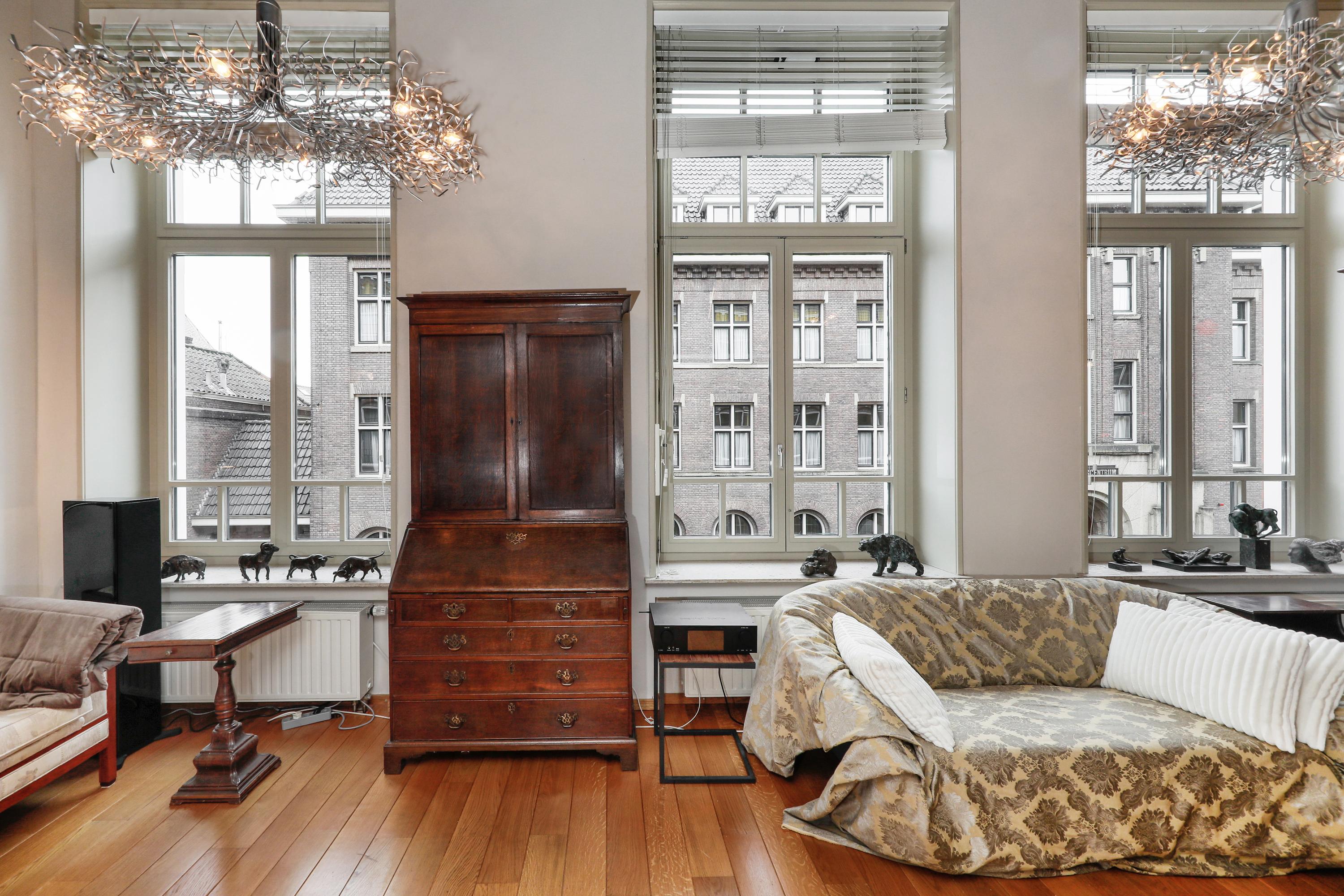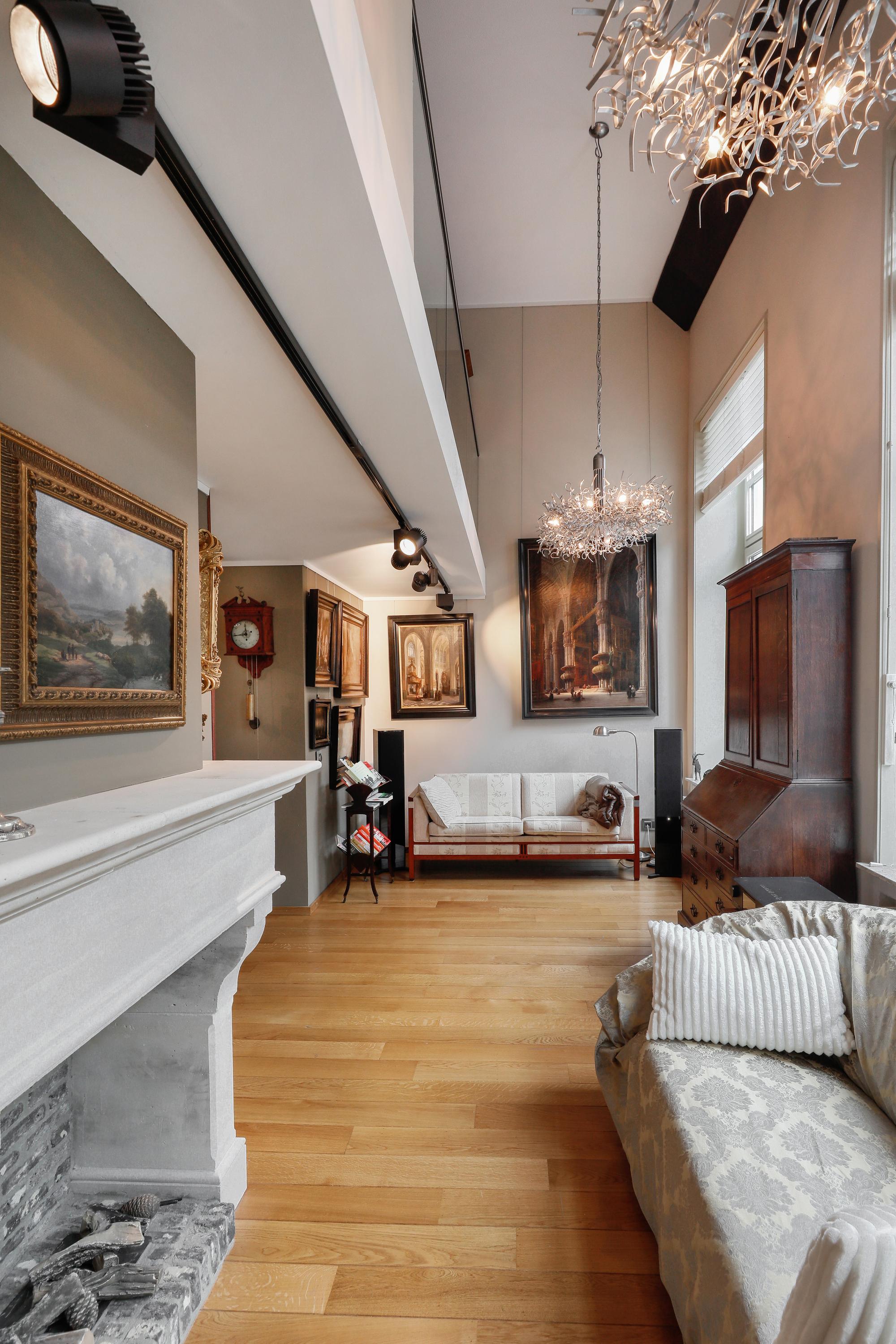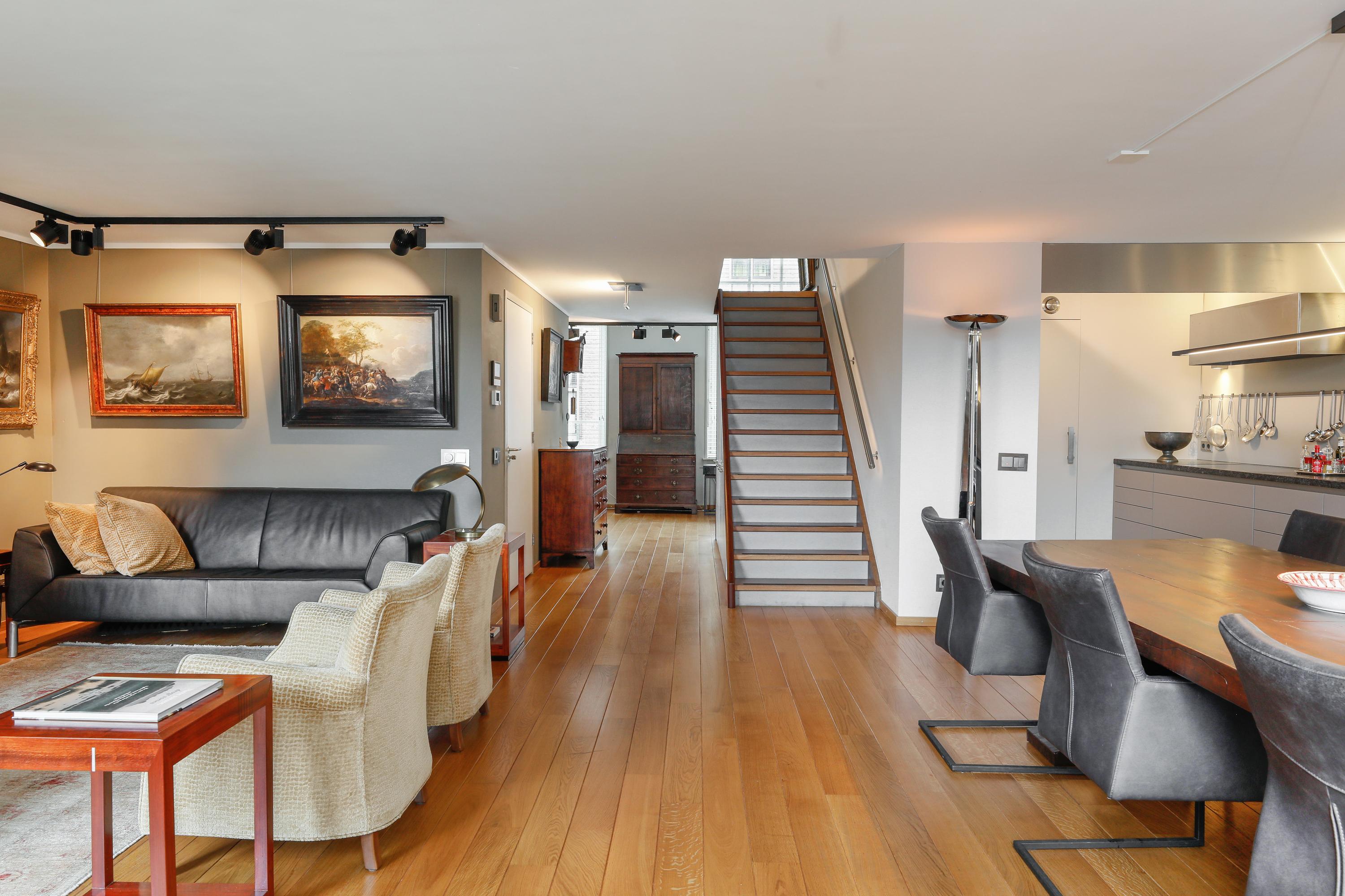 It's quite special to find this modern home behind the historic facade. During the renovation/reconstruction, only the front facade remained. With the tall windows, that history still permeates your luxury apartment. And thankfully so. The ceiling height on the facade is still approximately 580 cm. Beautiful, and it allows light to penetrate deeply into your home. Where a loggia was planned in 2001, there's now a space that can be used year-round. So even on a summer day, it can be used as a loggia by opening the large, tall windows. A cozy seating area and the kitchen are located downstairs.