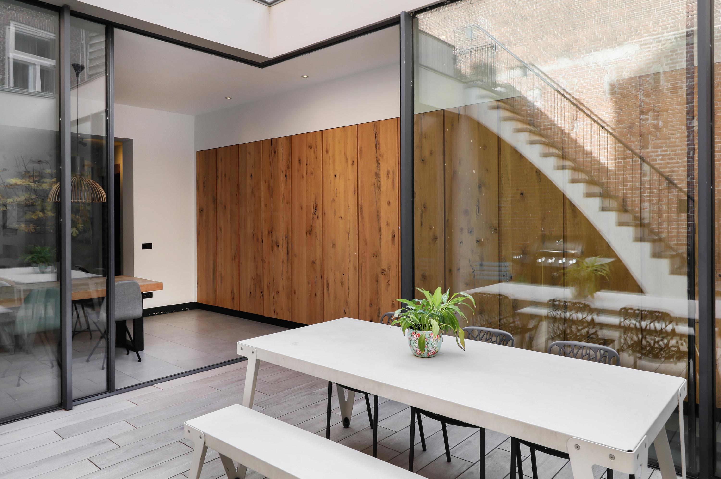 Of course, everyone is familiar with the front of St. Jacob's Church. But your visitors will still be surprised by the view from this side. The architect's approach to this project was a surprising one. By installing a huge transparent wall, the inside becomes the outside, and vice versa. The wall can be slid open in two directions from the corner. During the day, it's a wonderfully bright spot for a cozy dining table, and in the evening, you can dine with this remarkable view. The long wall of cabinets makes your home both practical and tasteful. This home also offers more outdoor space than is typical in the city center. In addition to a large courtyard garden, there are two roof terraces. So, you can choose your own spot for sun, shade, reading a book, enjoying a glass of wine together, or enjoying a delicious dinner al fresco.