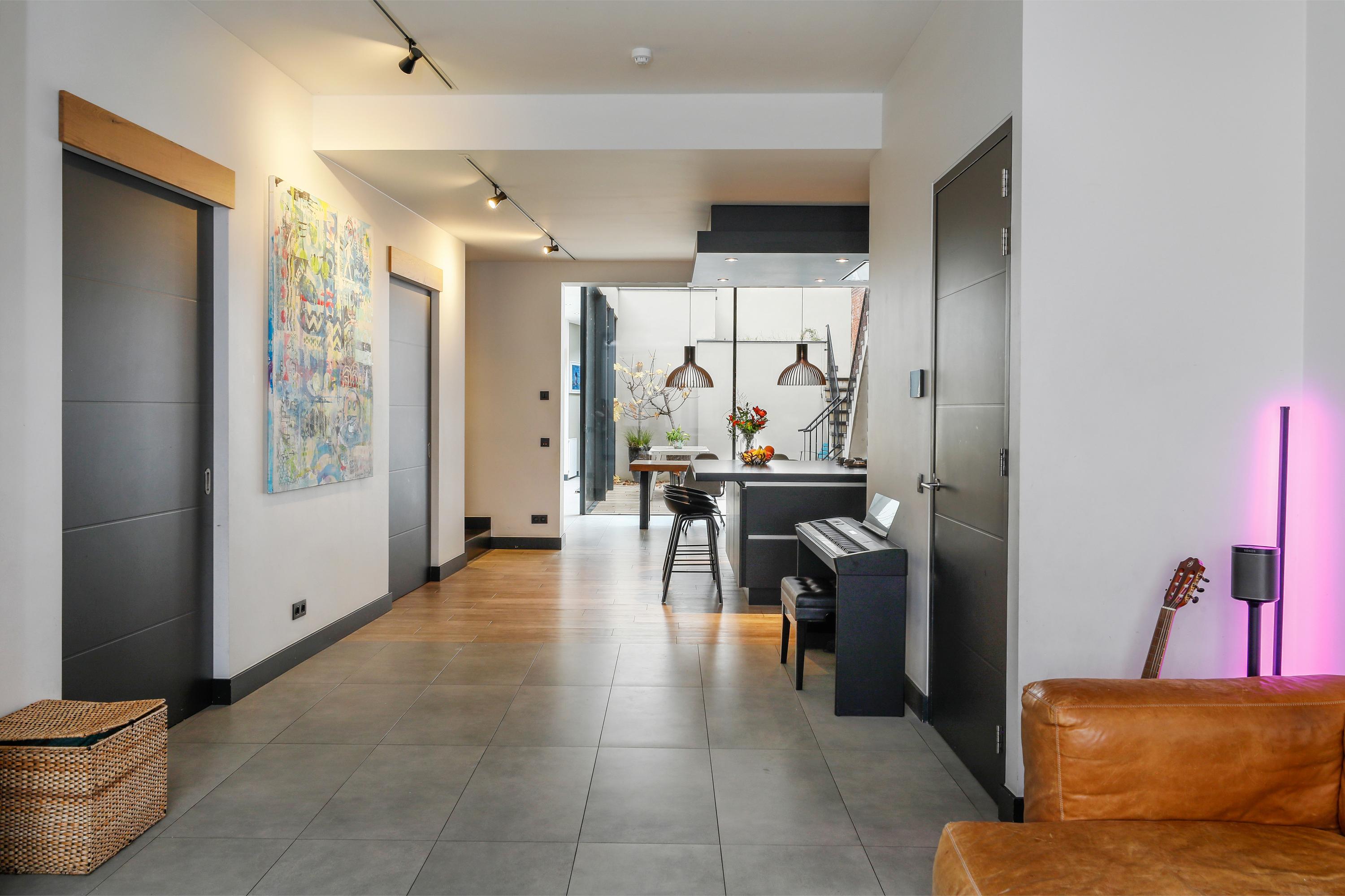 It's especially nice when the sitting area is at the end of the room. Here, you can find peace and quiet in the evenings, without the hustle and bustle. The fireplace is incorporated into a wall, as is the TV. Behind this wall, there's plenty of storage, with shelves providing ample space for displaying beautiful items. Just like the rest of the ground floor, the tiled floor resembles a wooden one. This floor not only creates a warm atmosphere, but thanks to the underfloor heating, it's also very comfortable for bare feet. A large arched window provides ample natural light.