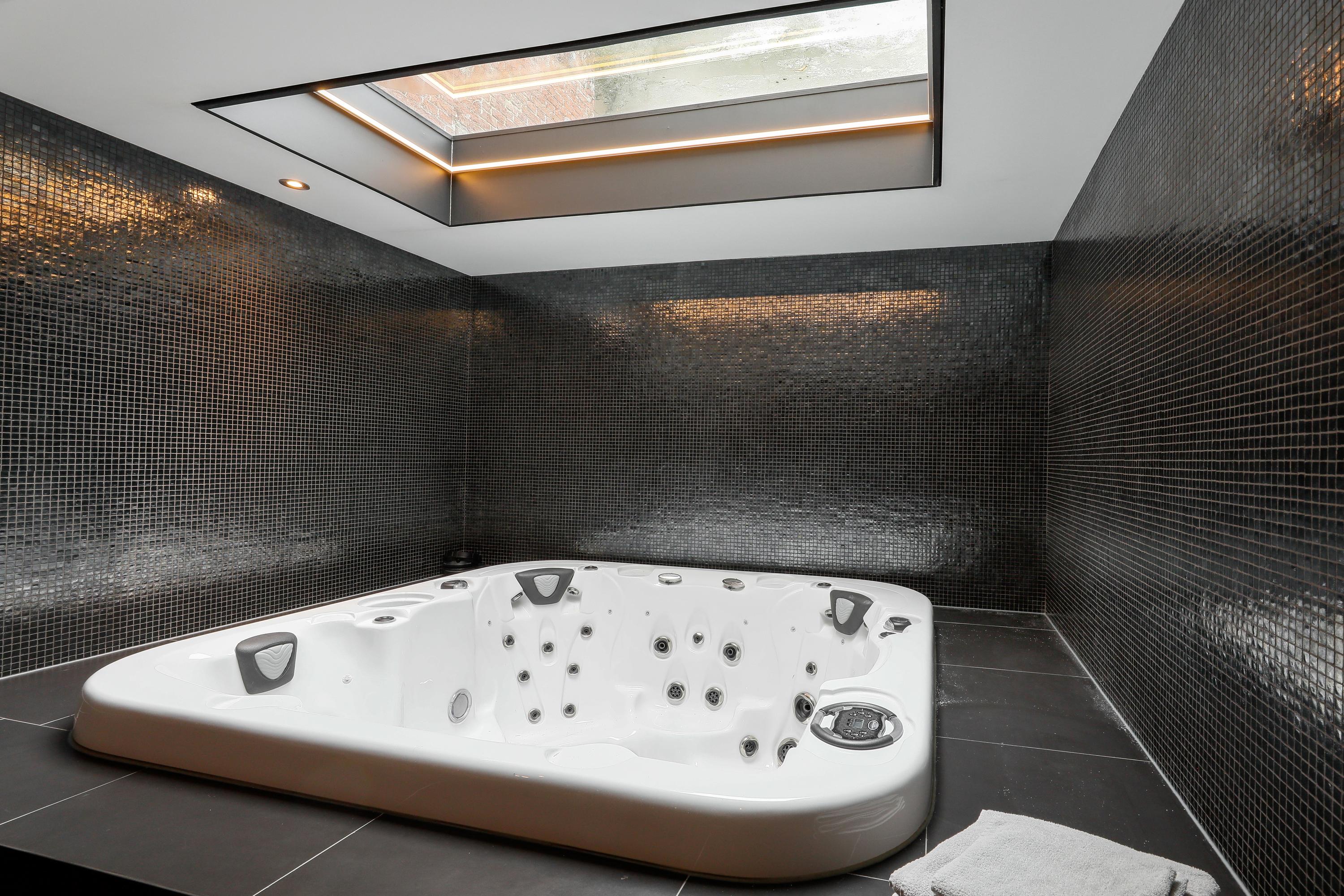 In the back house, on the first floor, you'll find a large room suitable for a variety of purposes. It's currently used as a gym. Below, you'll find the technical room for the spa. There's a sauna with, again, a large glass wall. The heater is freestanding in the room, and there are benches for three people. The (plunge) shower is located at the back. Perhaps even more beautiful is the jacuzzi for about four people. Up on a raised platform under the starry sky behind a glass roof, this is the ultimate relaxation experience, right at home.