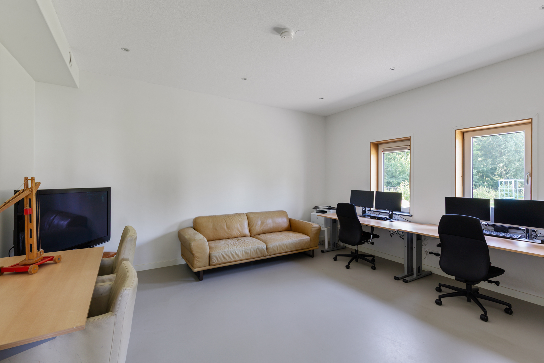 A fixed staircase leads to the fully insulated attic, with full standing height along the length of the house. Industrial steel trusses and rustic wooden beams lend this space character. Three Velux roof windows ensure ample light. Ideal as storage or for conversion into additional living or work areas.