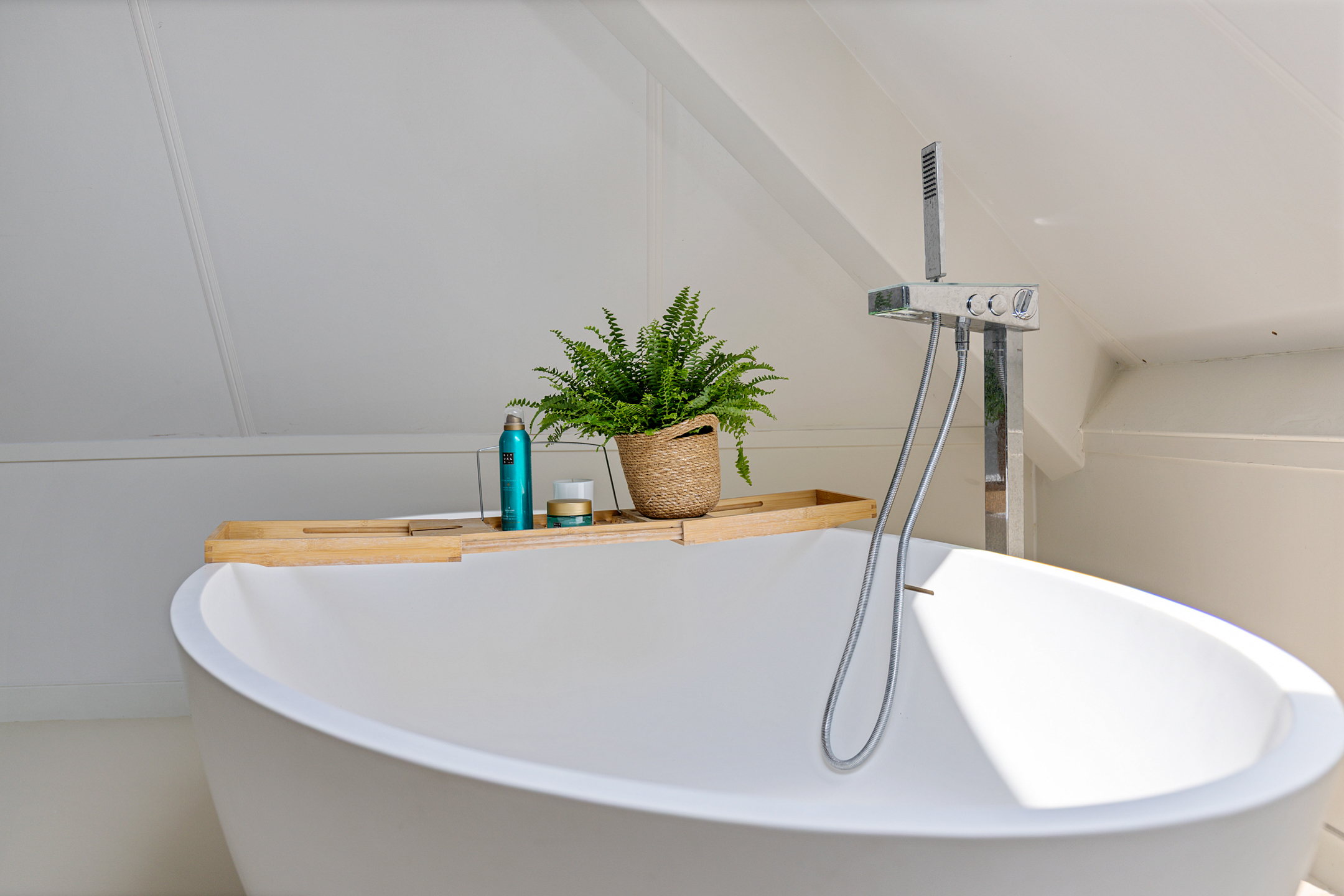 The master suite (46 m²) is a true private retreat with panoramic water views through floor-to-ceiling windows in the zinc-clad *risaliet*. An extra dormer window offers views of the adjacent nature reserve island. The luxurious en-suite includes a freestanding bathtub, double sink, walk-in shower and WC – a space that offers the perfect start to each day.