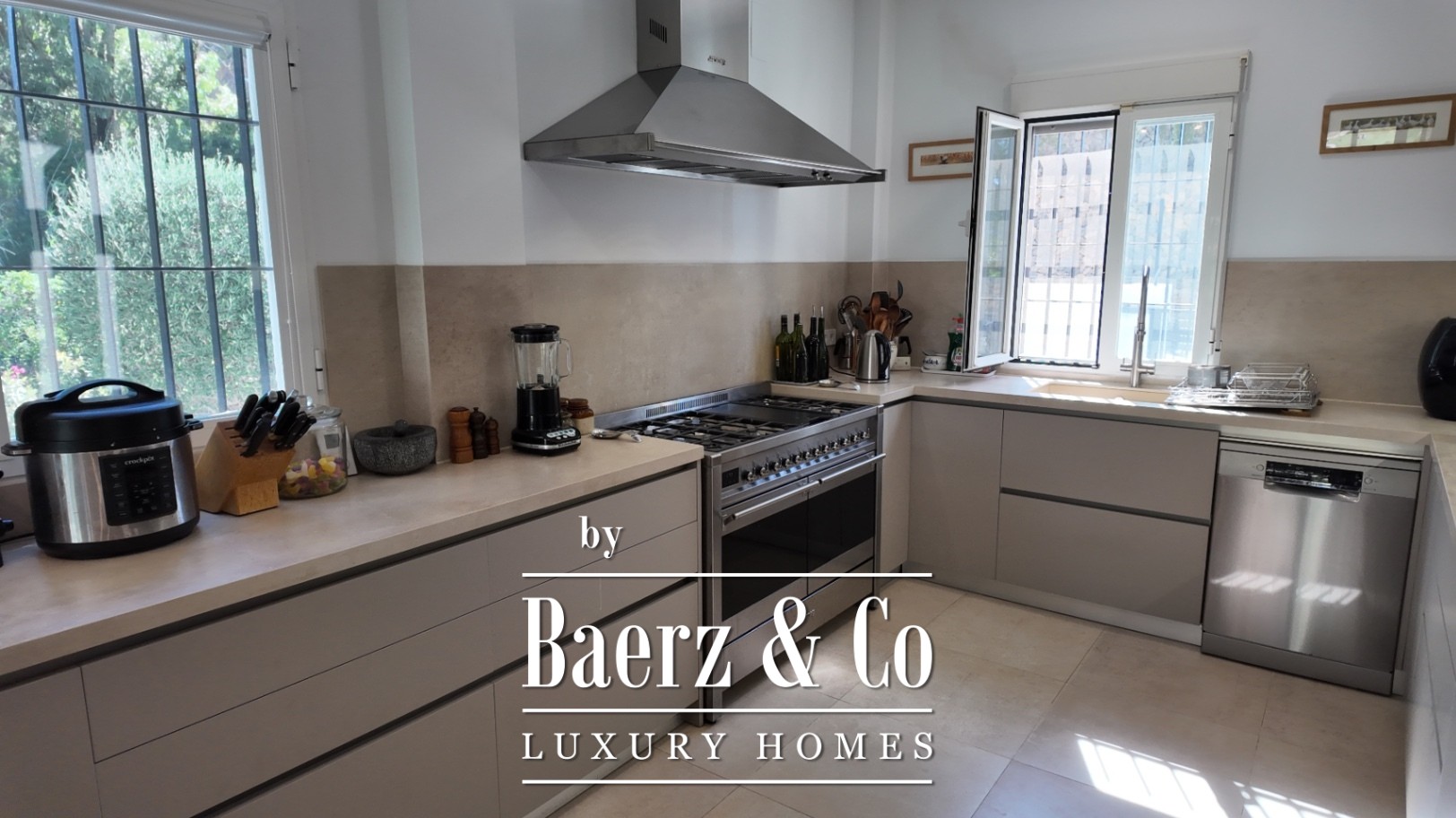 Landscaped grounds are designed for effortless enjoyment, featuring a saltwater pool with pre-installed heating, spacious terraces, and a fully equipped summer kitchen. A double garage, air conditioning, central gas heating, solar panels with batteries, Scandinavian oak flooring, security features, and water softening systems contribute to both comfort and efficiency.