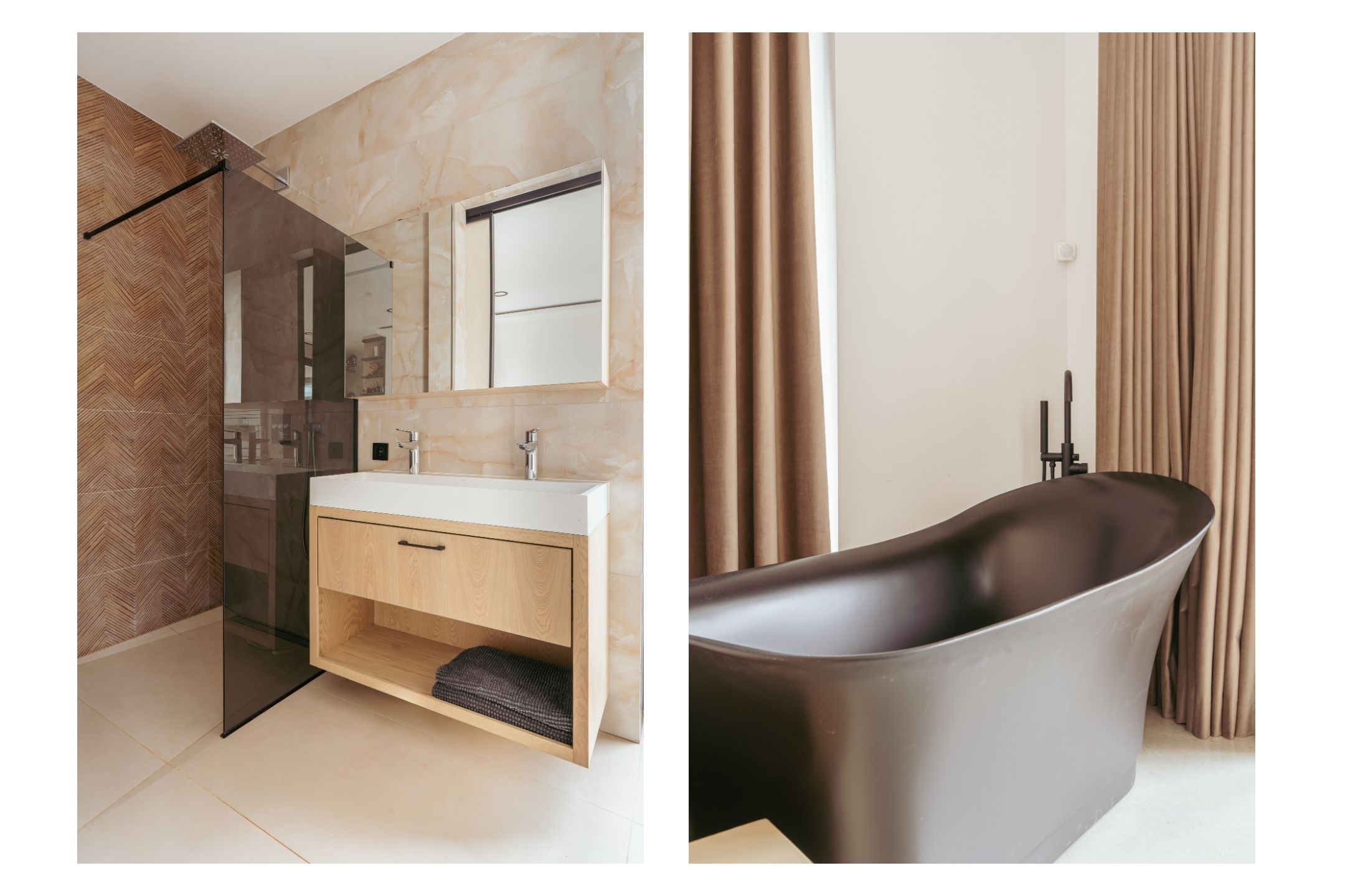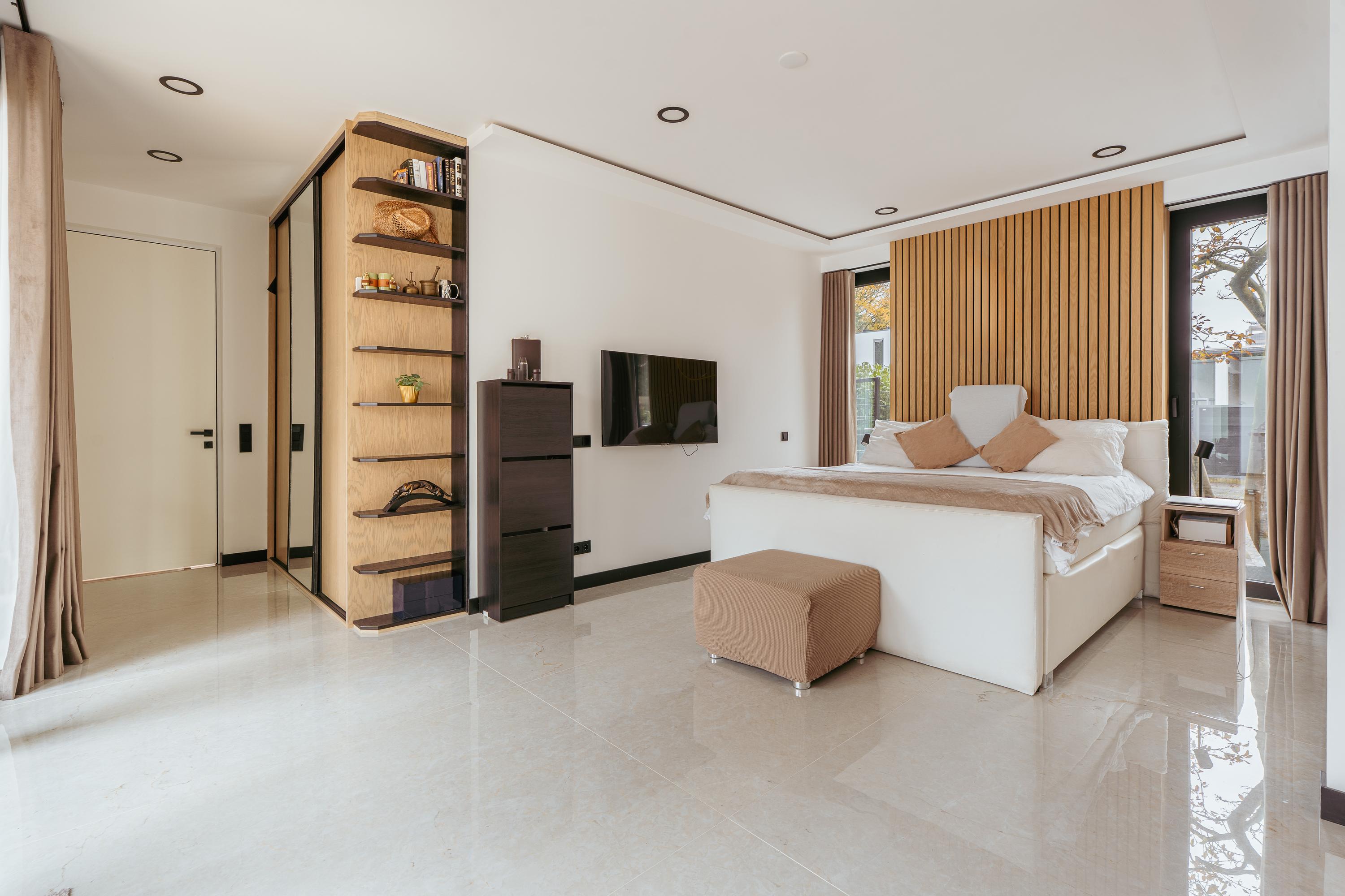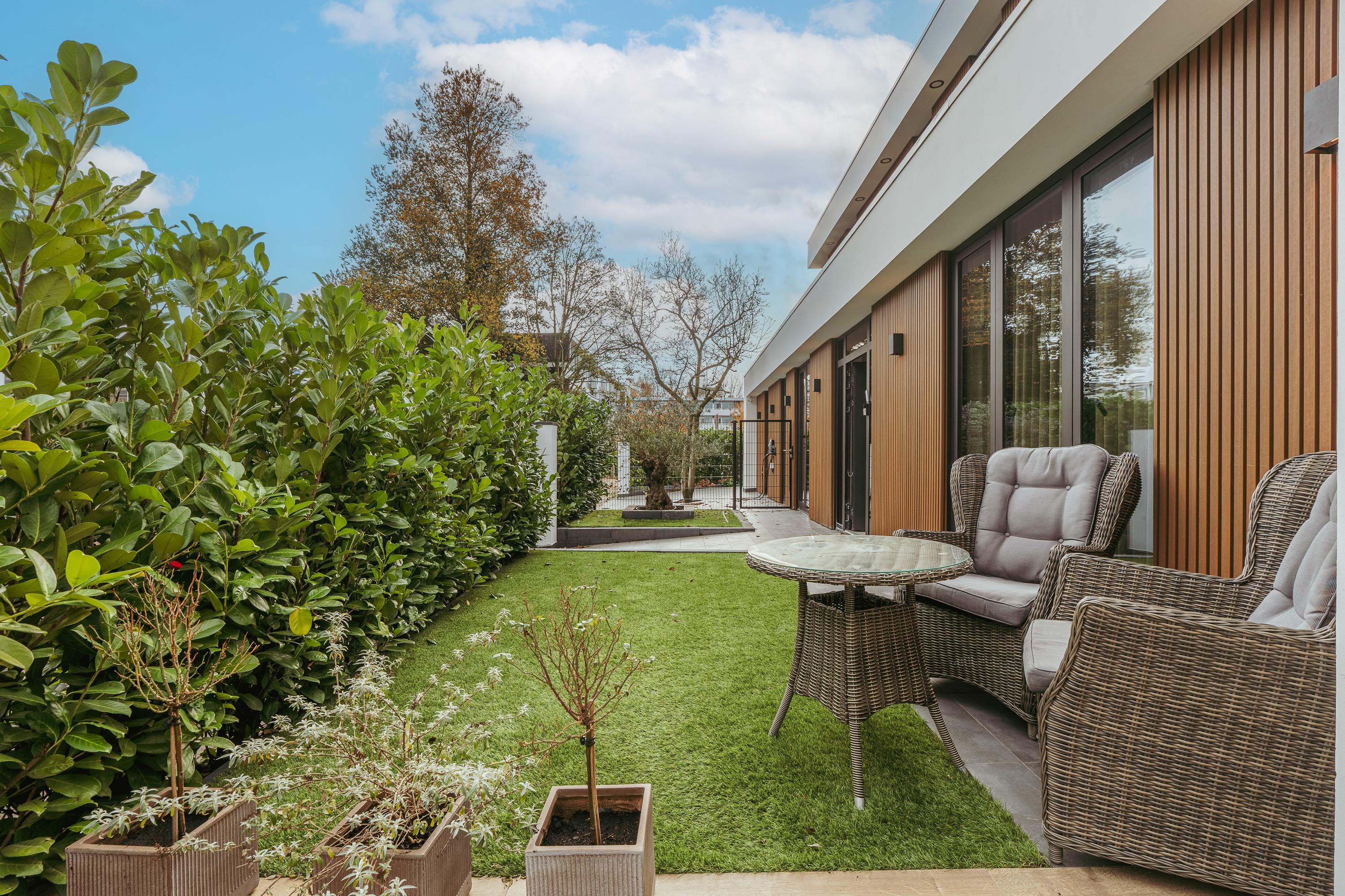 Also located on the ground floor is the impressive master bedroom with an en-suite bathroom. This high-end bathroom is fitted with a walk-in shower, double washbasin with vanity unit, and a toilet. The freestanding bathtub, positioned directly in the bedroom, adds to the luxurious, hotel-style feel. In addition, there is a comfortable guest suite, also with its own private bathroom featuring a washbasin with vanity unit, walk-in shower and toilet. A truly unique feature of this home is the fully self-contained additional living space on this floor, comprising a private living room with kitchen, bedroom and bathroom. This area is ideal for an au pair, live-in care, guests, or a home office. Furthermore, this floor offers a separate toilet, the meter cupboard, and several practical storage spaces. The beautifully landscaped garden is south-facing and includes a generous terrace with a fixed outdoor kitchen and barbecue, perfect for long summer evenings. At the rear of the garden, there is a detached garden house, which can easily be arranged as a home gym, hobby room or home office.