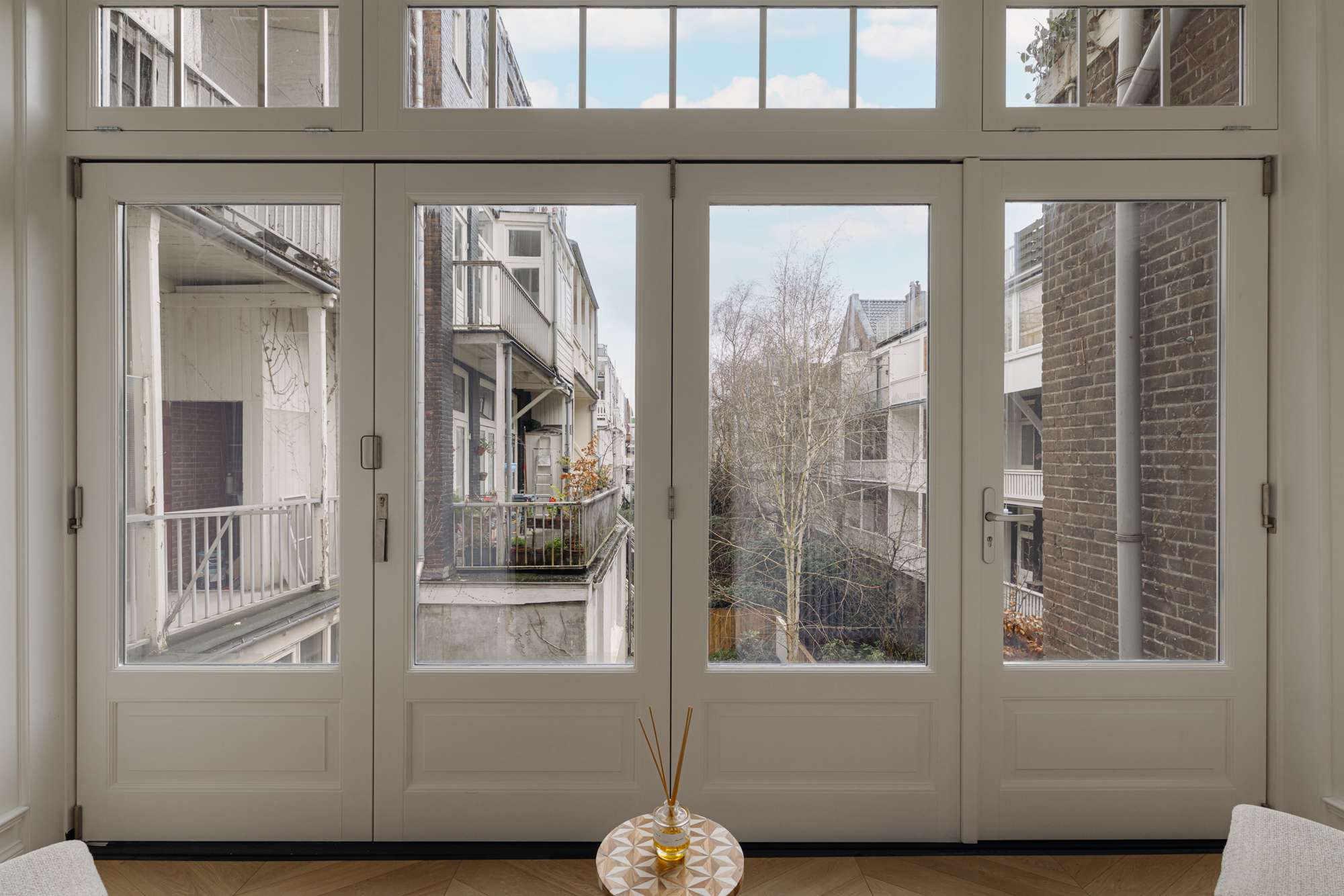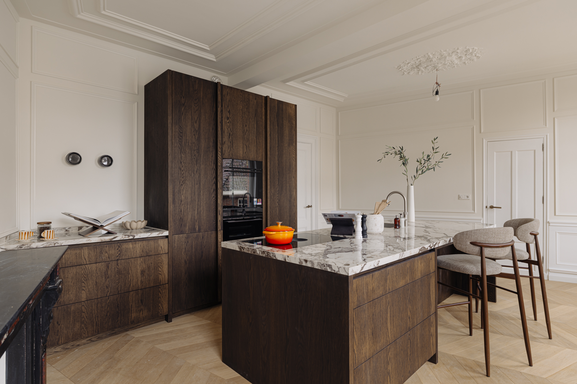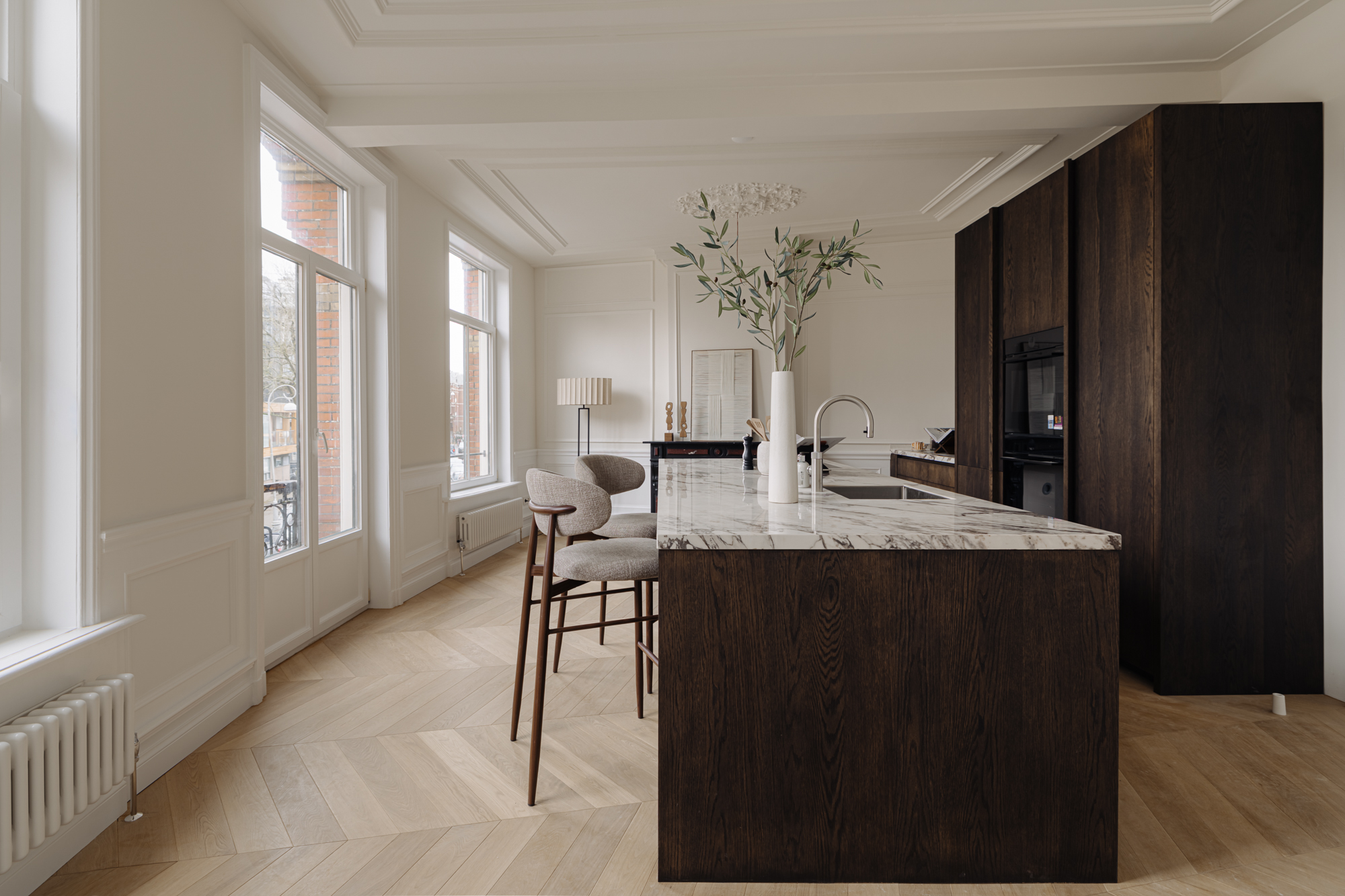 The monumental staircase leads to the landing of the first floor. At the rear is the classic dining room with access to a second internal balcony. This balcony features a folding glass façade, seamlessly connecting indoor and outdoor living. Thanks to its favourable position, you can enjoy the sun here well into the evening. At the front is the spacious kitchen-diner with cooking island—without doubt the centrepiece of the home. The kitchen is finished in beautiful dark oak and complemented by an elegant composite worktop. It is equipped with high-end Siemens StudioLine appliances, a Bora cooktop, and a Quooker tap. The island also features a welcoming bar area. With a width of nearly 7 metres and three large windows, the kitchen enjoys wonderful open views towards Jan Luijkenstraat. From both the kitchen and the landing, the fourth (bed)room can be accessed, which is ideal as a home office or study.