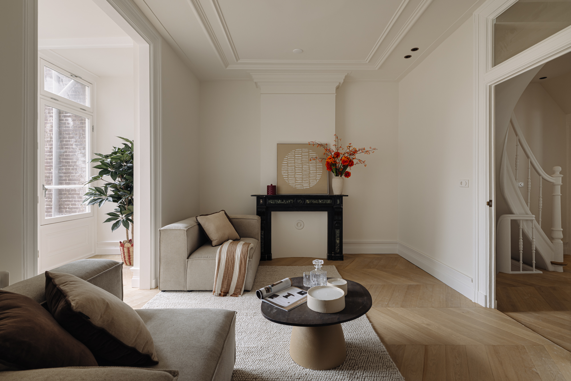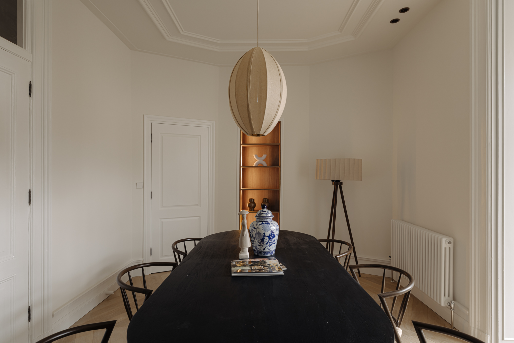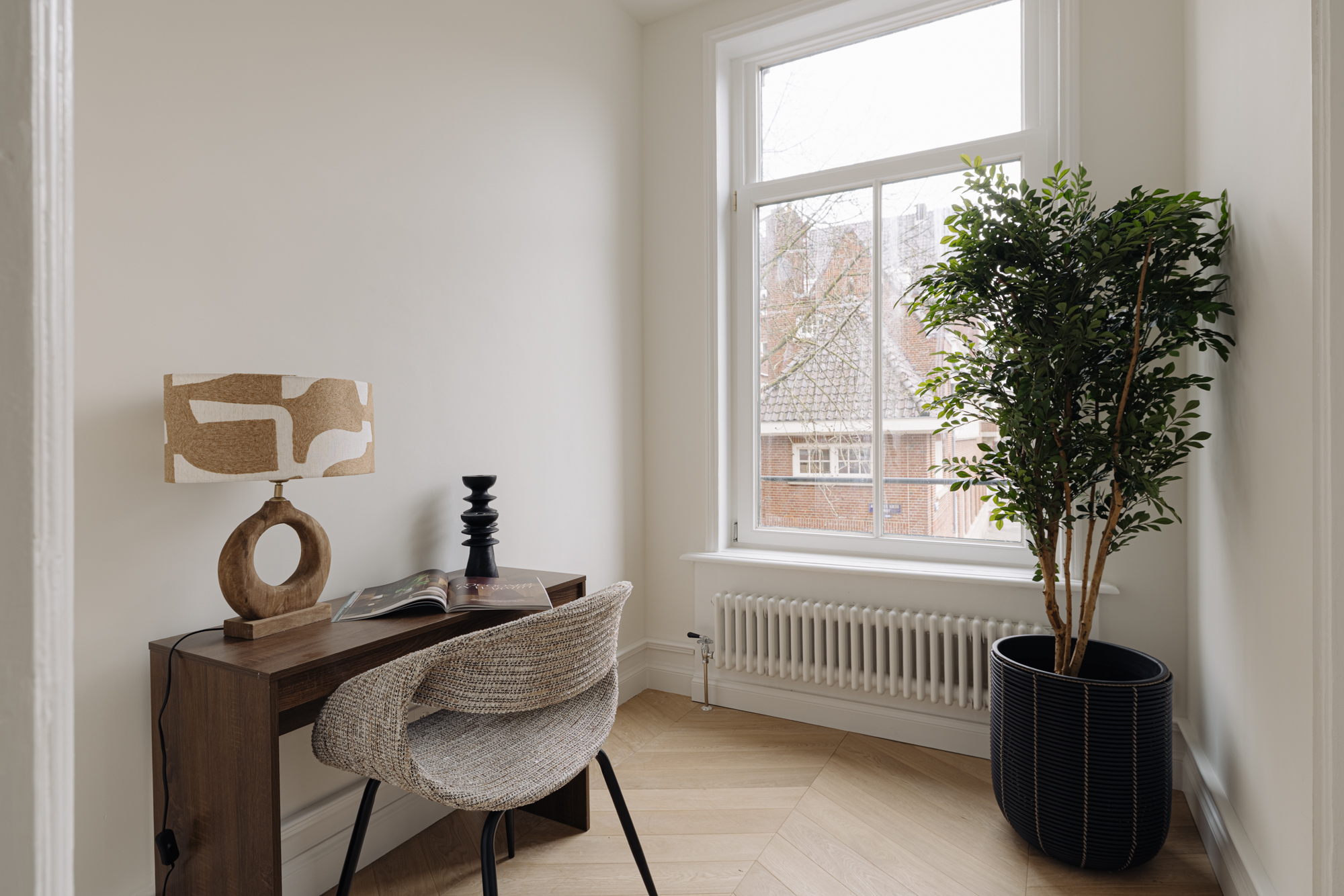 The monumental staircase leads to the landing of the first floor. At the rear is the classic dining room with access to a second internal balcony. This balcony features a folding glass façade, seamlessly connecting indoor and outdoor living. Thanks to its favourable position, you can enjoy the sun here well into the evening. At the front is the spacious kitchen-diner with cooking island—without doubt the centrepiece of the home. The kitchen is finished in beautiful dark oak and complemented by an elegant composite worktop. It is equipped with high-end Siemens StudioLine appliances, a Bora cooktop, and a Quooker tap. The island also features a welcoming bar area. With a width of nearly 7 metres and three large windows, the kitchen enjoys wonderful open views towards Jan Luijkenstraat. From both the kitchen and the landing, the fourth (bed)room can be accessed, which is ideal as a home office or study.