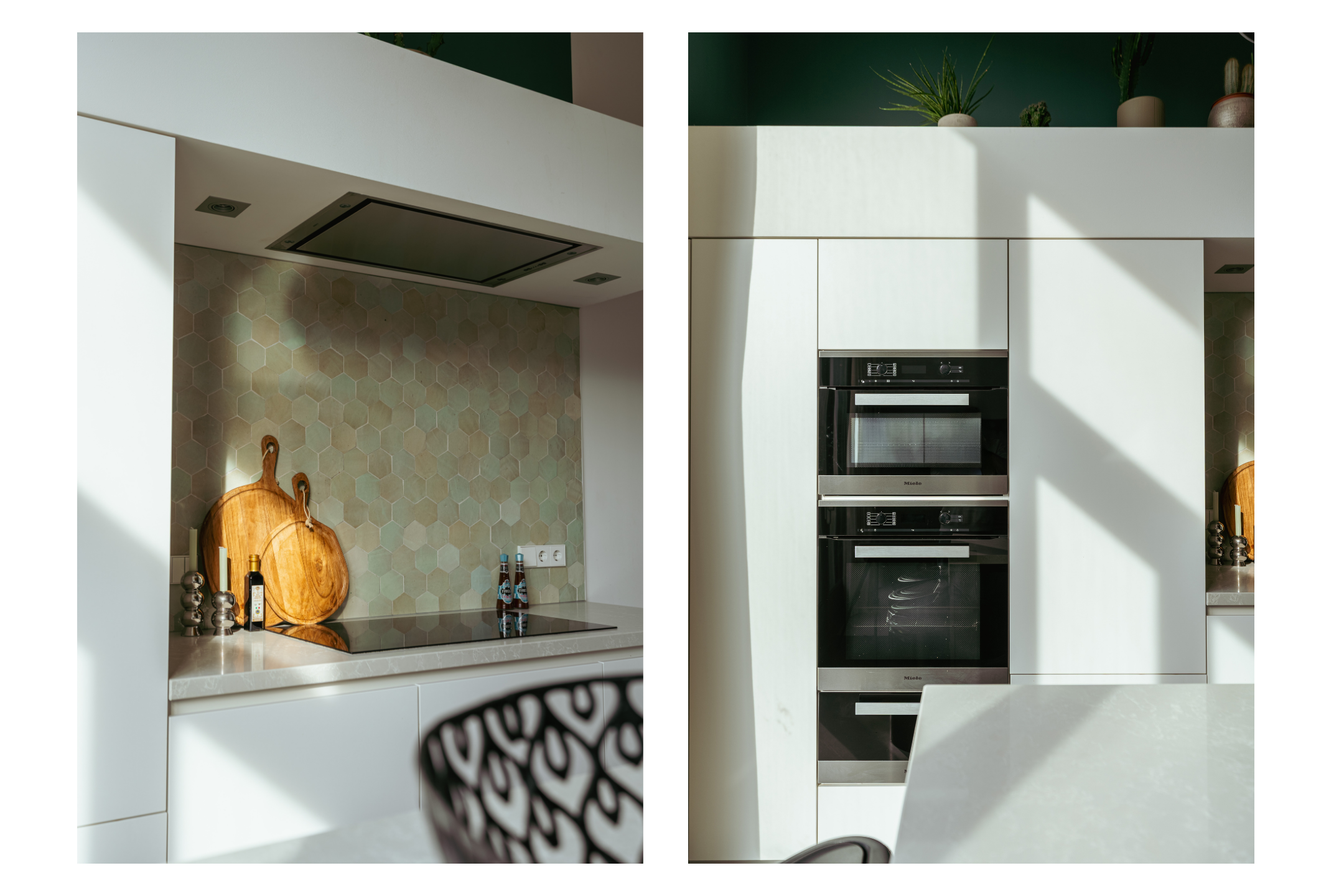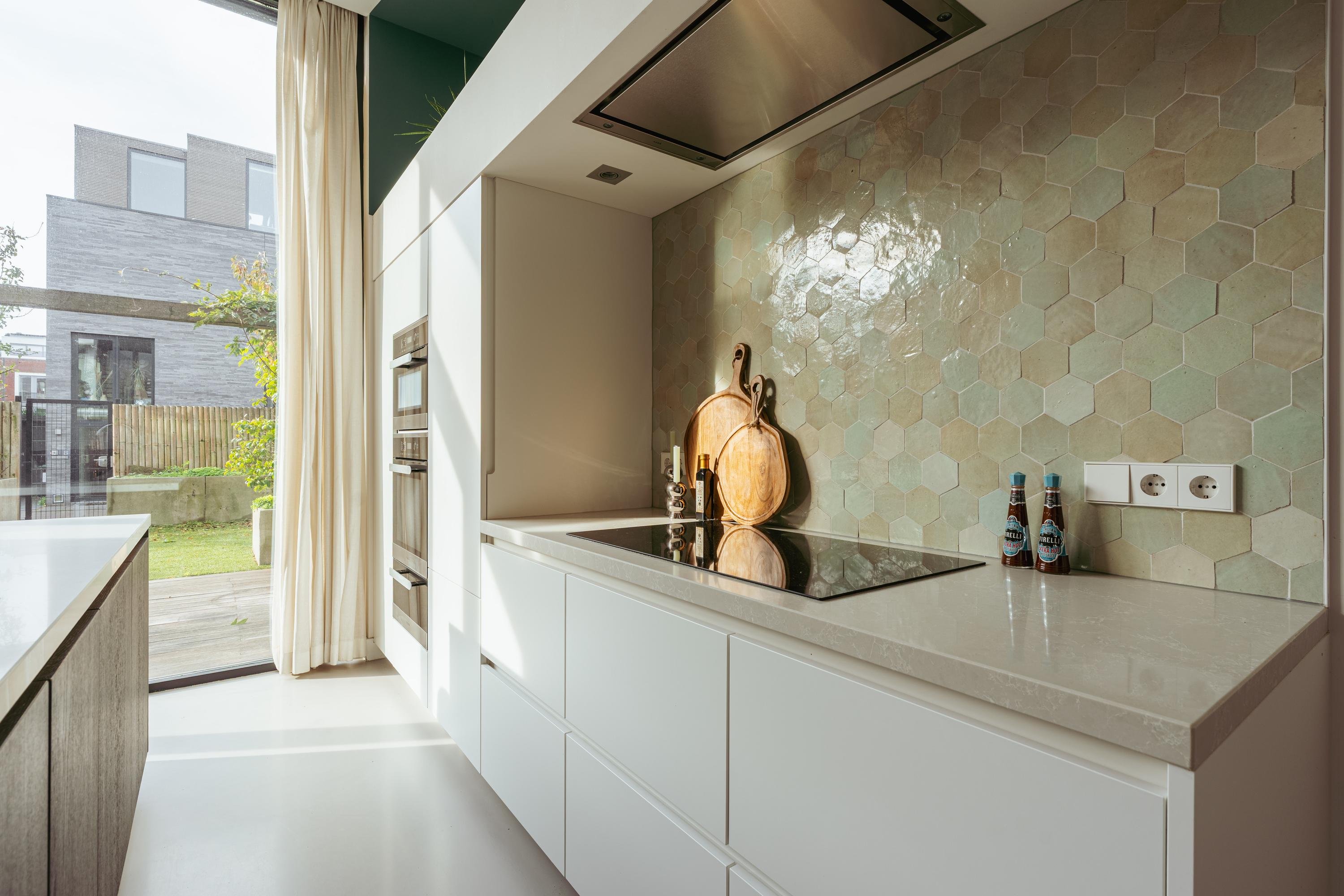 The custom-designed kitchen features a large cooking island with a composite worktop and premium built-in appliances, including a Quooker, induction cooktop, dishwasher, microwave, oven, and plate warmer. French doors open onto the beautifully landscaped, low-maintenance garden of approximately 54 m², with wooden decking, stone paving, and lush greenery. A private gate provides direct access to the back area with two private parking spaces equipped with an electric charging station.