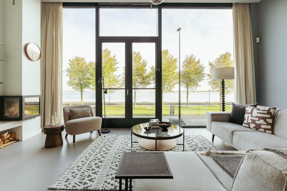 At the front of the house lies a very spacious bedroom, currently arranged as a stylish master suite. The full-width window offers spectacular panoramic views over the IJmeer, while the glass partition wall and soft, neutral color palette create a modern and airy atmosphere.