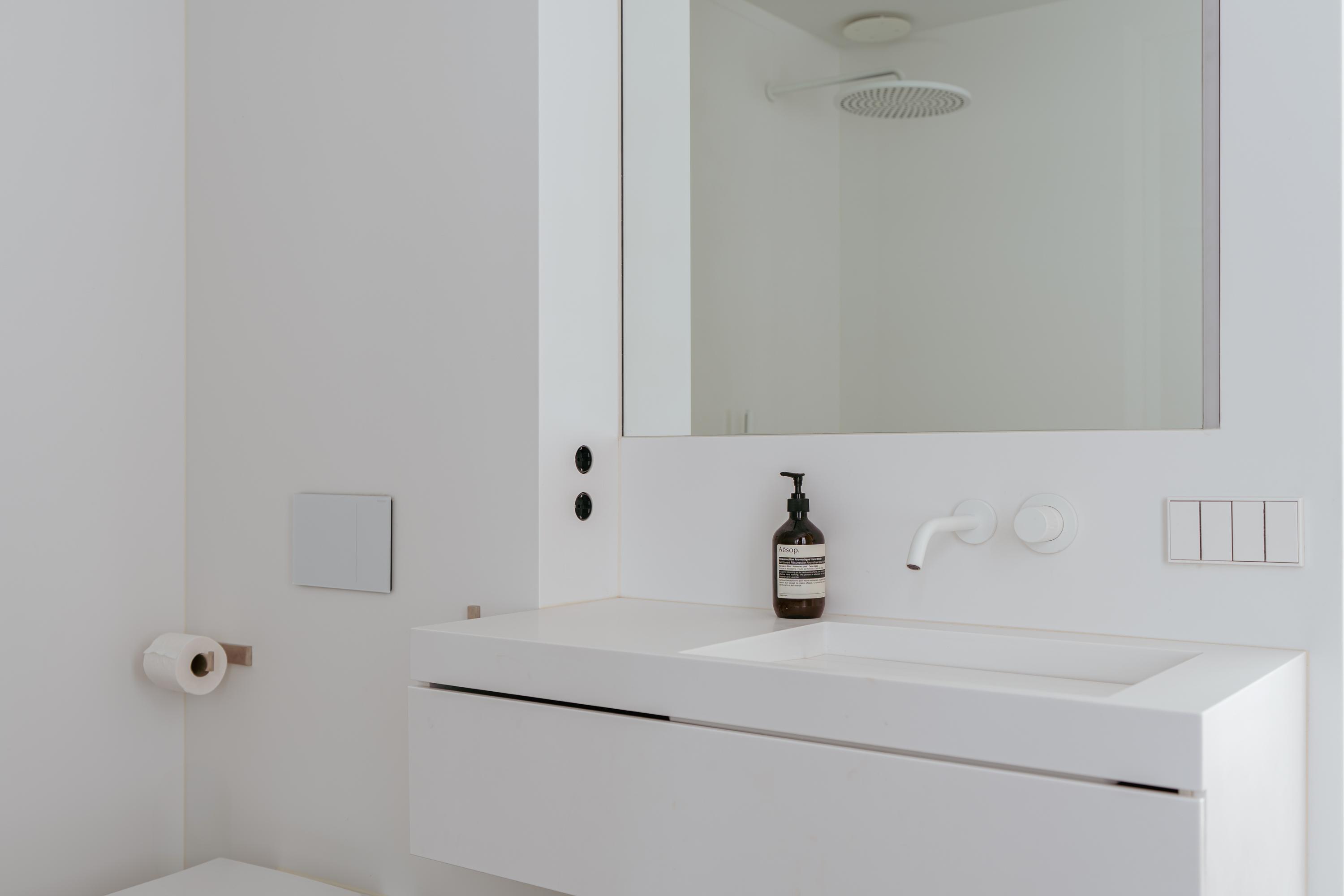 This upper floor is dedicated to a luxurious master suite — a private sanctuary of peace, space, and comfort. A central walk-in closet features custom cabinetry that is both functional and stylish. At the front is the cozy bedroom, where original ceiling beams and impressive ceiling height immediately draw the eye. Tall windows extending into the gable enhance the sense of openness and bring in wonderful natural light. Built-in wardrobes contribute to the clean, elegant look. At the rear lies the spectacular bathroom — a true wellness retreat at home. Here you’ll find a striking freestanding Agape Spoon Woodline bathtub, a double vanity with stylish cabinetry, a spacious walk-in shower, a steam cabin, and a built-in recliner for ultimate relaxation. The space is finished with warm materials and thoughtful design elements, including integrated lighting for a hotel-like atmosphere. Beautiful wooden sliding panels provide both shading and aesthetic appeal, offering privacy without blocking light. The toilet is separate from the bathroom.