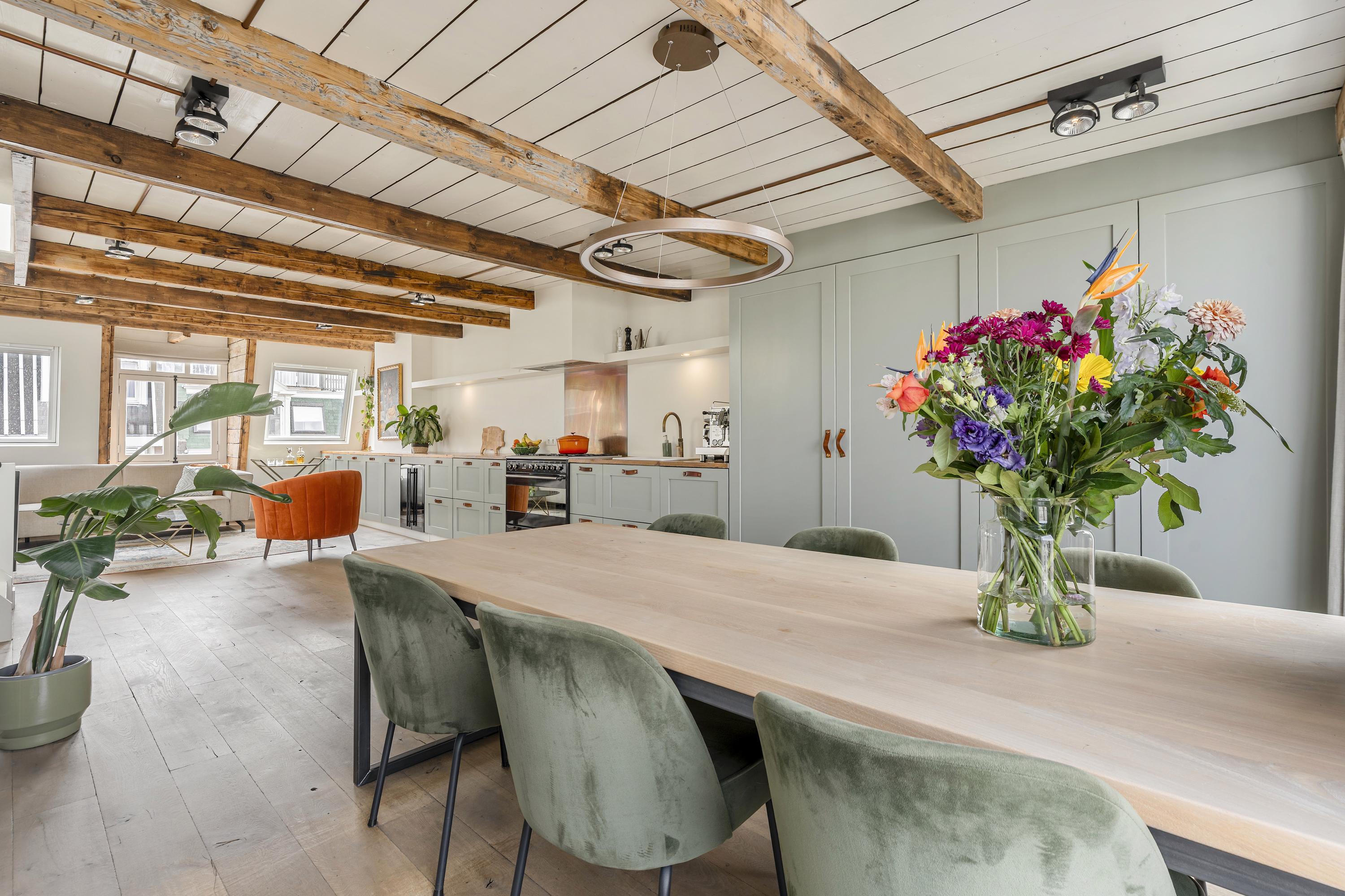 The living floor, situated on the fourth level, features a spacious and bright living room with an open-plan kitchen. The space is characterized by charming wooden beams, adding warmth and character. Large windows at both the front and rear, combined with natural light from the rooftop terrace, ensure a pleasant flow of daylight throughout the day. The open kitchen spans the full width of the wall and offers ample storage space. It is equipped with a six-burner gas stove, extractor hood, oven, dishwasher, sink with Quooker, refrigerator, freezer, and a wine climate cabinet. This floor also includes a separate toilet with double doors. From the living room, there is direct access to the west-facing balcony at the rear. A fixed staircase leads to the stunning rooftop terrace. This generous outdoor space offers complete privacy and enjoys 360-degree sun exposure, making it the perfect place to relax throughout the day. With ample room for multiple seating and lounge areas, the terrace is a true highlight of the property.