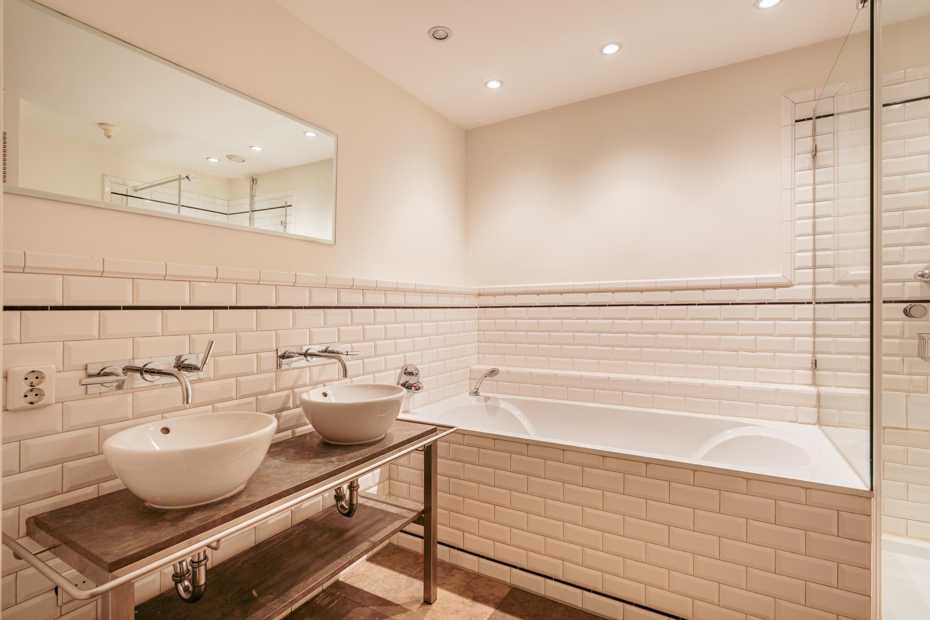 Via the communal staircase you reach the entrance of the apartment on the second floor. You are welcomed into a spacious hallway that provides access to nearly all rooms. At the front of the property lies the generous living room, which, together with the adjoining kitchen, is distinguished by no fewer than five large south-facing windows. This continuous expanse of glazing allows for exceptional natural light and offers a beautiful, wide view over the Egelantiersgracht a rare feature in this part of the Jordaan. The atmospheric gas fireplace serves as a warm focal point, enhancing the inviting character of the living area. The kitchen, also located at the front, features a convivial bar and is equipped with a dishwasher, Quooker tap, sink, oven, microwave, refrigerator, freezer, and ample storage space. It is a practical and welcoming environment for those who enjoy cooking and entertaining. At the quiet rear of the apartment are two well-sized bedrooms of similar dimensions. The larger bedroom includes three built-in wardrobes, and both rooms benefit from pleasant daylight and peaceful views. Centrally positioned in the apartment is the bathroom, fitted with a bathtub, separate shower, and double washbasin with cabinet. The separate toilet is accessed from the hallway. The apartment further offers a practical storage space that accommodates the washing machine and dryer connections.