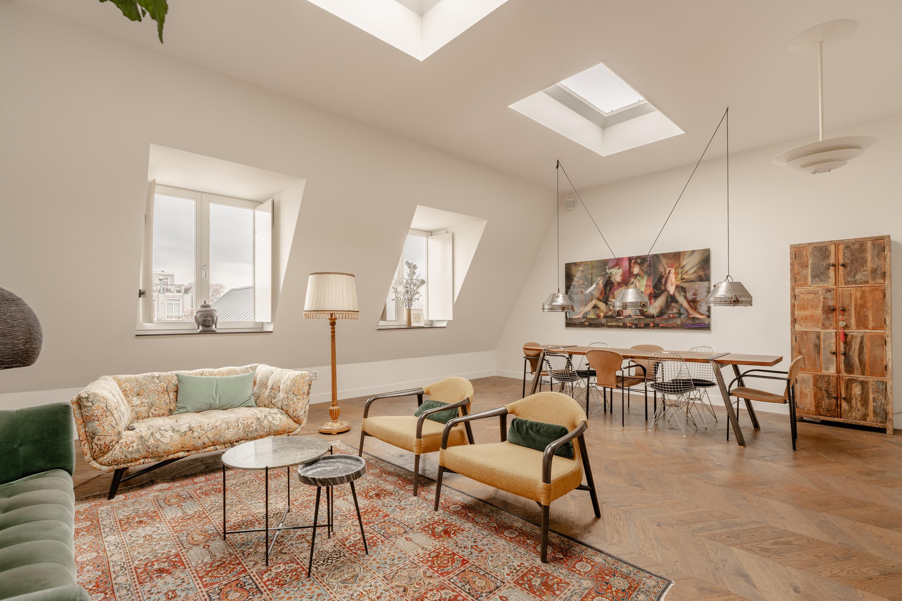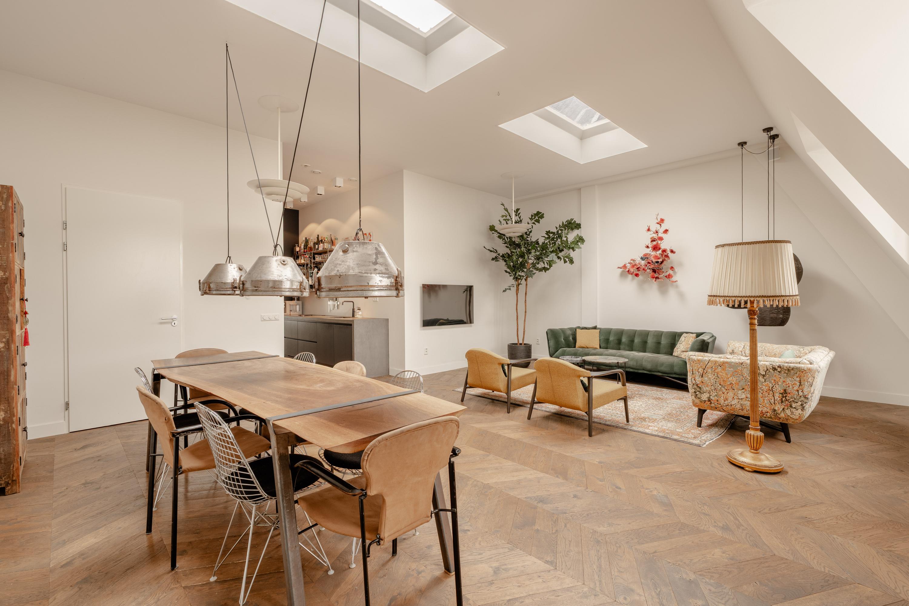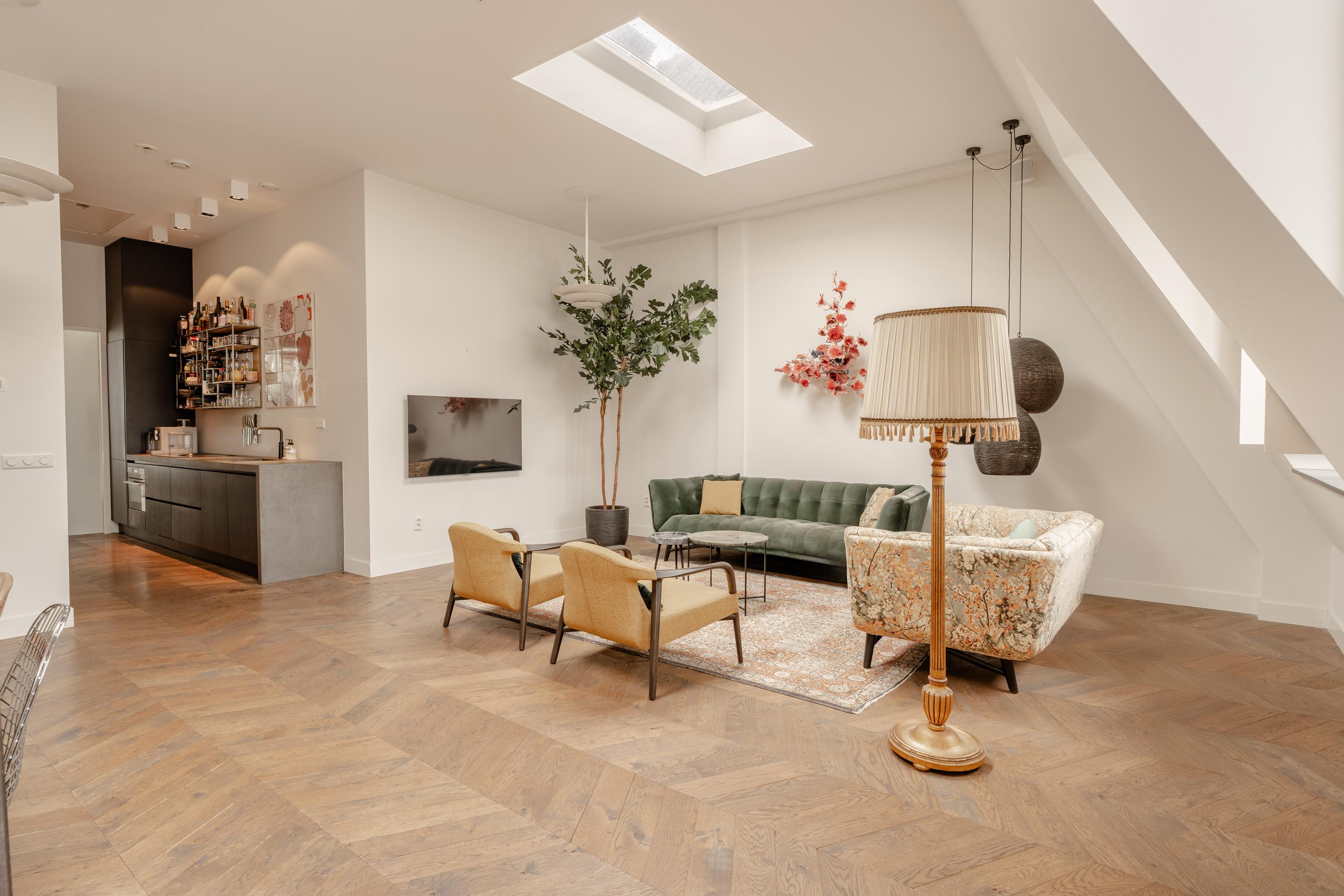 The third floor forms the main living level of the apartment. Here you will find the spacious and bright living room with open kitchen located at the front of the apartment. Thanks to the impressive ceiling height and multiple skylights, the space enjoys abundant daylight, creating an open and airy atmosphere. The wooden floor and clean finishes contribute to the warm and modern appearance.