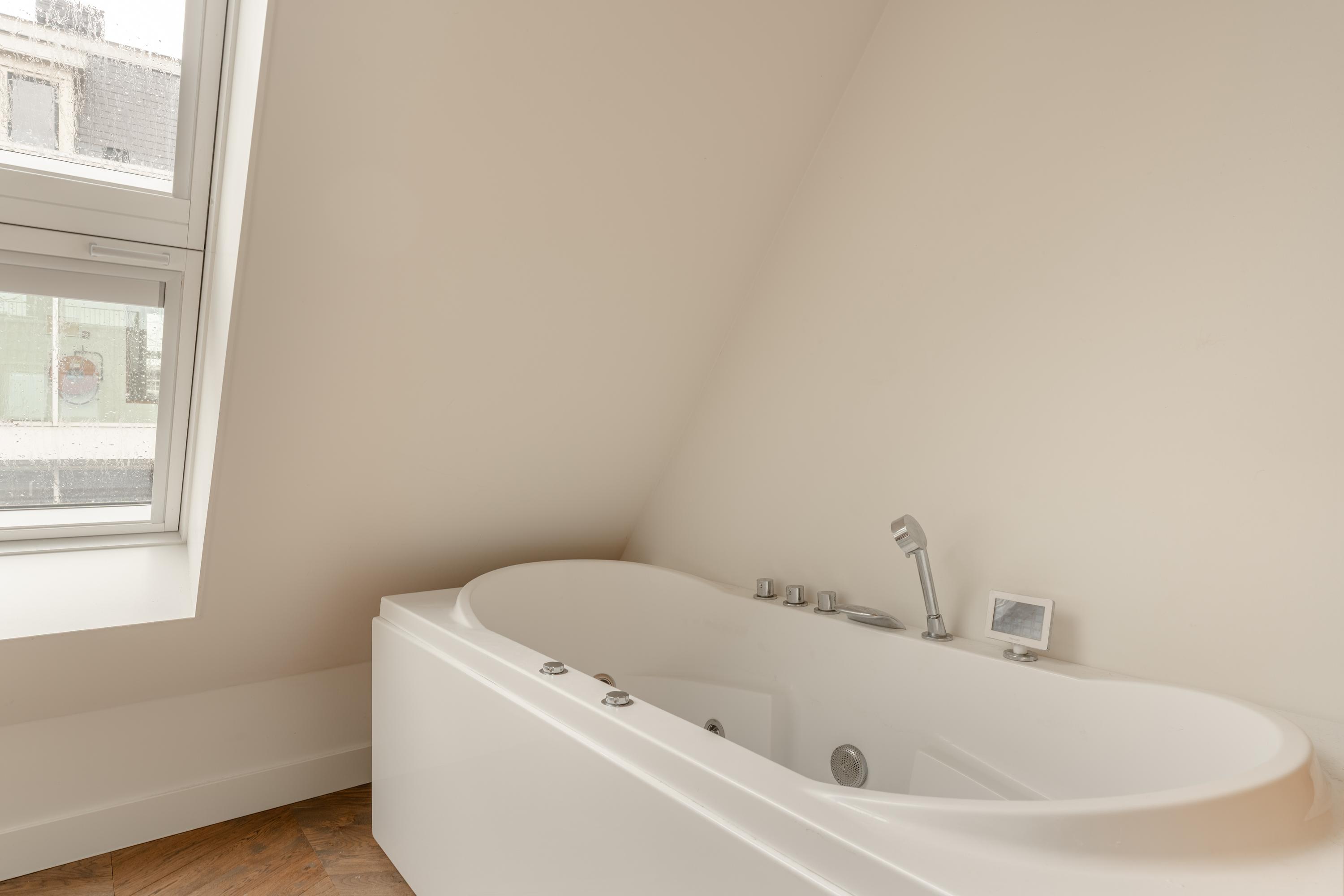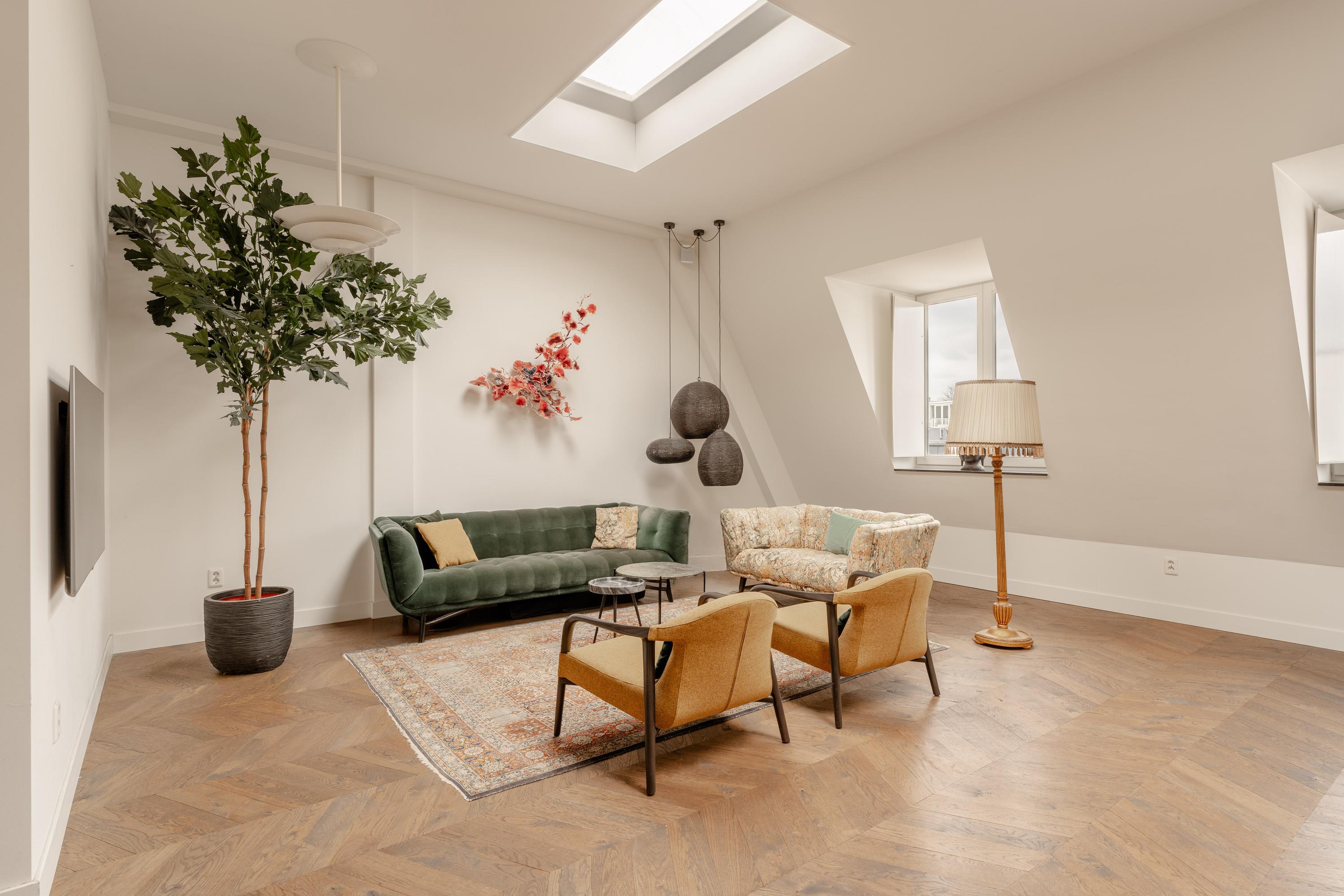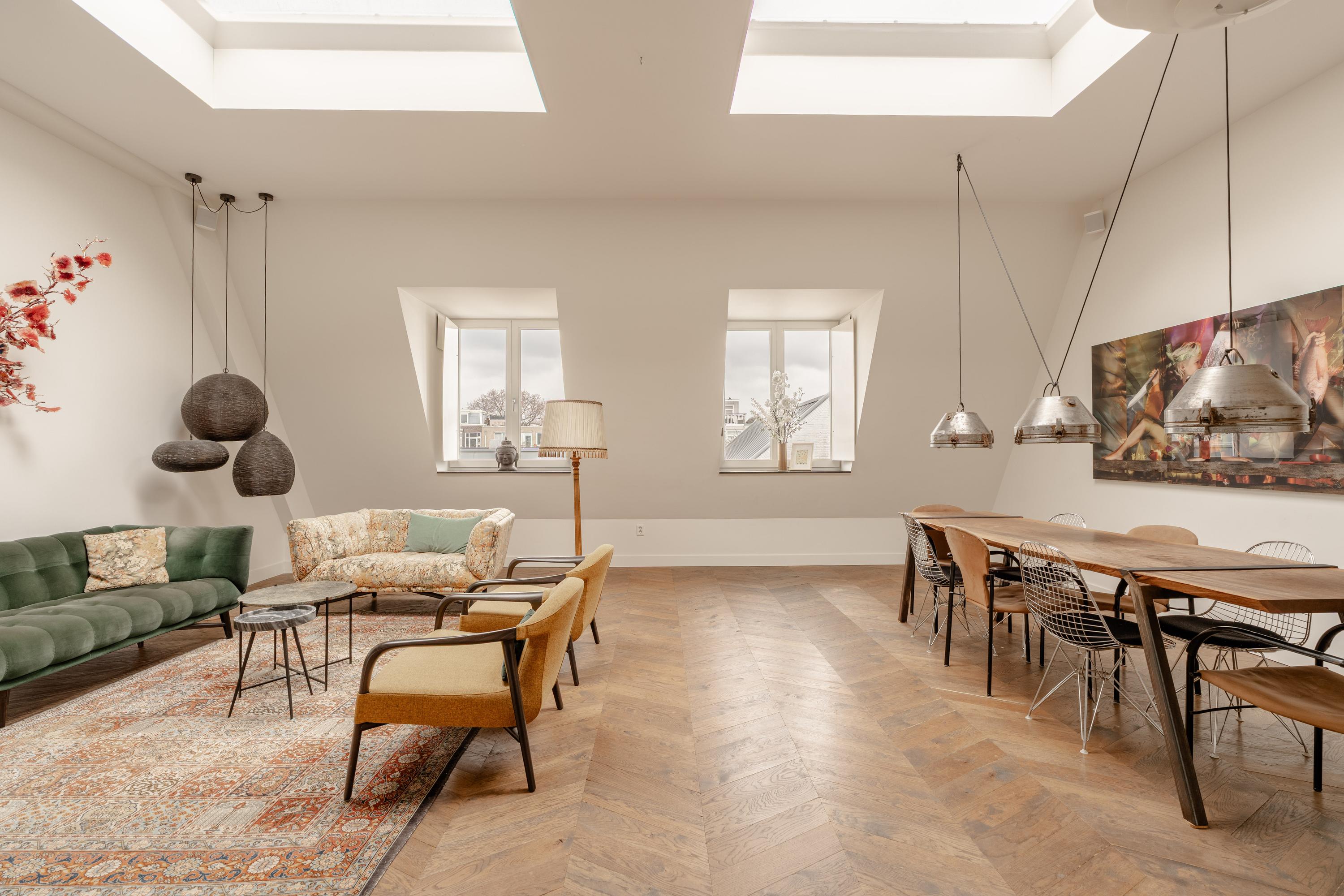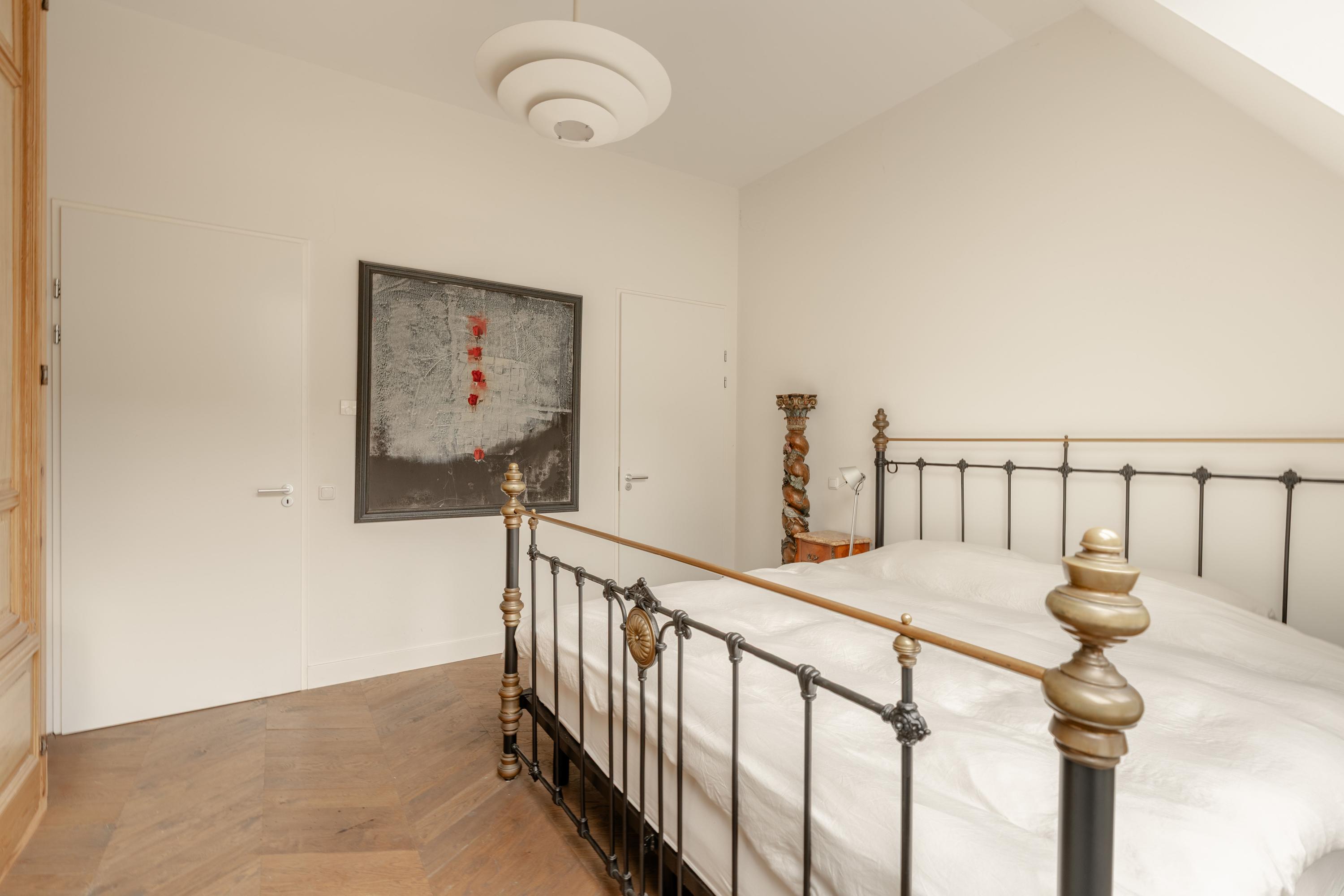 The third floor forms the main living level of the apartment. Here you will find the spacious and bright living room with open kitchen located at the front of the apartment. Thanks to the impressive ceiling height and multiple skylights, the space enjoys abundant daylight, creating an open and airy atmosphere. The wooden floor and clean finishes contribute to the warm and modern appearance.