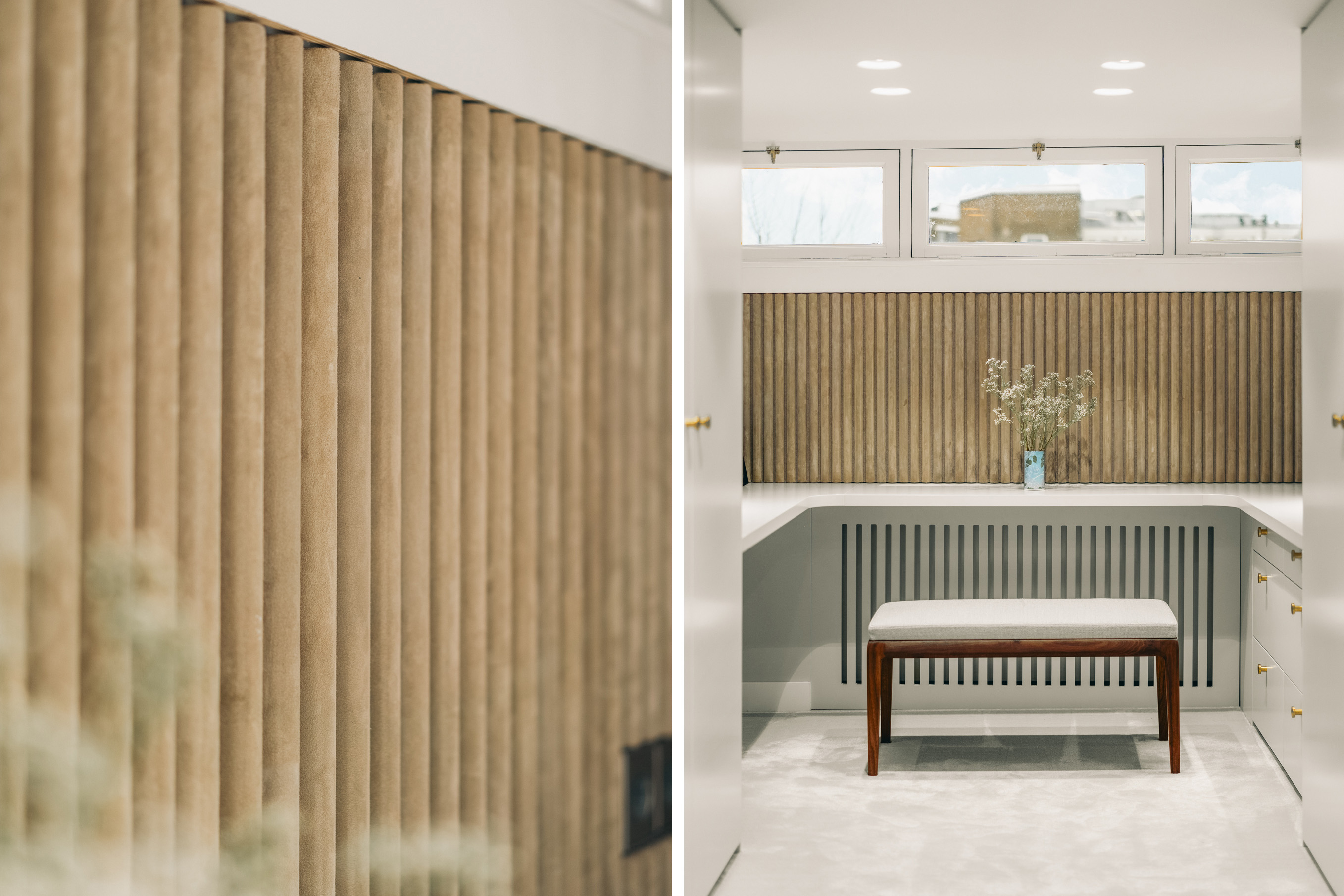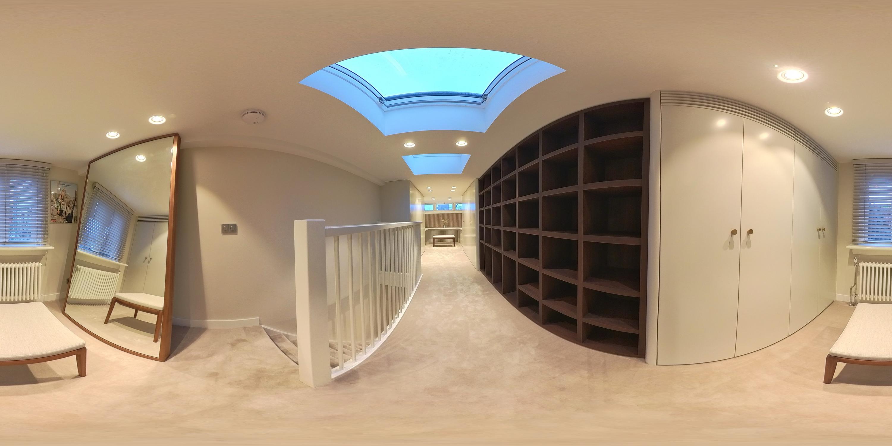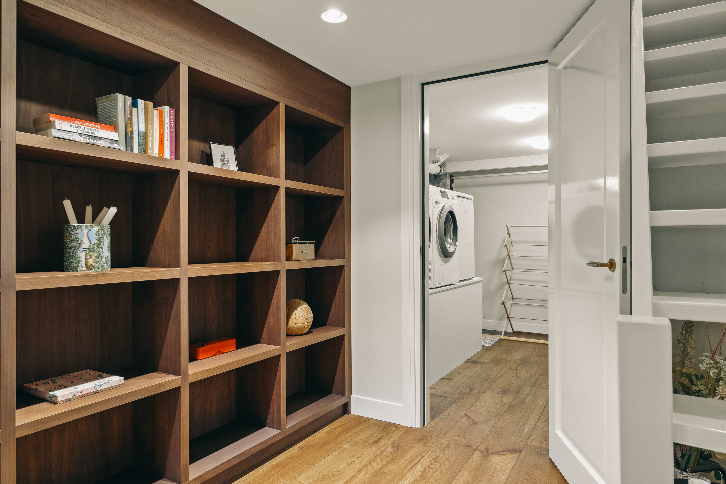 Below, the souterrain offers a tranquil living area with tailored storage in rich wood, alongside a spacious utility room equipped for practical daily needs. Ascending, the first floor presents an elegant salon marked by broad windows and a walnut-veneered wall for display or work. The top floors reveal a spacious bedroom, a bathroom finished in travertine with underfloor heating, and a dedicated dressing room lit by a skylight and cooled by air conditioning.
