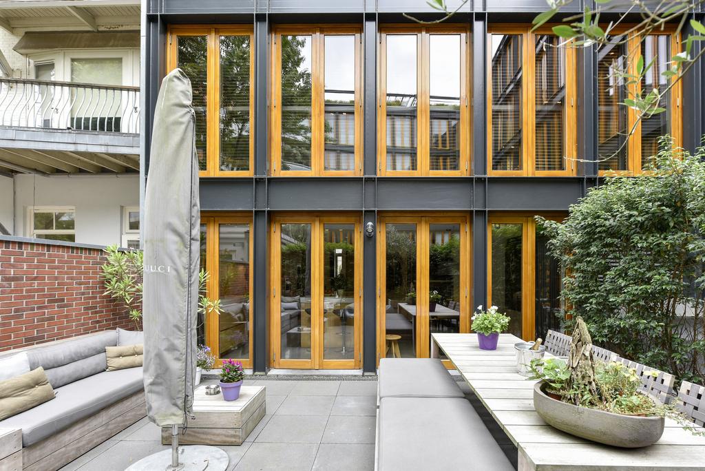 This block was designed and finally completed in 2012, with an eye for detail and quality. The design provided for extra high ceilings and the use of predominantly glass in the façades on the garden side. The apartments are light, airy and spacious. The current owners finished off the apartment’s interior with a great deal of taste and an eye for detail which may be seen in the sturdy materials such as the herringbone pattern floors and the steel surrounds to the internal framing for doors and windows. Lots of details are repeated throughout the apartment. This apartment has a floor area of 135 m² and a garden of 41 m².