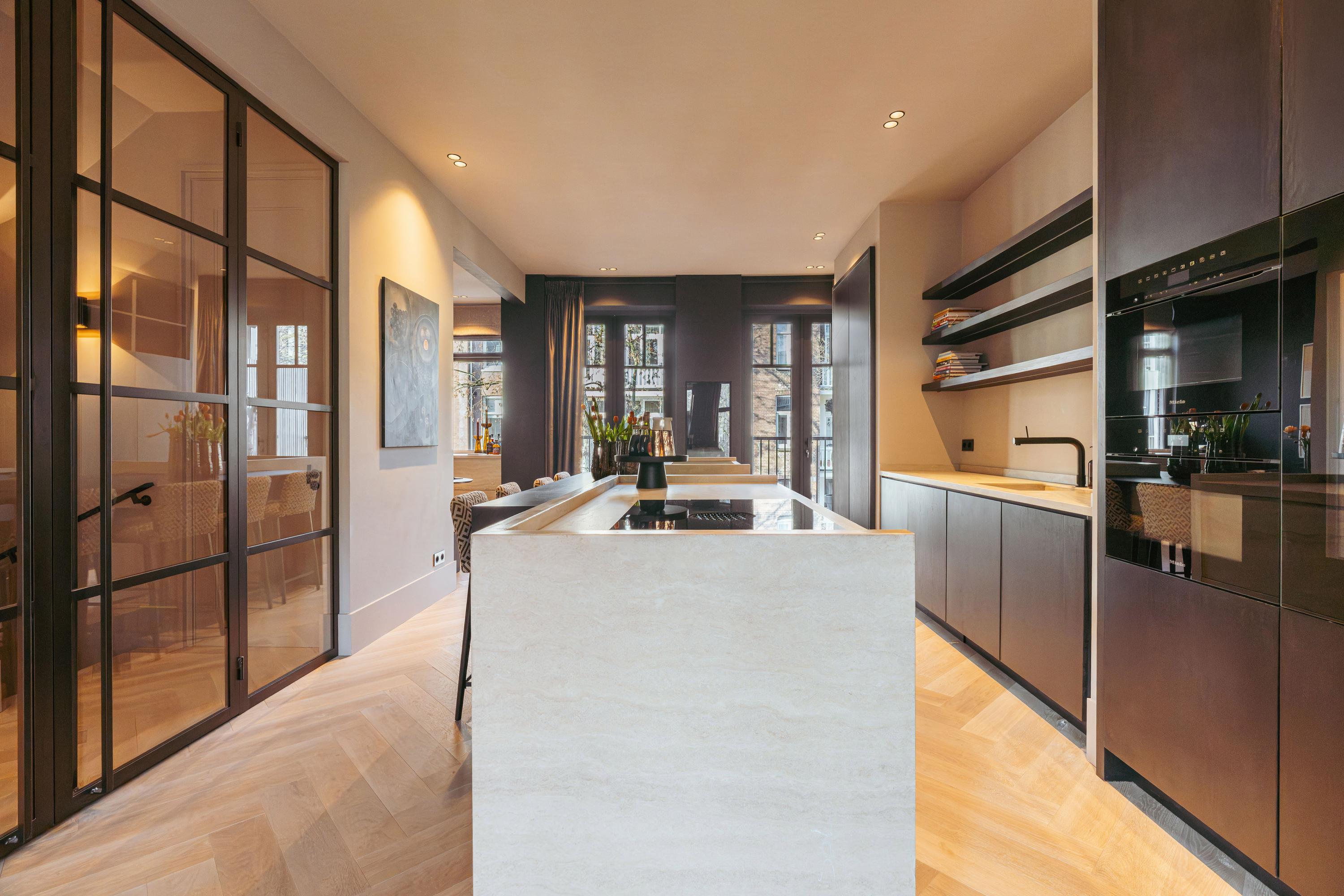 The kitchen-diner is the absolute centerpiece and connecting element of this floor. This generous space has been designed for both everyday comfort and refined dining experiences. The large kitchen island features a double induction hob with integrated extraction and is elegantly combined with a built-in dining and bar area. The handleless custom cabinetry houses high-end built-in appliances, including a refrigerator, freezer, dishwasher, double Miele oven and a wine climate cabinet. At the rear you will find a more intimate sitting or dining area, perfect for dinners or as a cozy coffee and bar corner. Two sets of French doors provide access to the deep and beautifully landscaped balcony at the quiet rear, overlooking the inner gardens.