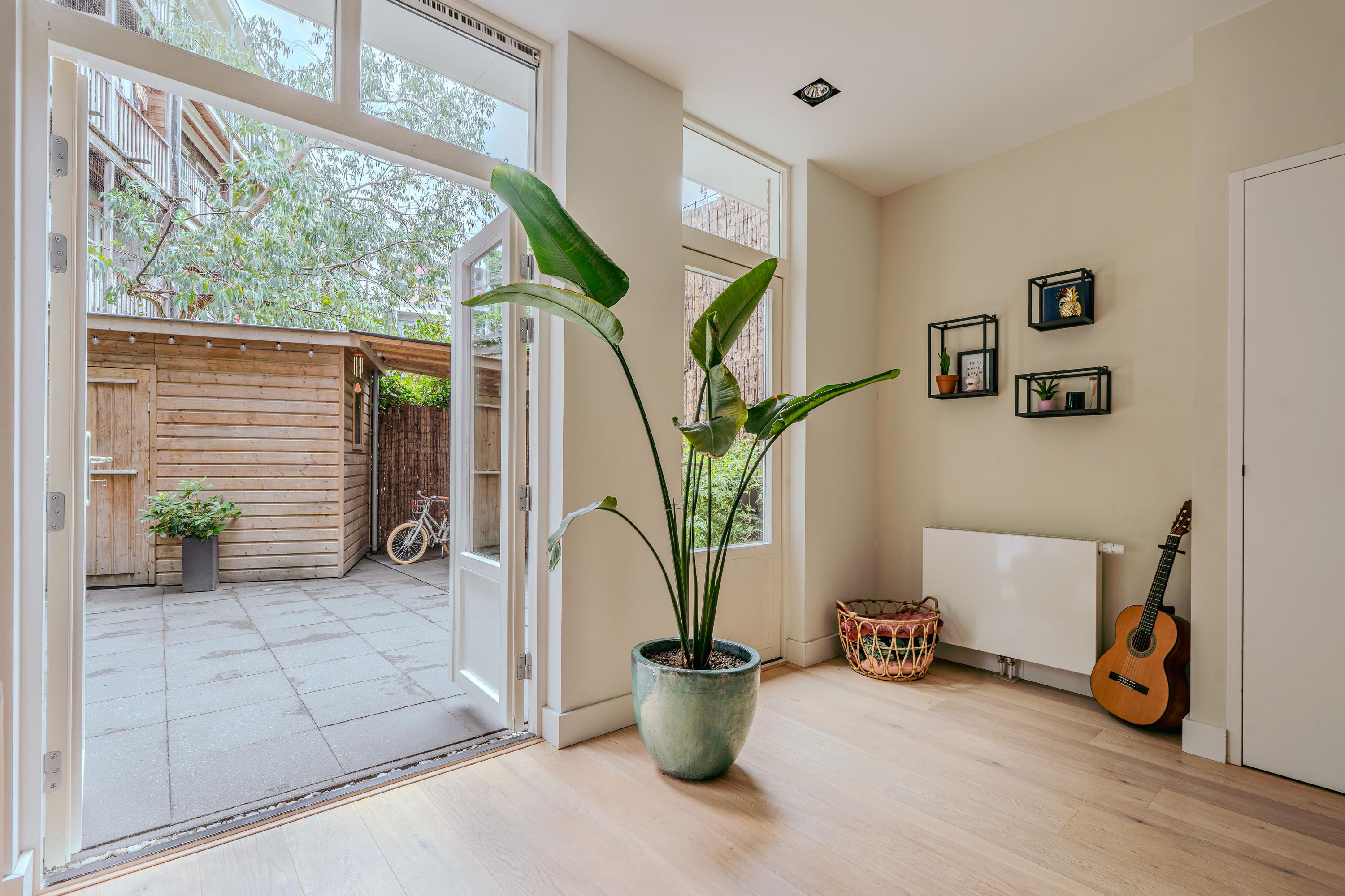Via de hal bereikt u de ruime en lichte woonkamer, evenals de eerste goed bemeten slaapkamer aan de voorzijde van de woning. In de hal bevinden zich bovendien praktische inbouwkasten voor extra bergruimte. De woonkamer strekt zich uit tot aan de achterzijde van het appartement en profiteert van een prachtige lichtinval, mede dankzij de 2,5 meter diepe uitbouw, de grote raampartijen en de openslaande deuren naar de tuin. Indien gewenst kan hier eenvoudig een derde slaapkamer worden gerealiseerd. De zonnige achtertuin van circa 38 m² is gelegen op het zuiden en biedt uitzonderlijk veel privacy. Bovendien beschikt de tuin over een handige schuur met overkapping, ideaal voor extra opslag of fietsen. De moderne open keuken vormt het hart van de woning en is uitgerust met een 5-pits gasfornuis met afzuigkap, combi-oven, vaatwasser, koel-vriescombinatie, een extra vriezer, een Quooker en tot slot plintverwarming. Tevens beschikt de keuken over een karakteristiek eiland waaraan je gezellig hoog zit. Ook de wasmachine en droger zijn fraai weggewerkt achter een kast. De tweede royale slaapkamer bevindt zich eveneens aan de voorzijde en biedt voldoende ruimte voor een king-size bed en een ruime kastenwand. Centraal in het appartement treft u de stijlvolle badkamer, voorzien van een ligbad, dubbele wastafel met meubel en een inloopdouche. Aangrenzend bevindt zich nog een separaat toilet met fonteintje.