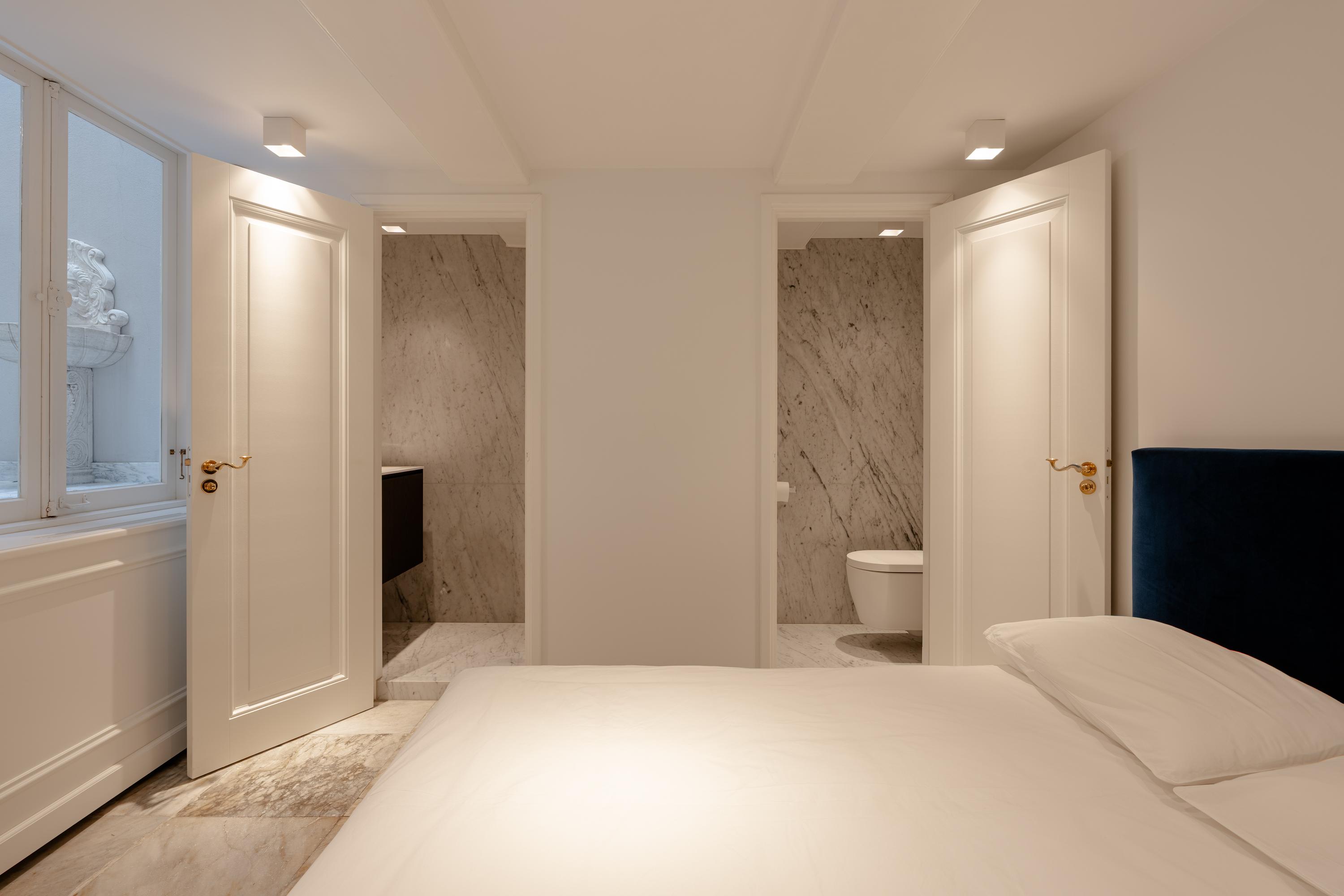 De tweede verdieping is ingericht als een comfortabele en luxueuze privésuite. Aan de achterzijde bevindt zich de badkamer, volledig uitgevoerd in Carrara marmer en voorzien van een strak badkamermeubel, inloopdouche, vloerverwarming, mechanische ventilatie en een separaat toilet.