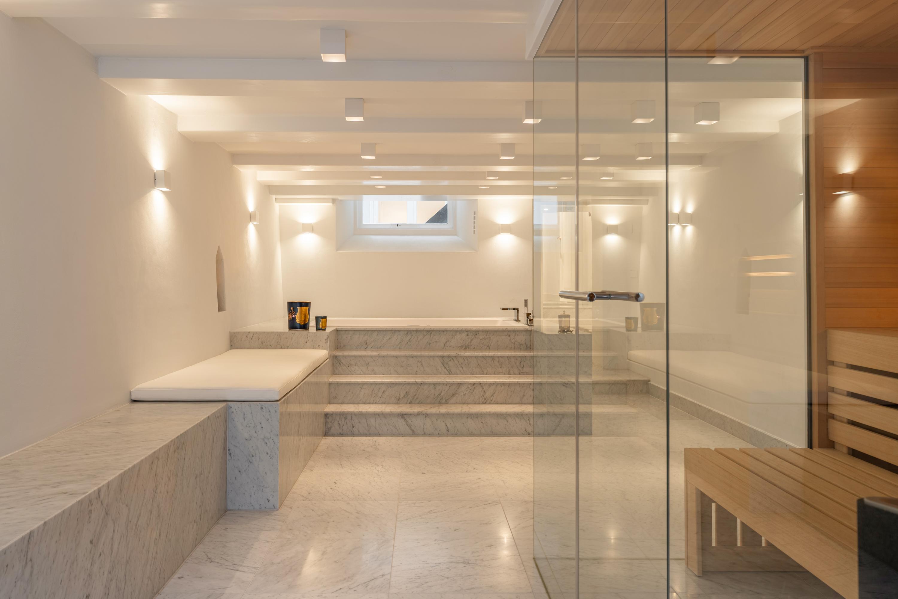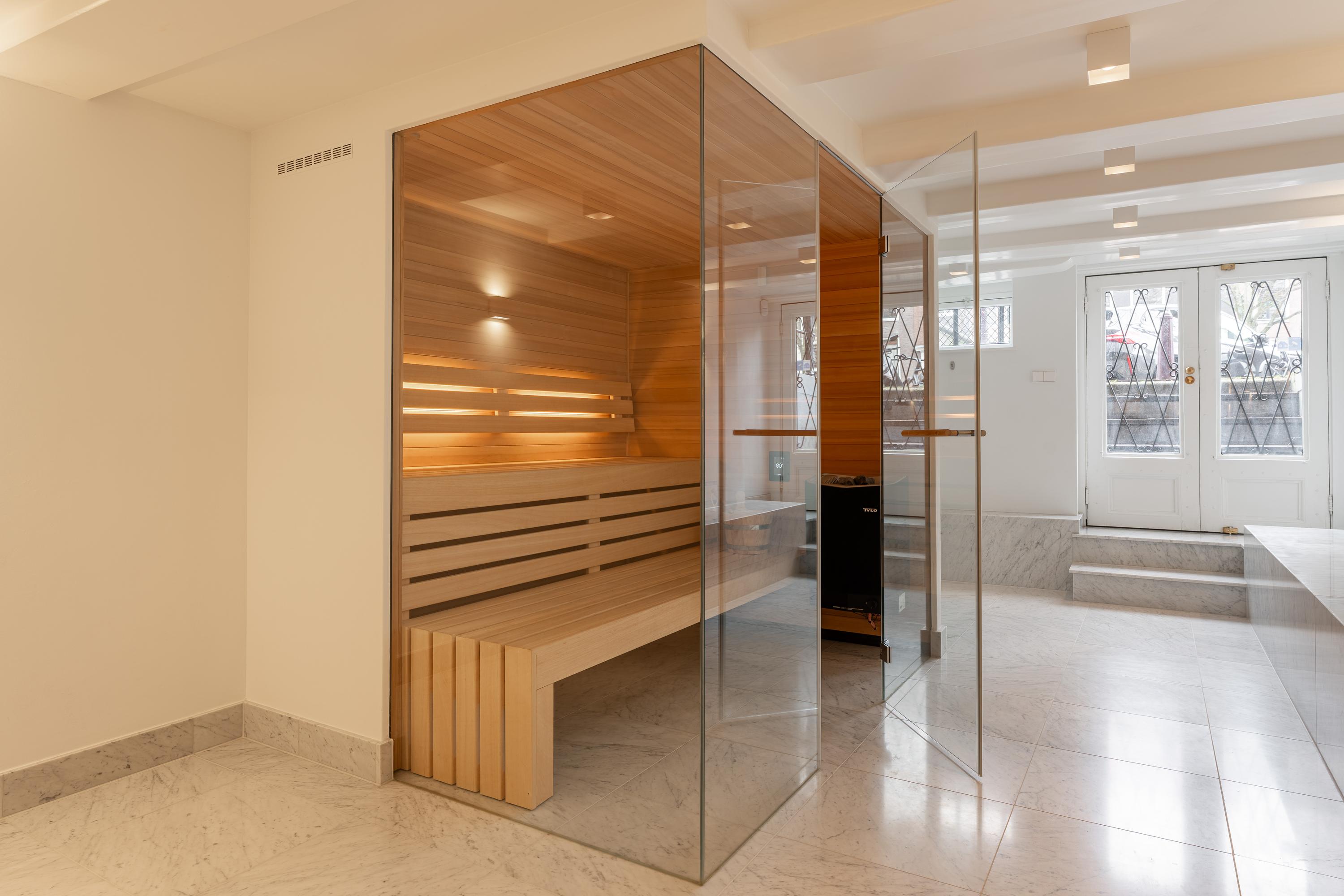 Aan de voorzijde bevindt zich een exclusieve wellnessruimte met jacuzzi en luxe sauna. De combinatie van marmer, hout en zorgvuldig afgestemde verlichting creëert hier een serene, spa-achtige ambiance.