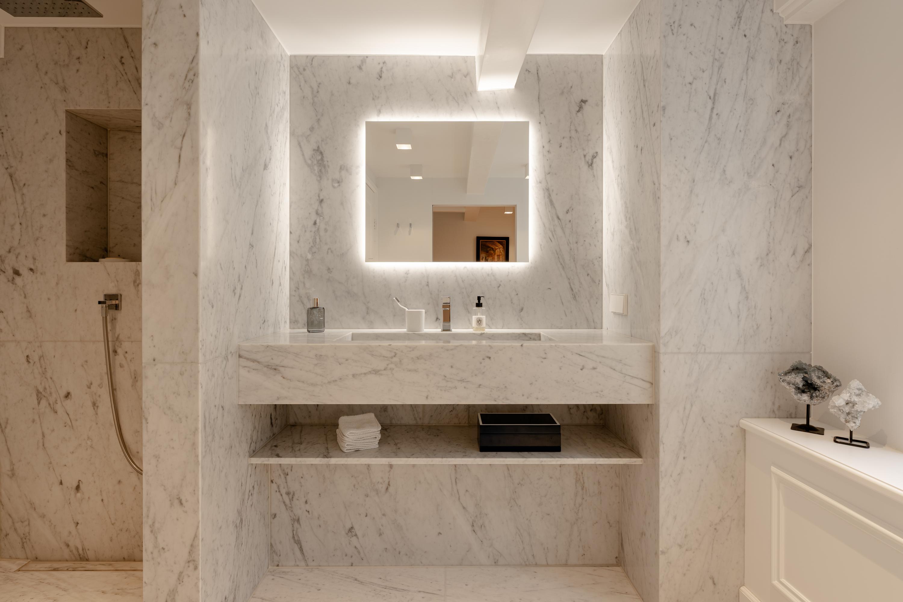 Het souterrain vormt een volwaardige woonlaag waarin luxe, comfort en ontspanning centraal staan. Een zeldzame wellnesservaring in het hart van de Amsterdamse grachtengordel. Deze verdieping is afgewerkt met Carrara marmer van Jan Reek (Italië), toegepast in alle badkamers en de wellnessruimte, en straalt rust en exclusiviteit uit.
