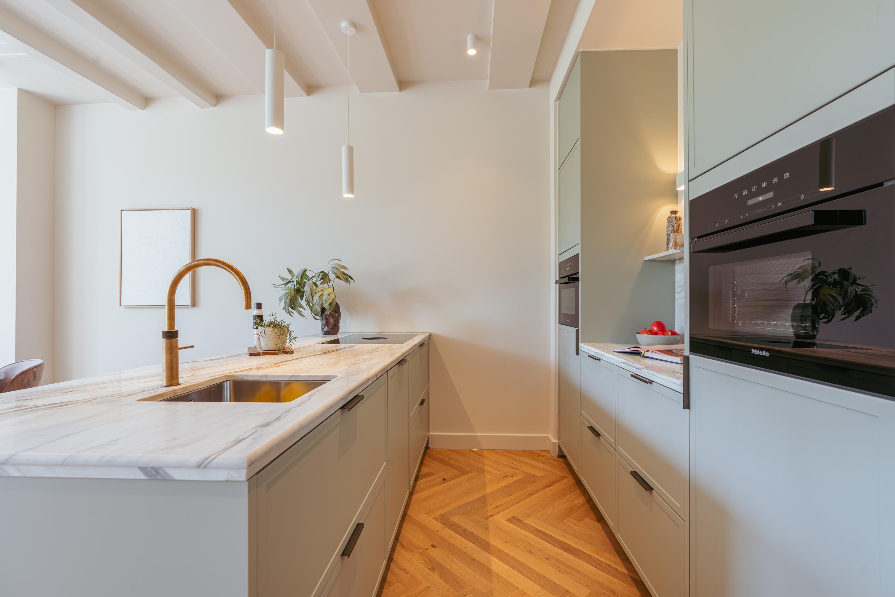 The living area and open kitchen are situated on a split level, creating a playful and spacious effect. The kitchen is equipped with every imaginable built-in appliance, including a Quooker, Siemens Studioline combination oven and oven, Bora induction cooktop with integrated extractor, dishwasher, and ample storage space. A marble countertop and brass accents complete the elegant design. The bar area, featuring a marble top and wooden bar stools, makes the space perfect for both elaborate cooking and relaxed entertaining. At the front, the living room features three impressive tall windows offering stunning views of the majestic Keizersgracht. Natural light floods the space, while original ceiling beams add a warm, atmospheric touch. A modern gas fireplace forms the cozy centerpiece of this inviting room.