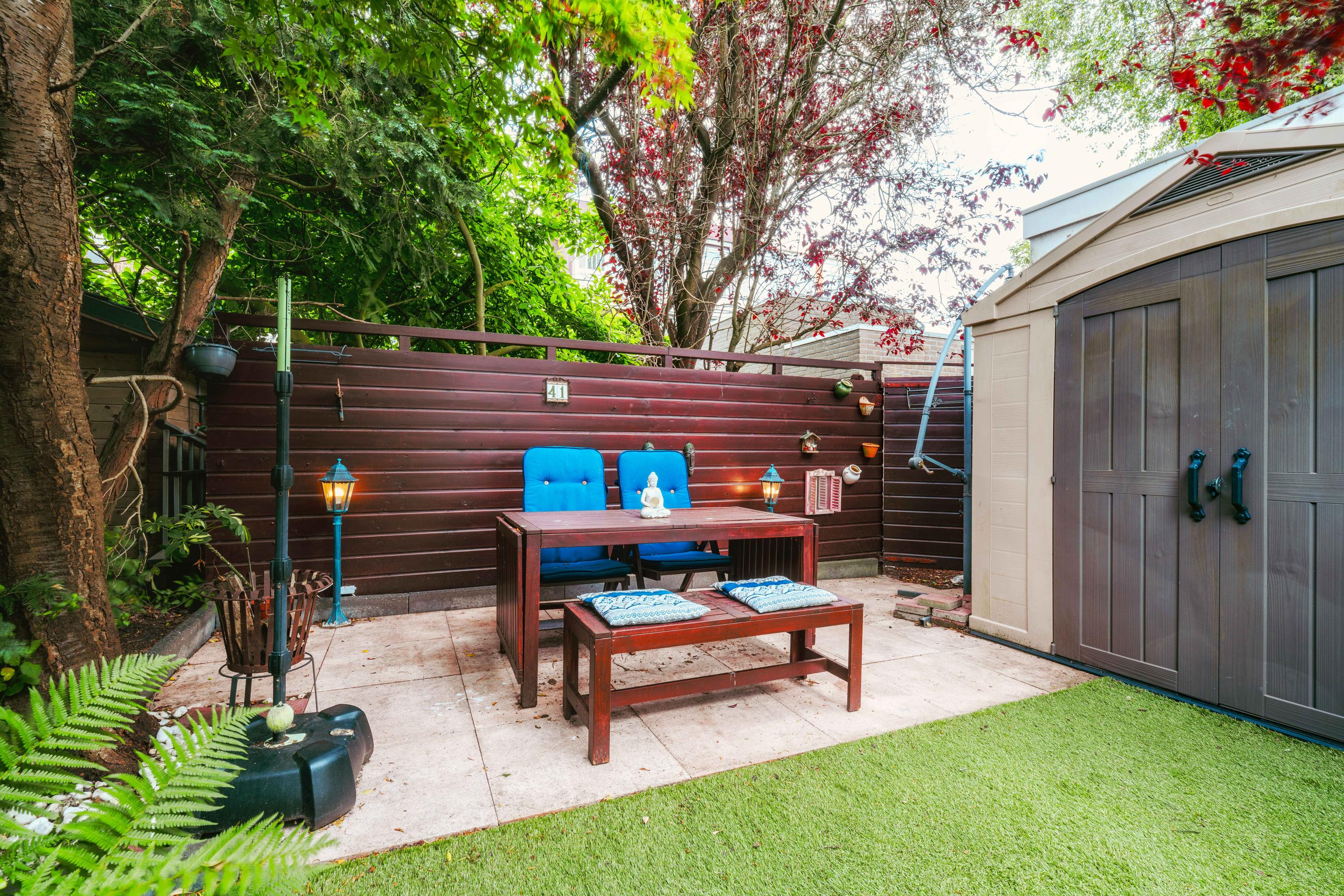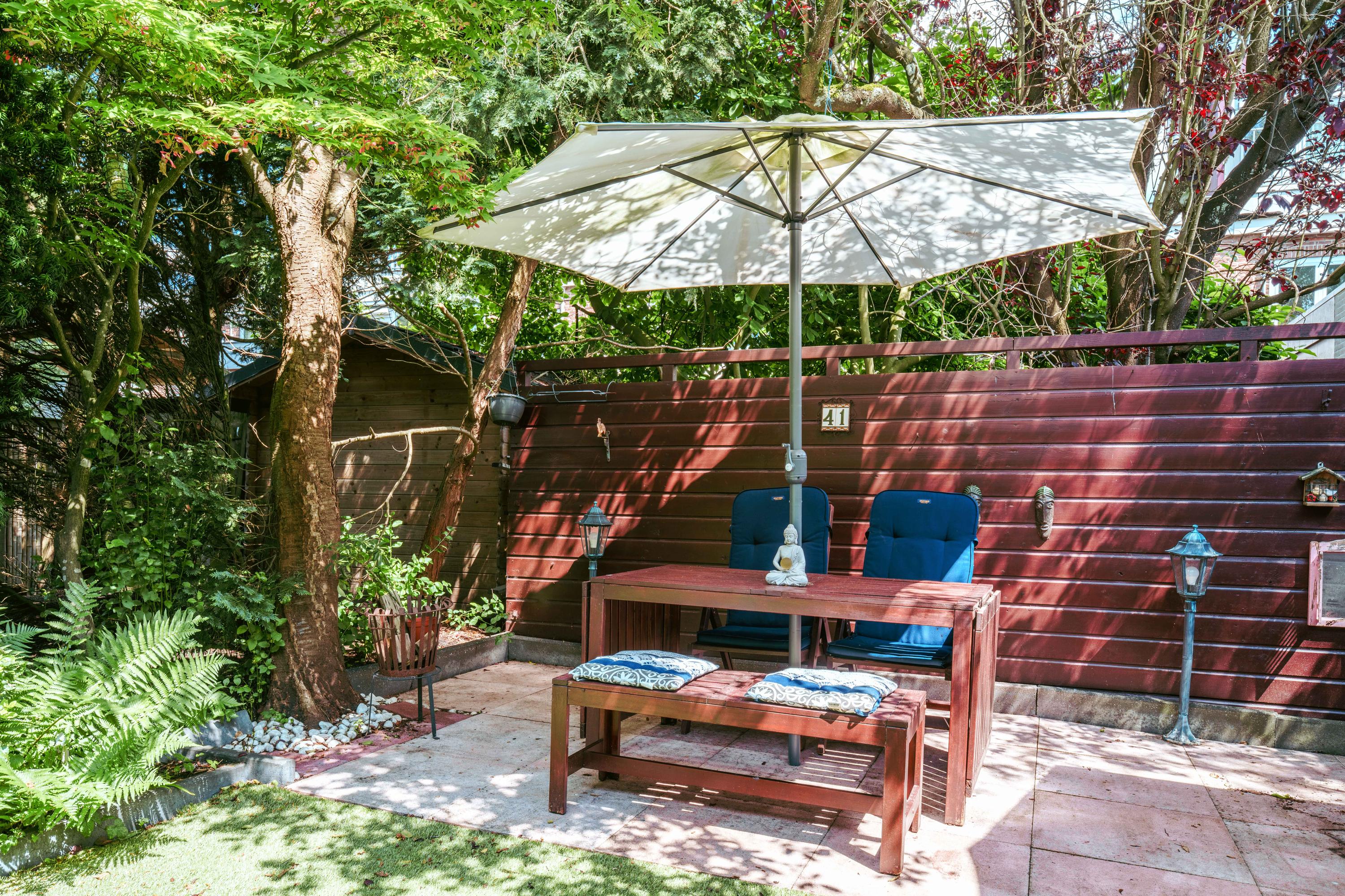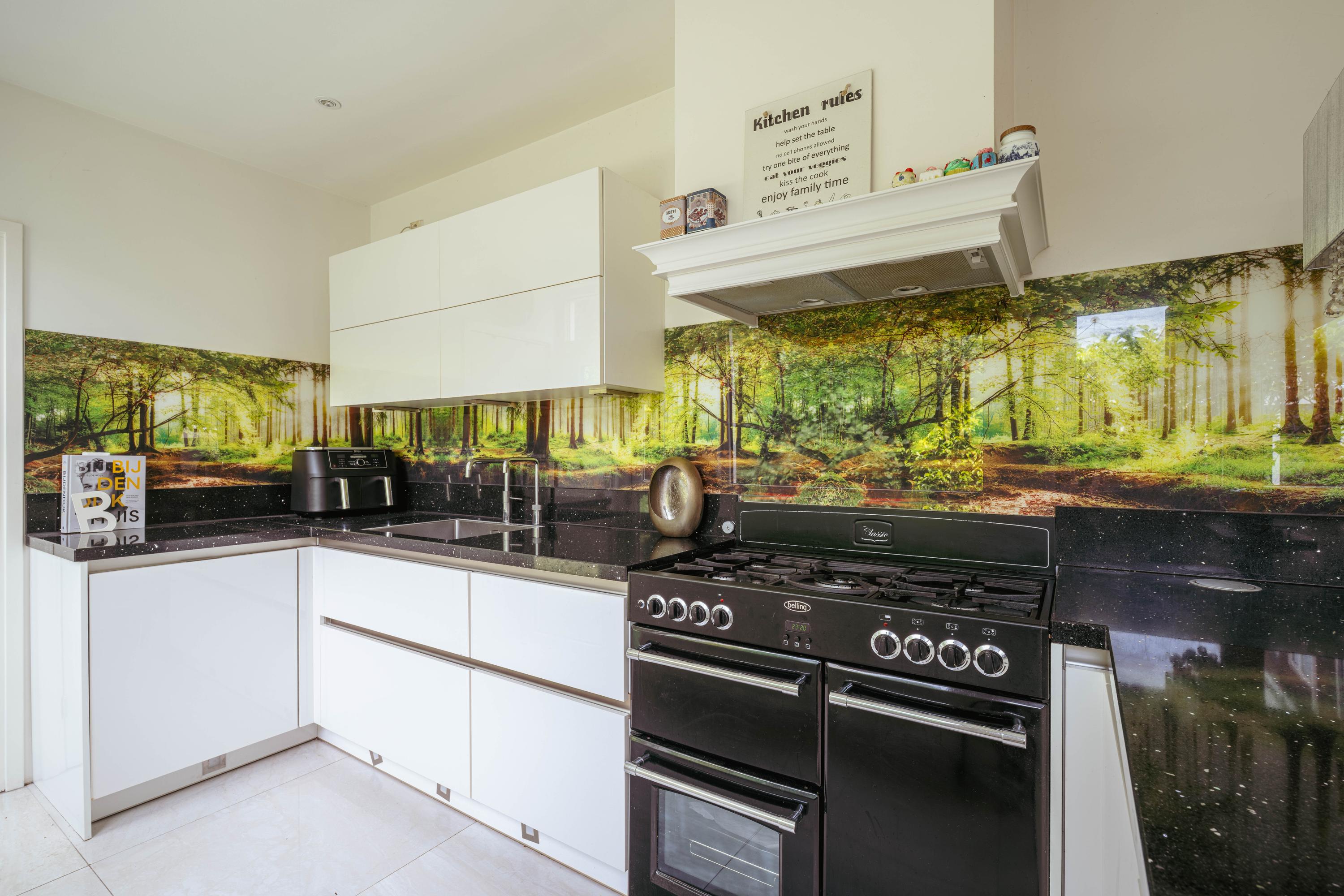 Through the spacious front garden, you reach the entrance to the house. You enter the vestibule with wardrobe space, which leads to the central hall. Here you will find practical storage space and a separate toilet. Double doors give access to the spacious and bright living room. At the front is the sitting area, attractively furnished with a gas fireplace. At the rear you will find the dining room, which is directly connected to the semi-open kitchen. The kitchen is fully equipped with a fridge, oven, microwave, gas cooker, dishwasher, and sink. A cosy bar area and seating area make this a nice place to cook and get together. Adjacent to the kitchen is the utility room, ideal as extra storage space or laundry room. From the kitchen, you have access to the wonderful and spacious back garden (approx. 51m²), facing east and equipped with storage.