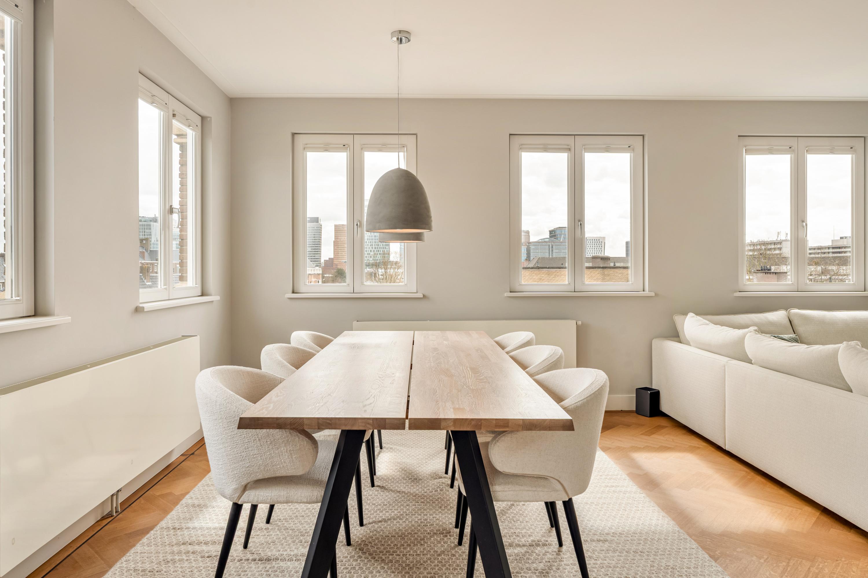 The adjacent living room fully benefits from its corner position and is exceptionally bright thanks to no fewer than eight windows. The unobstructed views over Minervaplein, Michelangelostraat, and the Zuidas skyline are impressive—especially atmospheric in the evening.