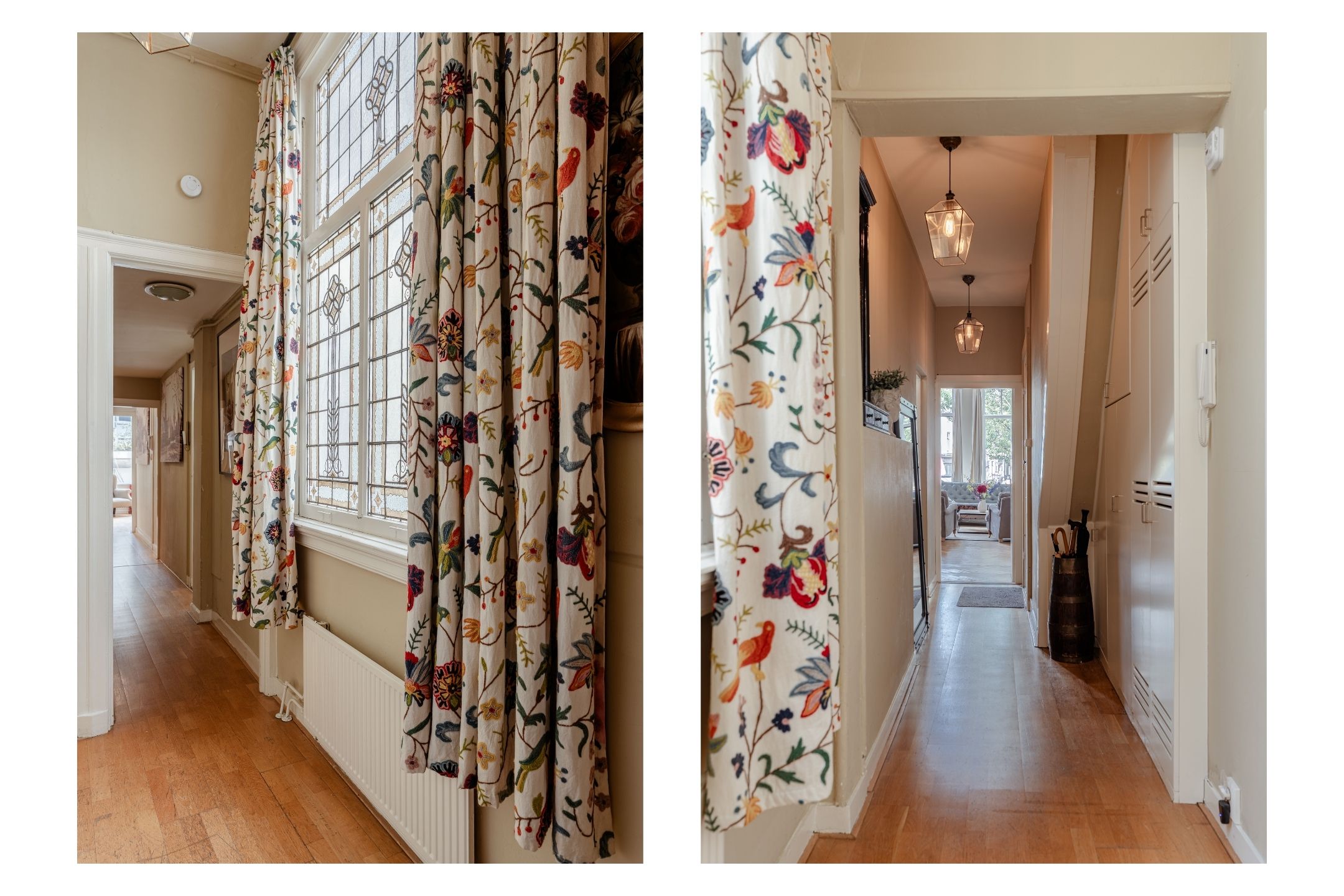 The entrance to the property is directly on the Prinsengracht, next to Brooklyn Antiques. Through the characteristic wooden front door with stained-glass transom window, you enter the shared hallway. The staircase leads to the first floor, where the entrance to the apartment is located.