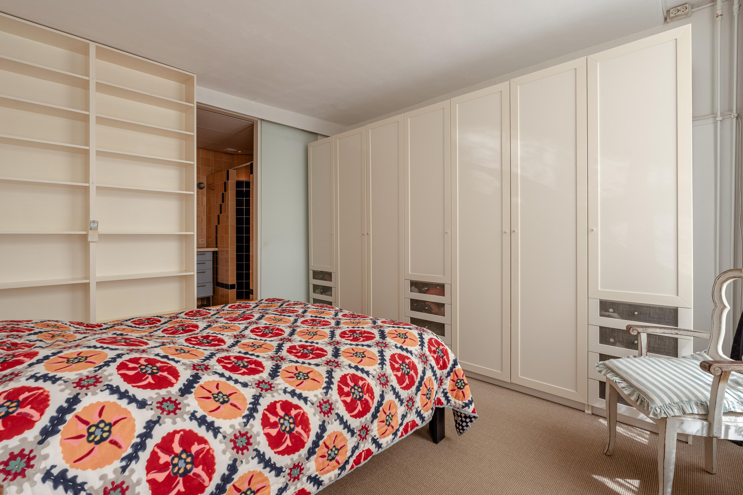 At the rear, there is another large bedroom with built-in closets and its own kitchenette, including connections for a washing machine and dryer. Thanks to the wide windows, this is a bright and self-contained space, perfectly suited as a studio or office.