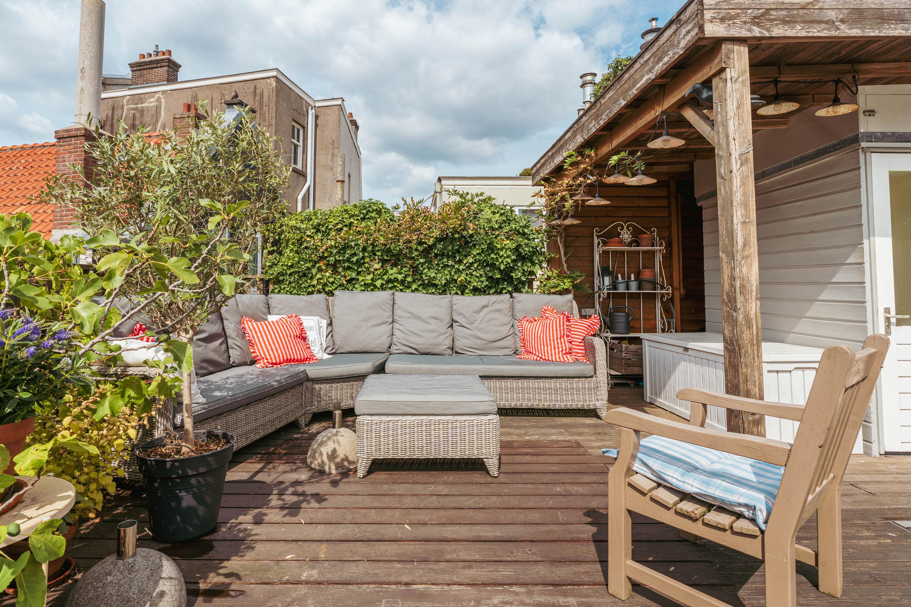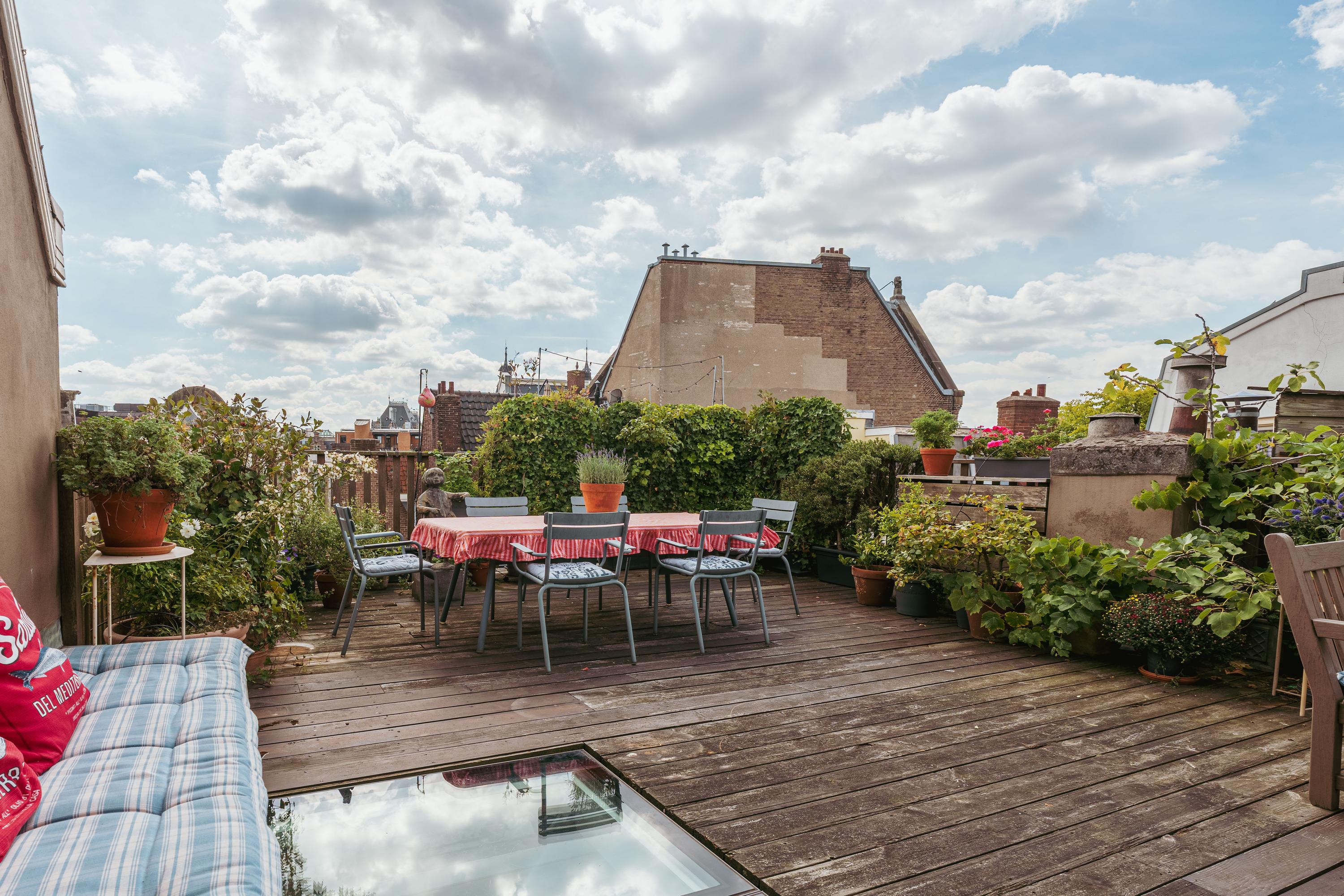 The generous size allows for multiple seating and dining areas, making it ideal for relaxing or entertaining guests. A covered section ensures you can enjoy the outdoors comfortably even on less sunny days. From here you have stunning views over the historic rooftops of central Amsterdam.