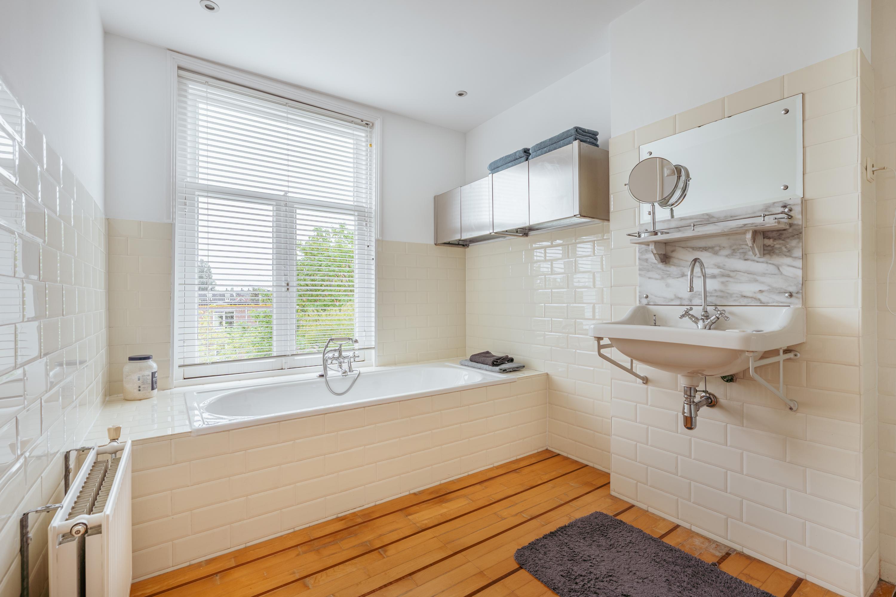 This entire floor is characterized by high ceilings, wooden flooring, and large windows with stained-glass details. At the front, the living room spans the full width of the house and overlooks the green of the Sarphatipark. The abundance of natural light and the generous layout give this space a calm and inviting feel.
