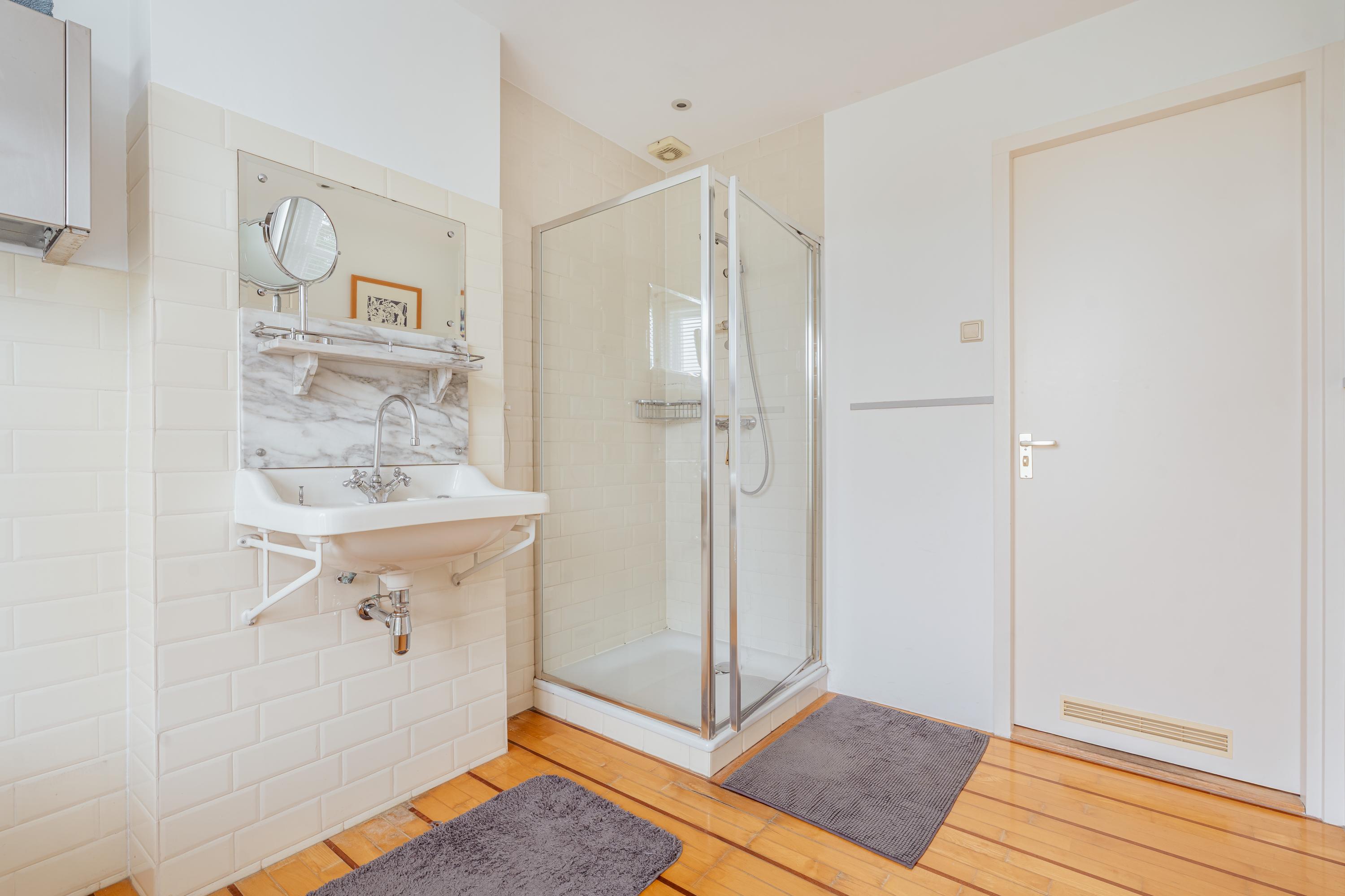 At the rear is the spacious master bedroom, filled with natural light thanks to the large windows and with direct access to the bathroom. The bathroom is modern and well equipped with a bathtub, separate shower, washbasin, and ample built-in storage. The separate toilet is accessible both from the bathroom and from the landing.