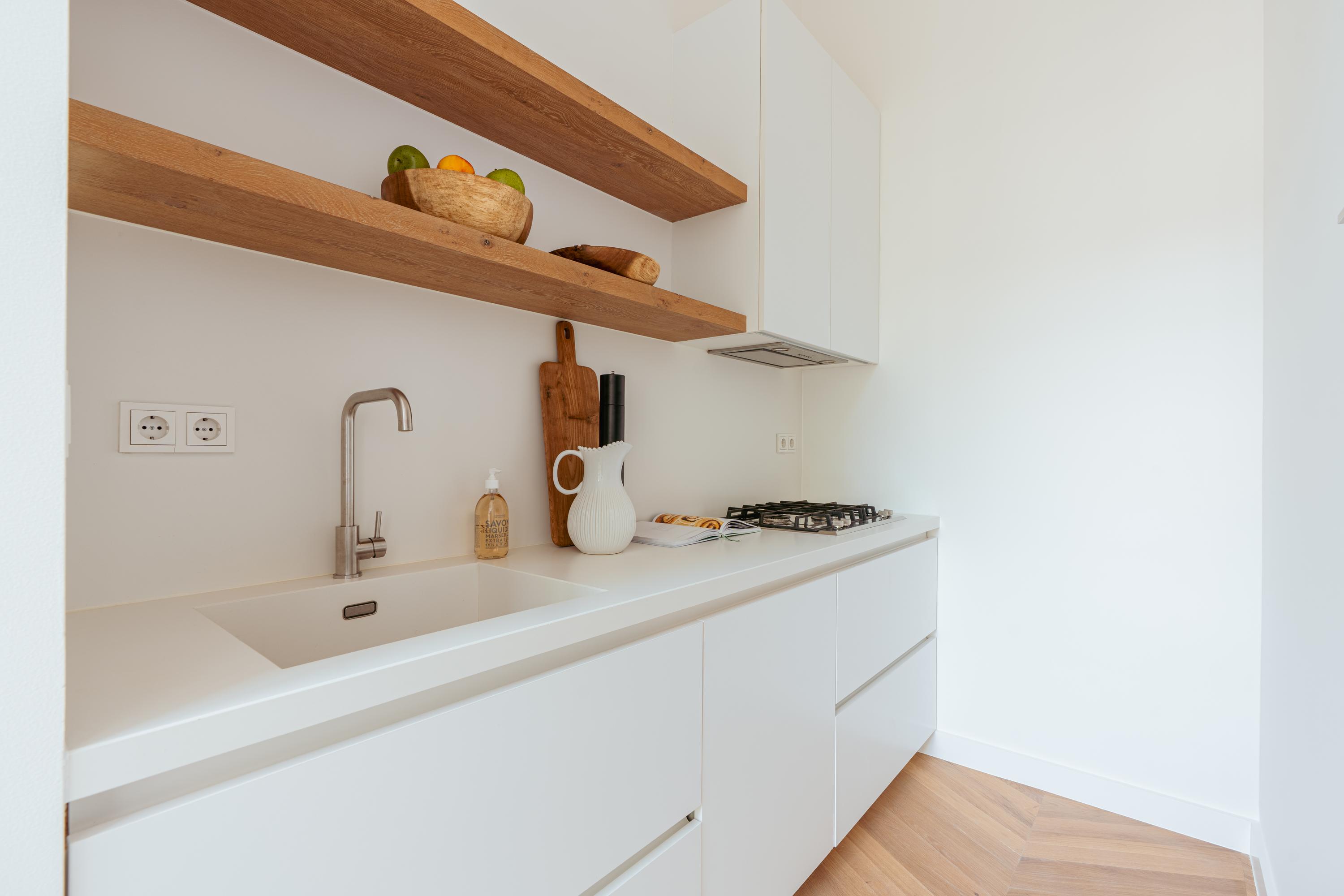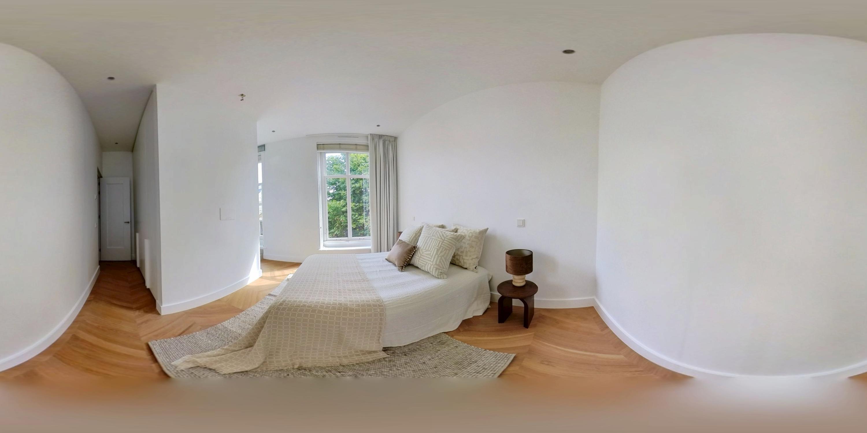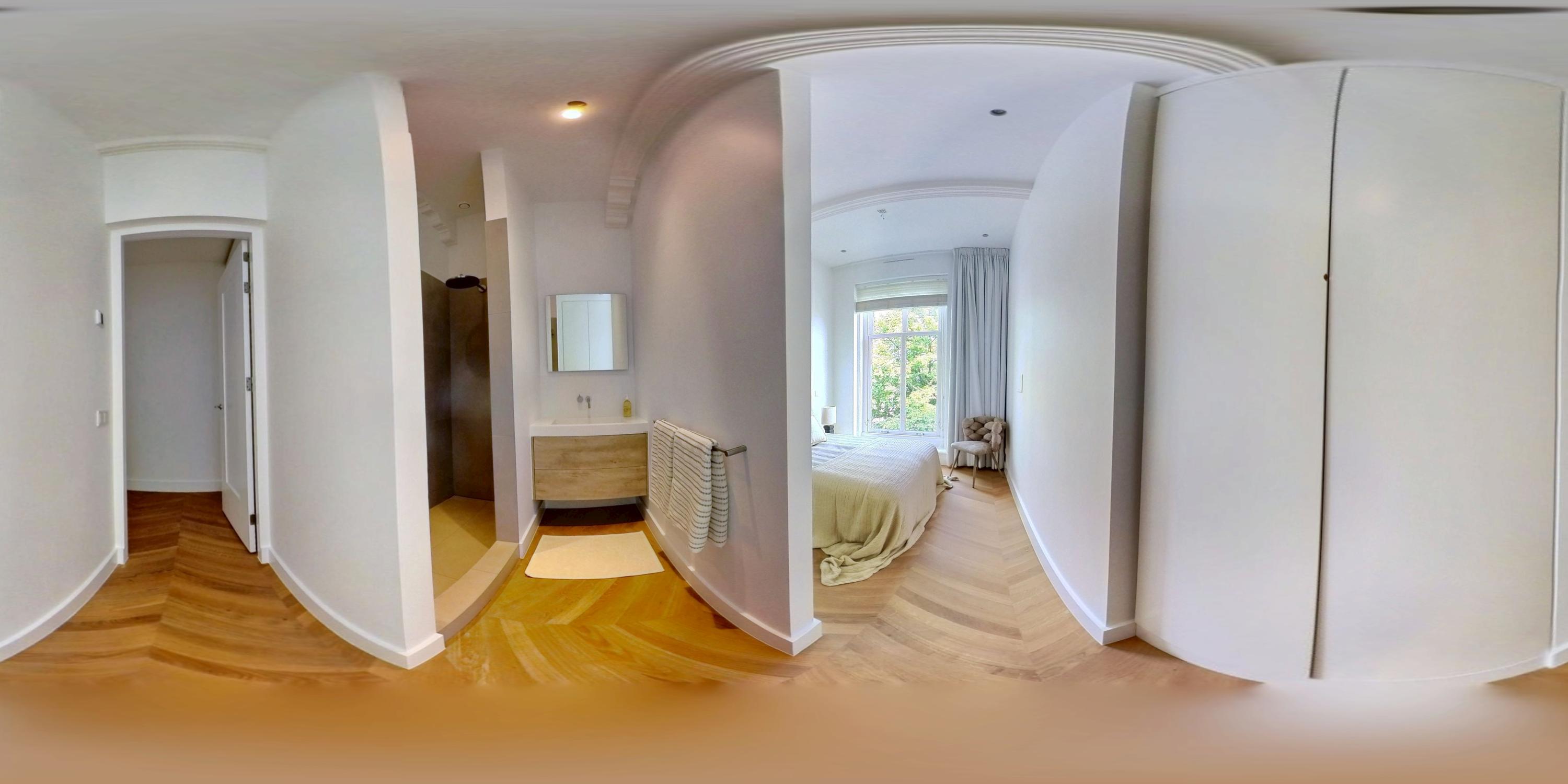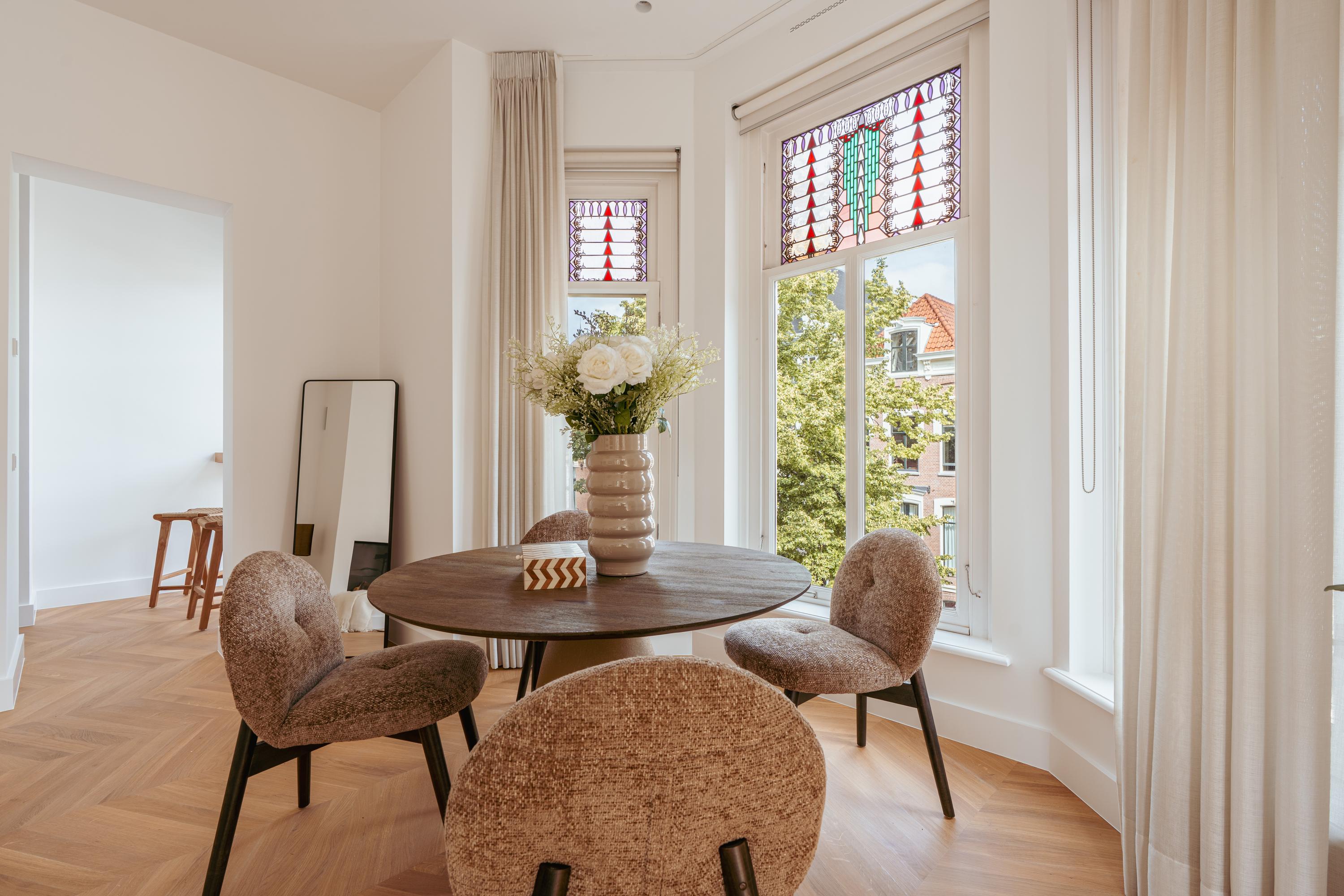 Apartment Amsterdam Vondelpark neighbourhood, measuring approximately 85 m², is set within a monumental building, offering a sense of quiet distinction in one of the city’s most beloved neighbourhoods. This second-floor residence has been fully renovated, with details such as over three-metre-high ceilings, elegant bay windows, and a wood-burning fireplace that anchor the main living space in calm, natural light. The layout is intuitive—a spacious hall connects all rooms. Two generously sized bedrooms each have private en-suite bathrooms with walk-in showers and thoughtful built-in wardrobes. The semi-open kitchen, equipped with luxury integrated appliances and a bar counter, invites both casual mornings and evenings shared with friends. Mechanical ventilation, underfloor heating, and lift access further elevate day-to-day comfort. Freehold tenure affords peace of mind.