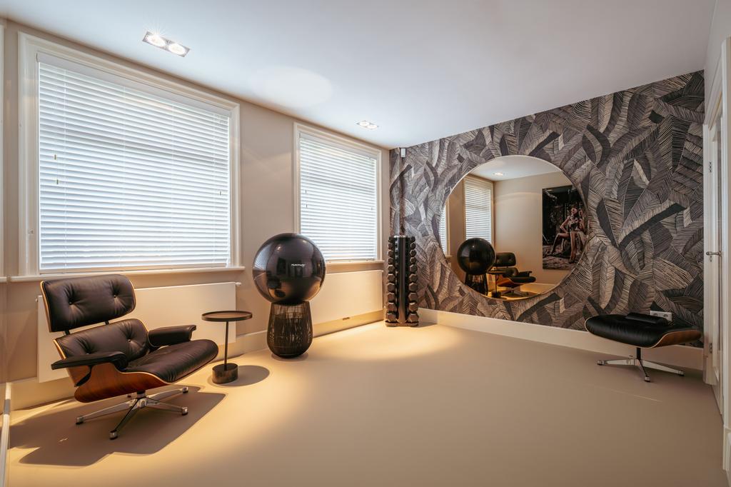 To the front is a bedroom with an en-suite bathroom featuring a washbasin and walk-in shower—currently used as a home gym, but easily repurposed. At the rear is the stunning open-plan kitchen, the centerpiece of this level. Outfitted with Gaggenau appliances, including a fridge, freezer, Quooker, five-burner gas stove integrated into the counter, oven, steam oven, dishwasher, and wine fridge, the kitchen combines luxury and functionality. A solid natural stone countertop with a wooden breakfast bar provides a warm, refined look.