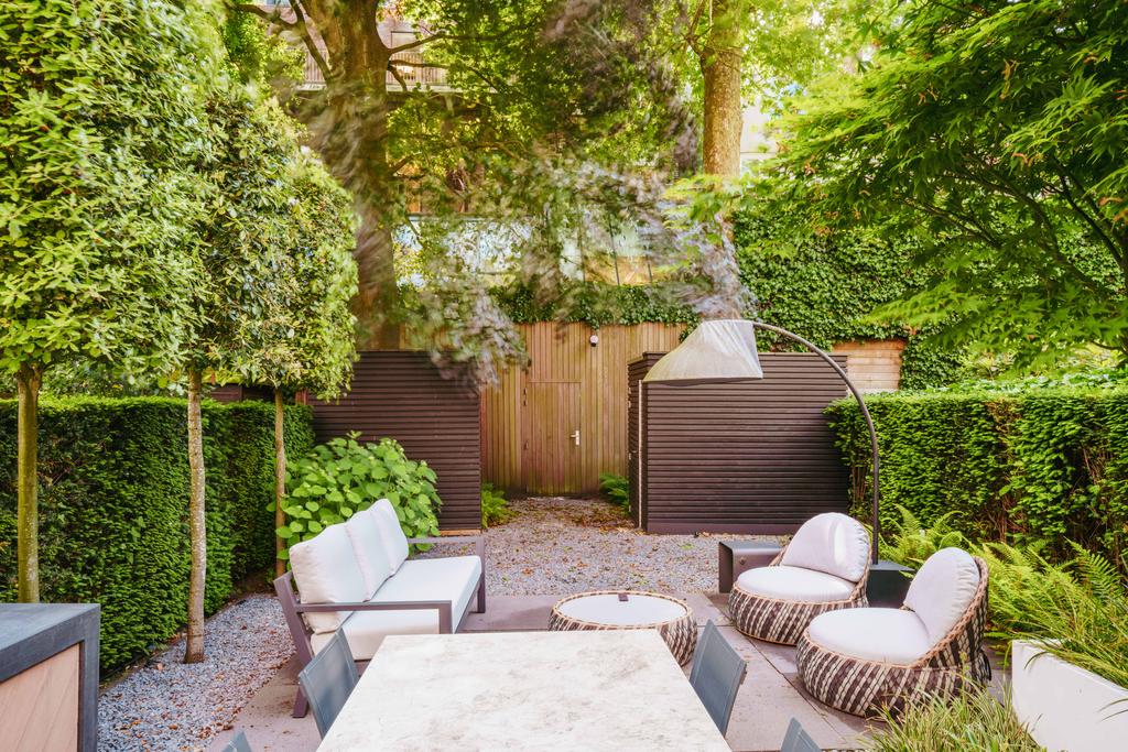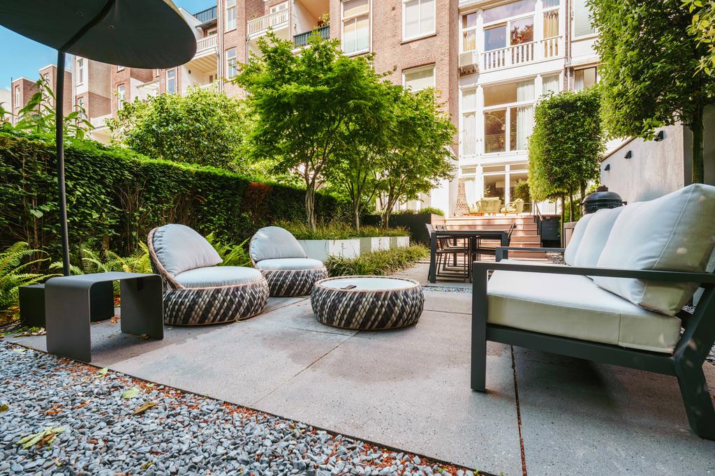 Designed by landscape architect Erik van Gelder, the garden includes a fully equipped outdoor kitchen, making it perfect for summer evenings. A detached storage shed offers additional functionality. This outdoor space is a peaceful and private retreat, ideal for enjoying long, sunny days.