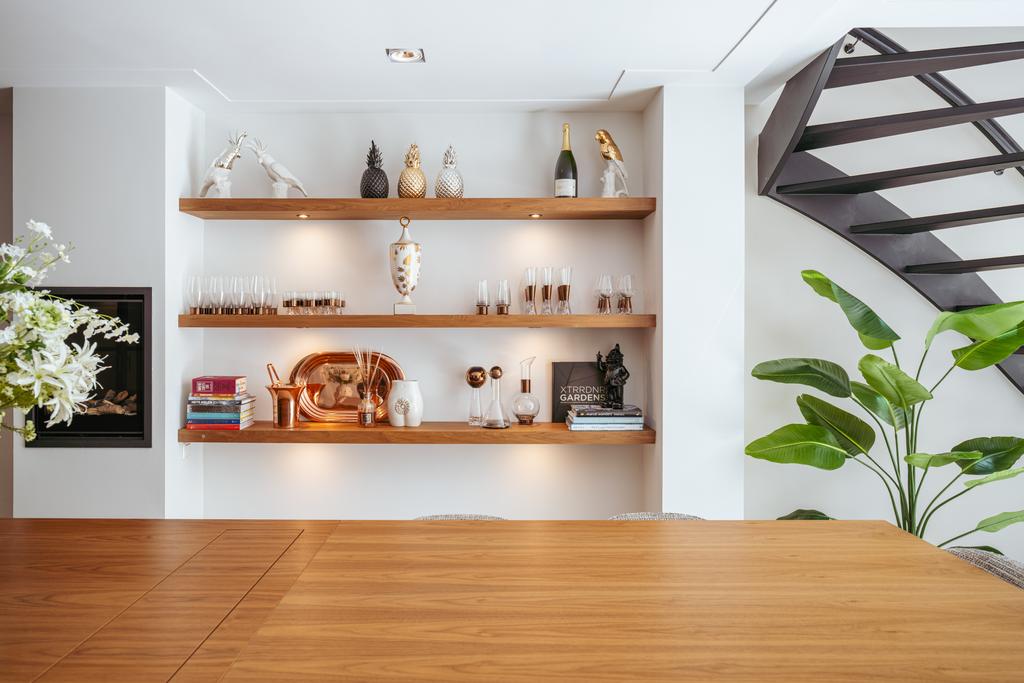 At the front, a cozy sitting area centers around a stylish gas fireplace with a marble mantelpiece, flooded with natural light through large windows and offering an uninterrupted view of Vondelpark. The dining area at the rear is accessible from both the living room and hallway through sleek steel pivot doors and features another gas fireplace with a marble surround, adding warmth and sophistication. A staircase connects this space to the kitchen in the lower ground floor, creating a natural flow between the levels.