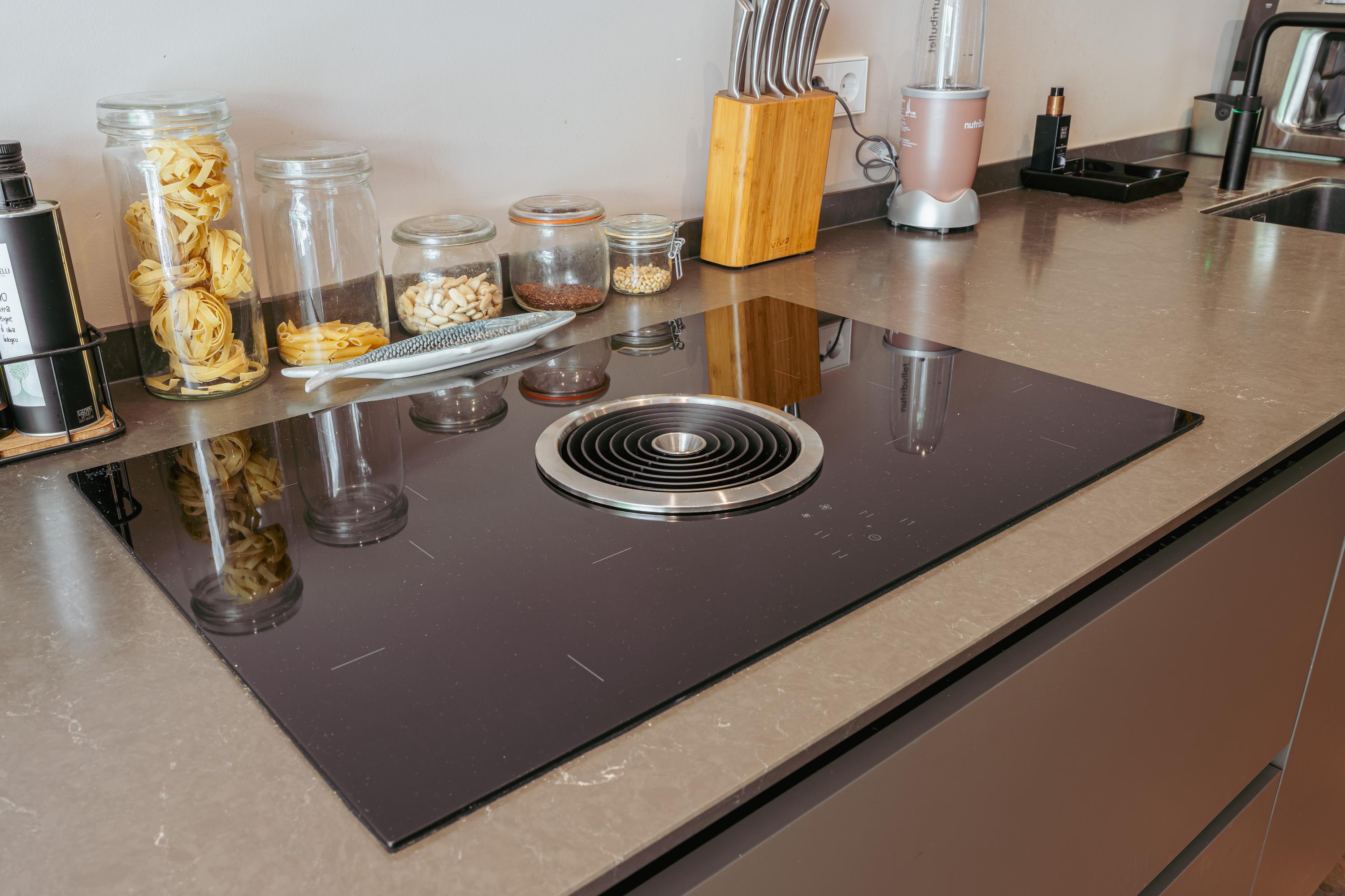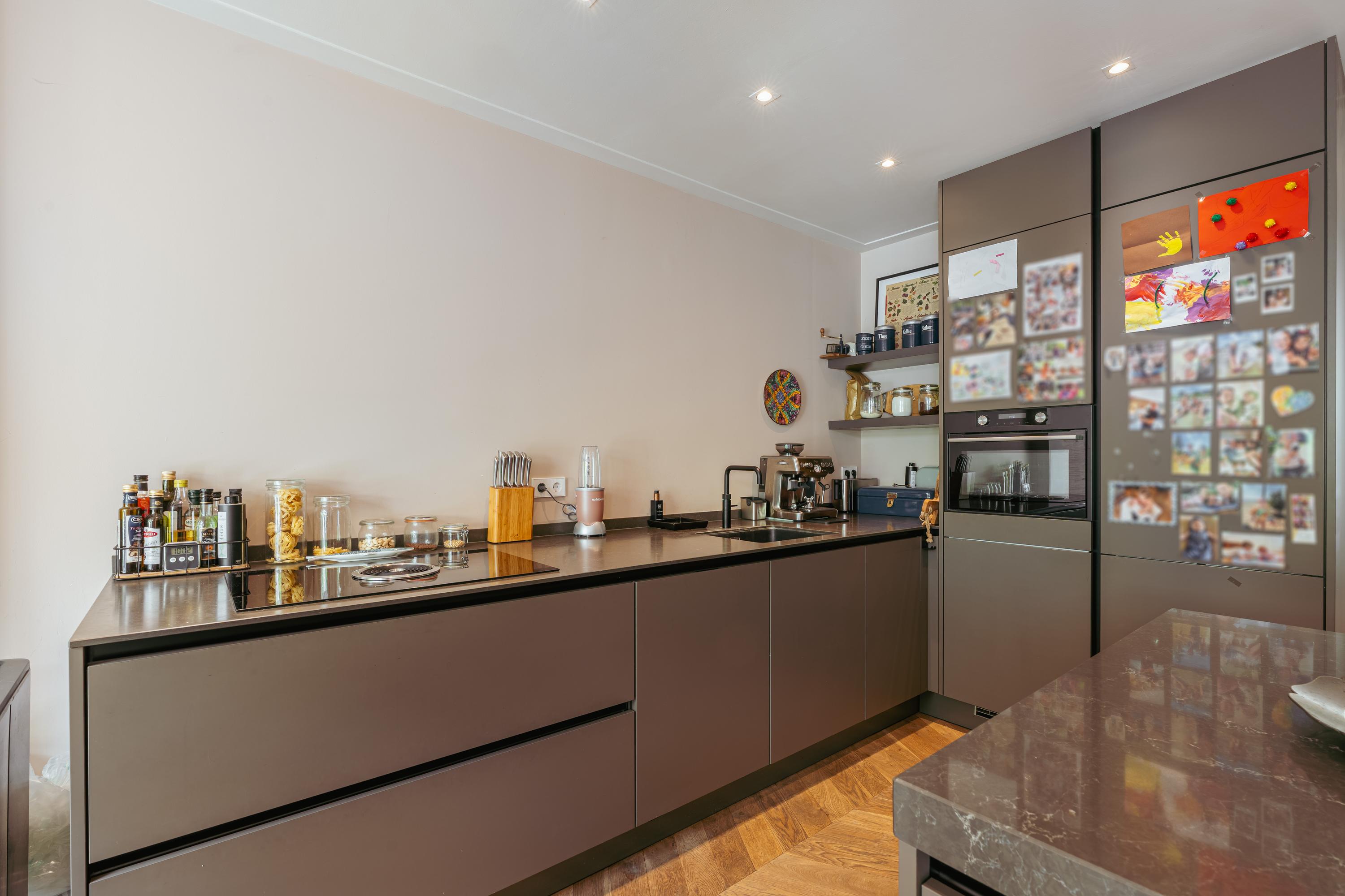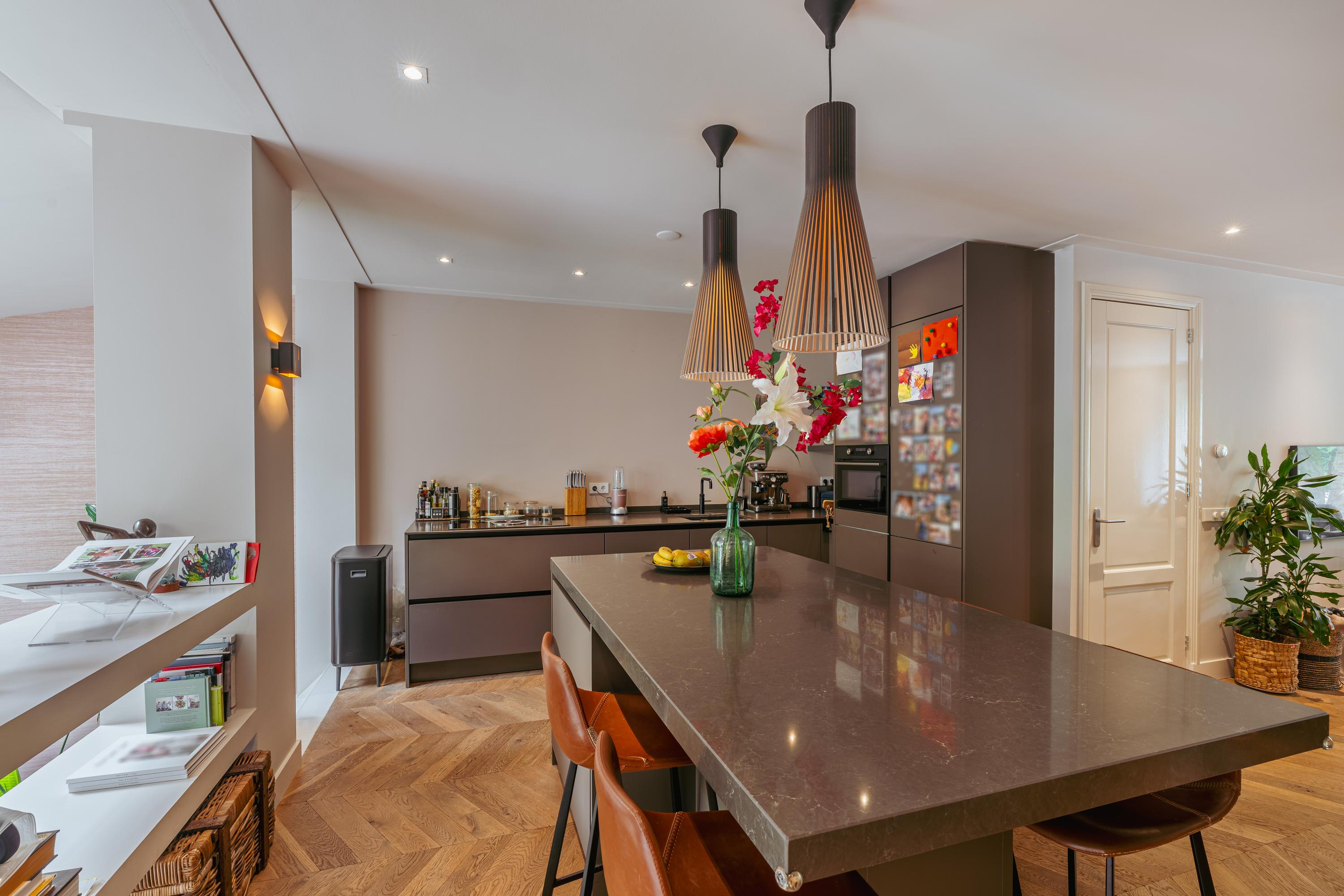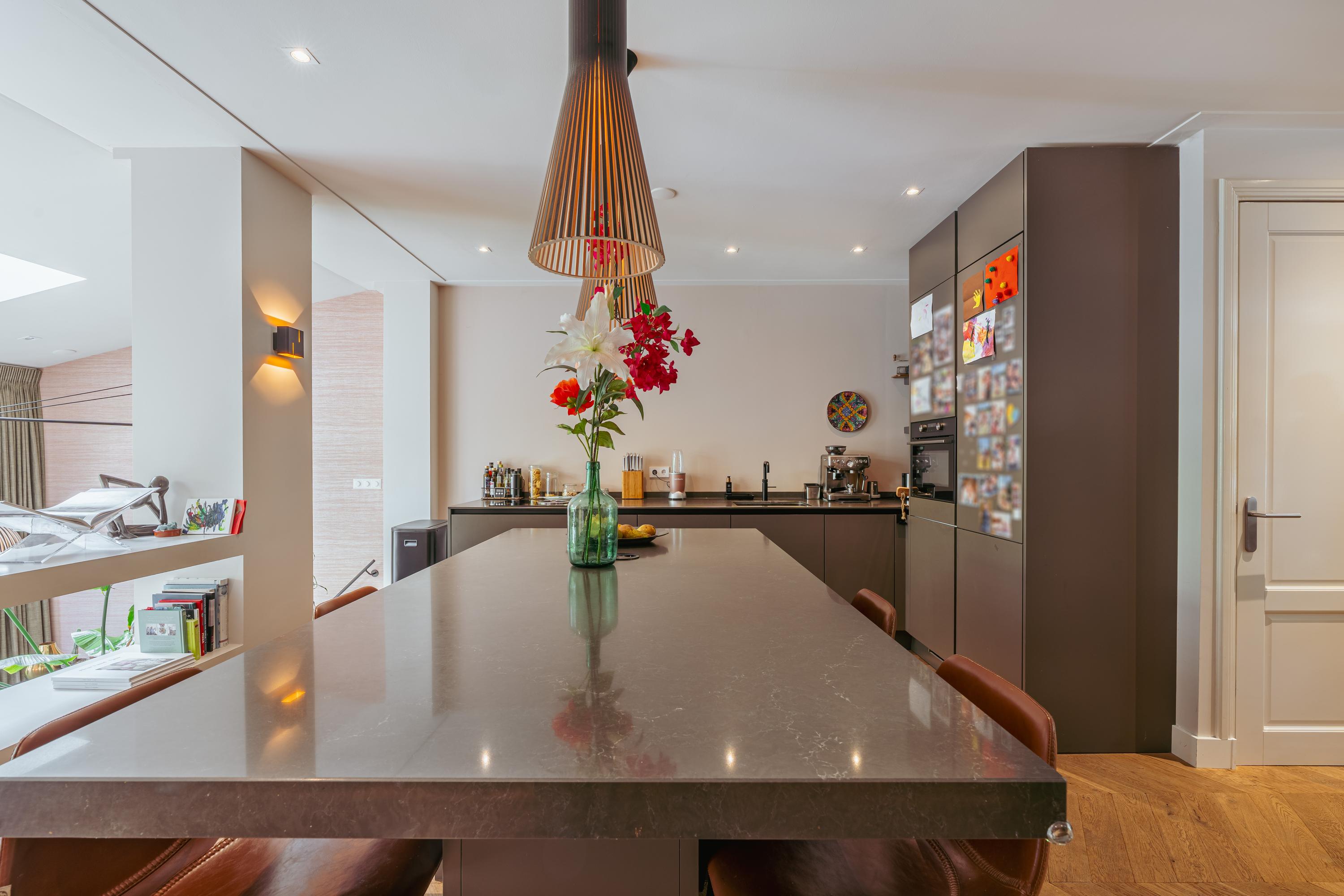 At the front of the property, you'll find the spacious living room, easily large enough to accommodate a comfortable seating area. Centrally located is the open kitchen, featuring a stylish cooking island and cozy bar area. The kitchen is equipped with high-quality built-in appliances, including a 4-burner induction hob with integrated extractor, dishwasher, fridge/freezer combination, combi-oven, and a Quooker.