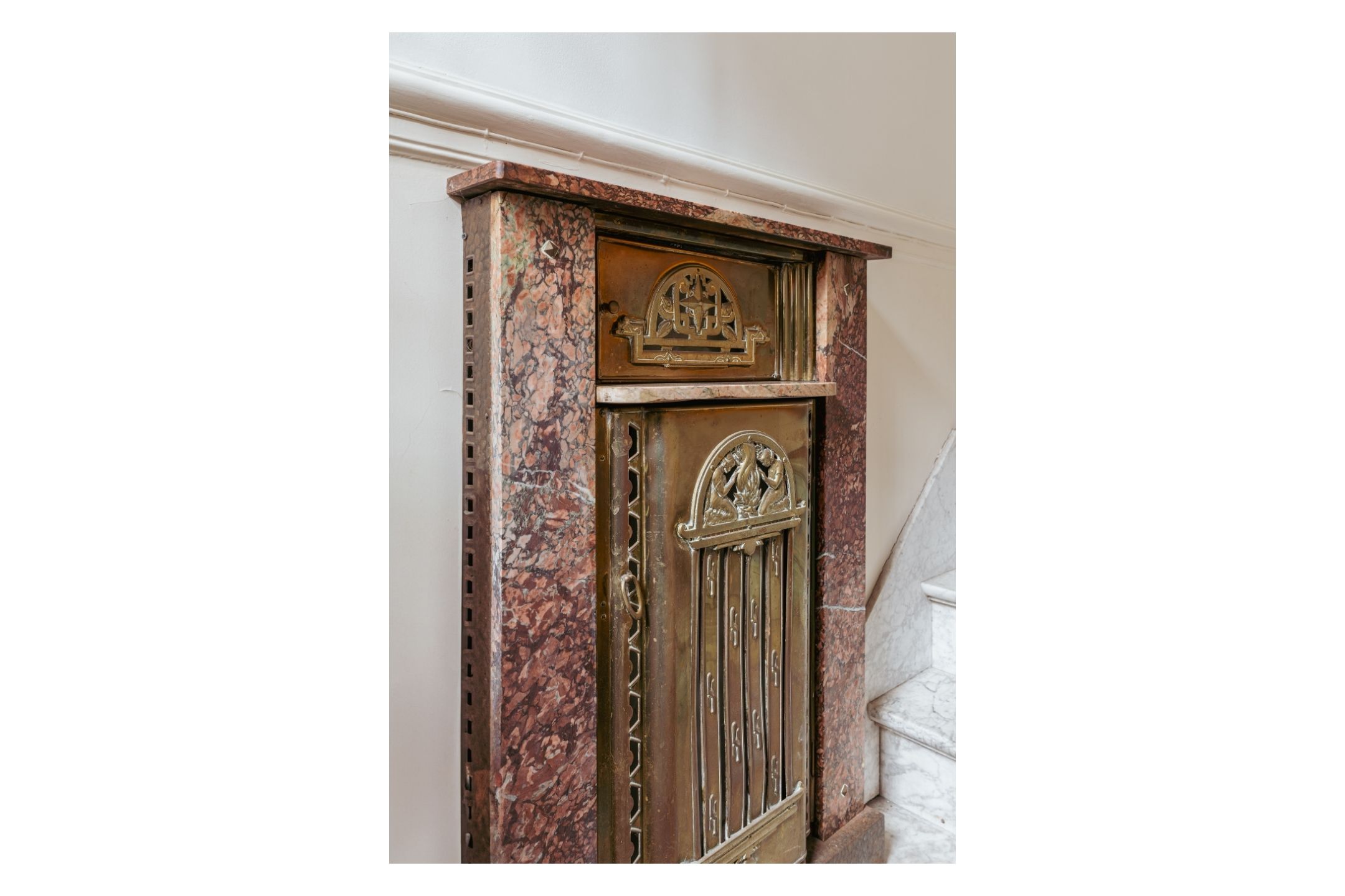 Aan de voorzijde van de woning bevindt zich de royale woonkamer met sfeervolle (open) haard en grote raampartijen, waardoor de ruimte baadt in natuurlijk licht. De woonkamer wordt extra gekenmerkt door prachtige authentieke details, waaronder rijk gedecoreerde plafondornamenten en originele schuifdeuren, die de ruimte een elegante en karaktervolle uitstraling geven. Dankzij de riante afmetingen is dit een ideale plek voor een comfortabele zithoek en een royale leefruimte.