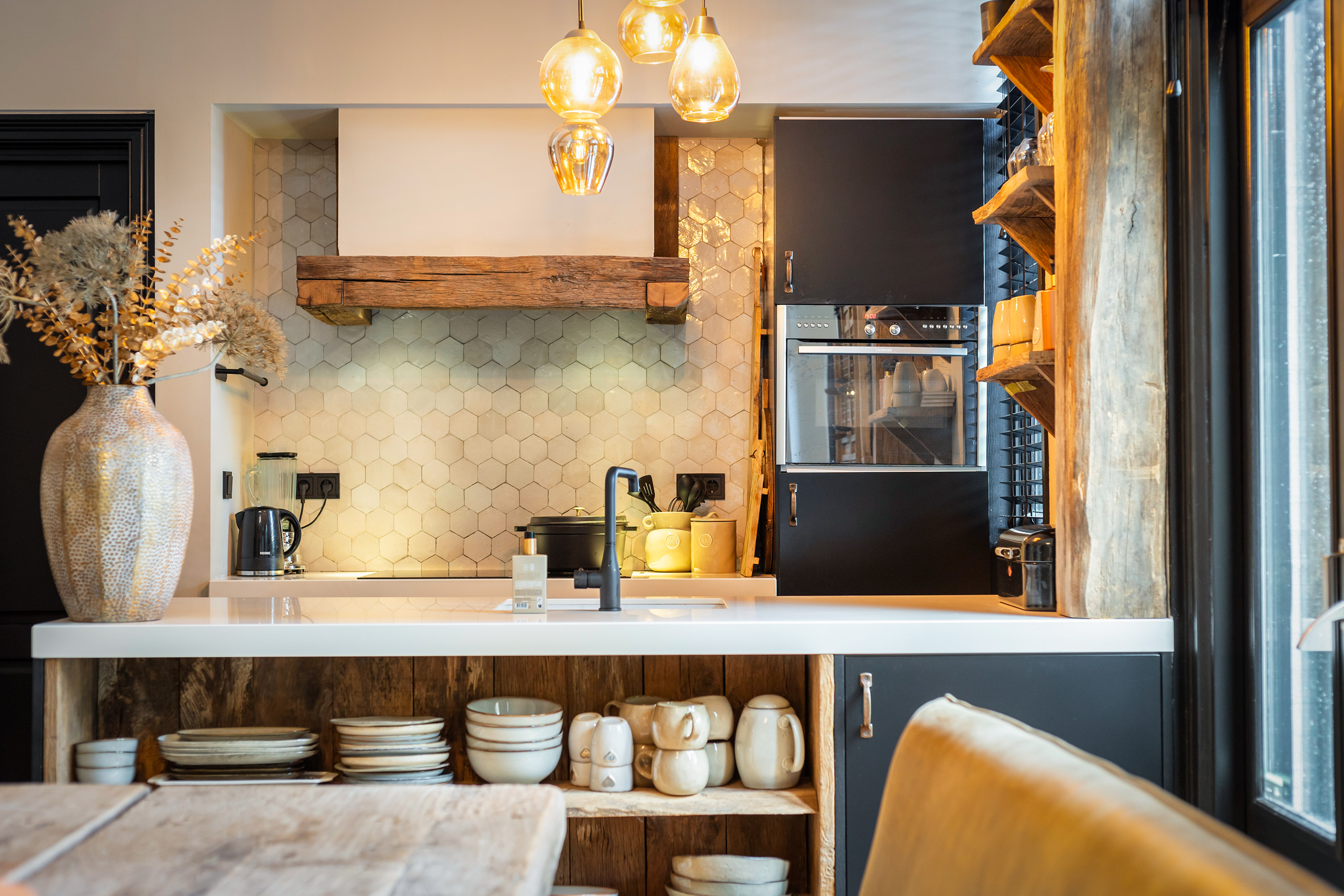 Via de originele voordeur met glas-in-lood komt u binnen in de hal met garderobe en moderne meterkast. Vanuit hier bereikt u de riante woonkeuken. Deze keuken is in 2024 vernieuwd en uitgevoerd in een stijlvolle opstelling met zwarte fronten, massief eiken accenten en hoogwaardige inbouwapparatuur, waaronder een vaatwasser, combi-oven, koelkast, inductiekookplaat en een afzuigschouw.