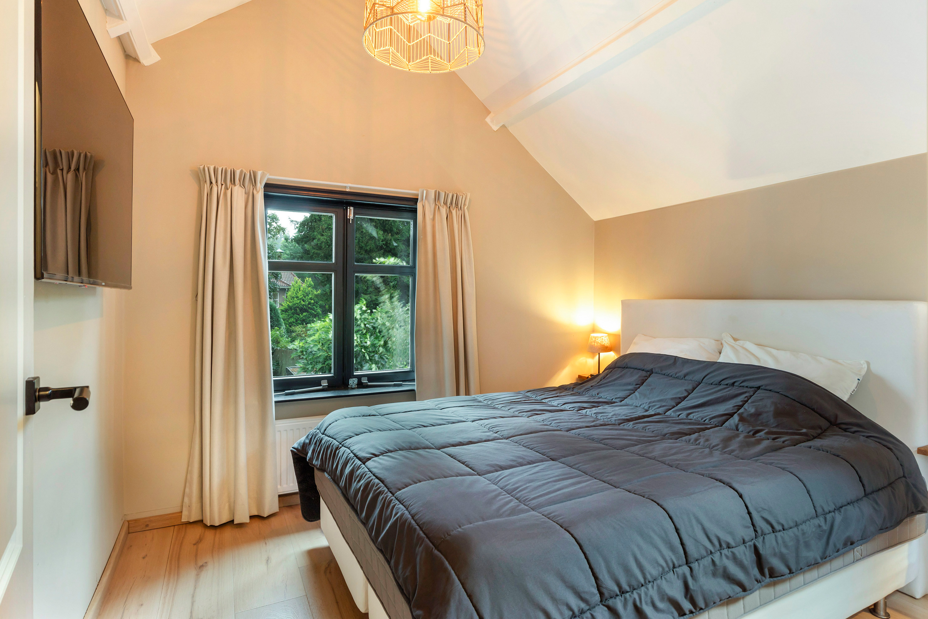De verdieping is volledig heringedeeld en biedt nu twee ruime slaapkamers die beide geschikt zijn voor een tweepersoonsbed. Daarnaast is er een praktische inloopkast. De luxe badkamer is stijlvol uitgevoerd en voorzien van vloerverwarming, een inloopdouche, ligbad, toilet en een wastafelmeubel met dubbele waskommen.