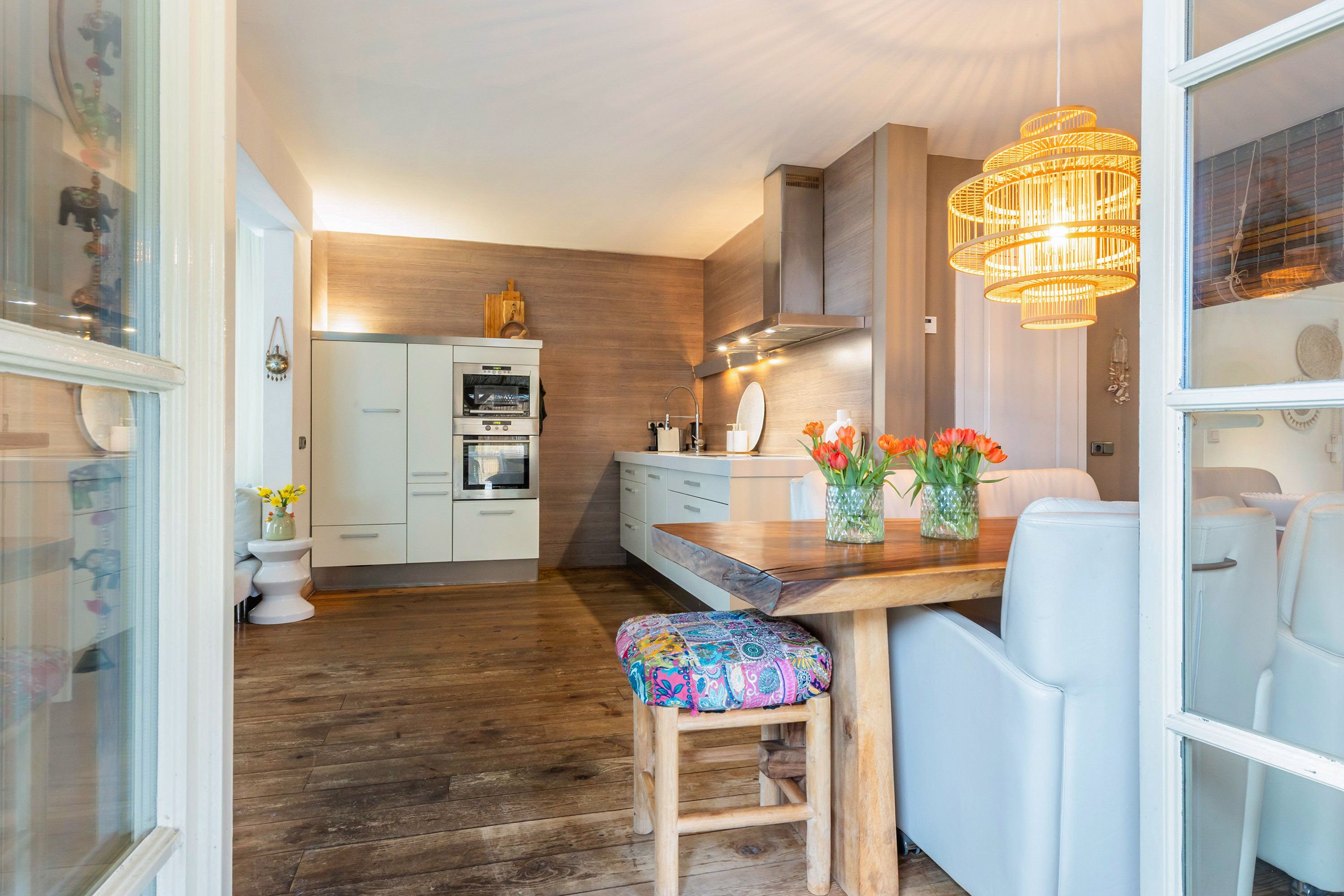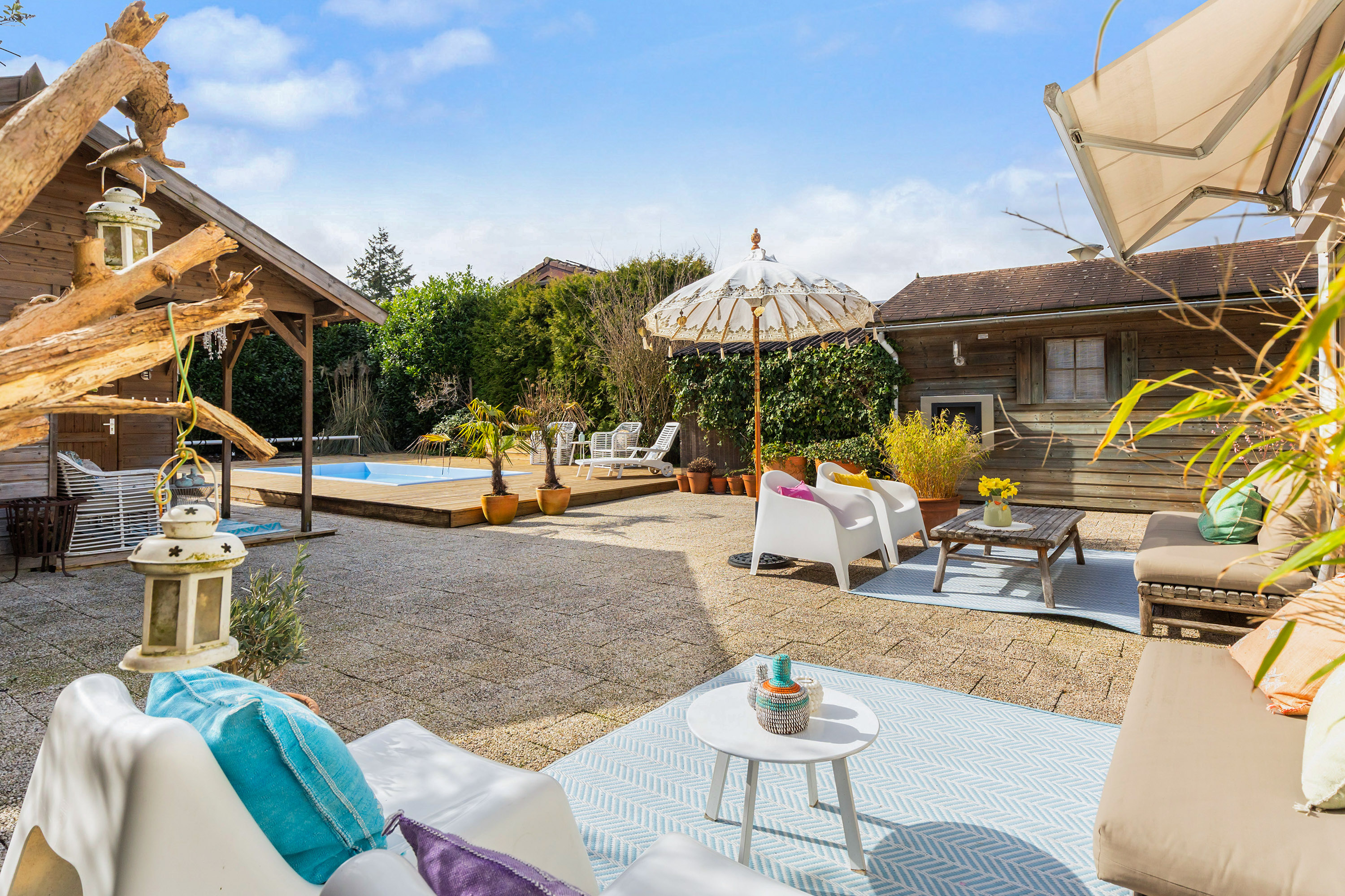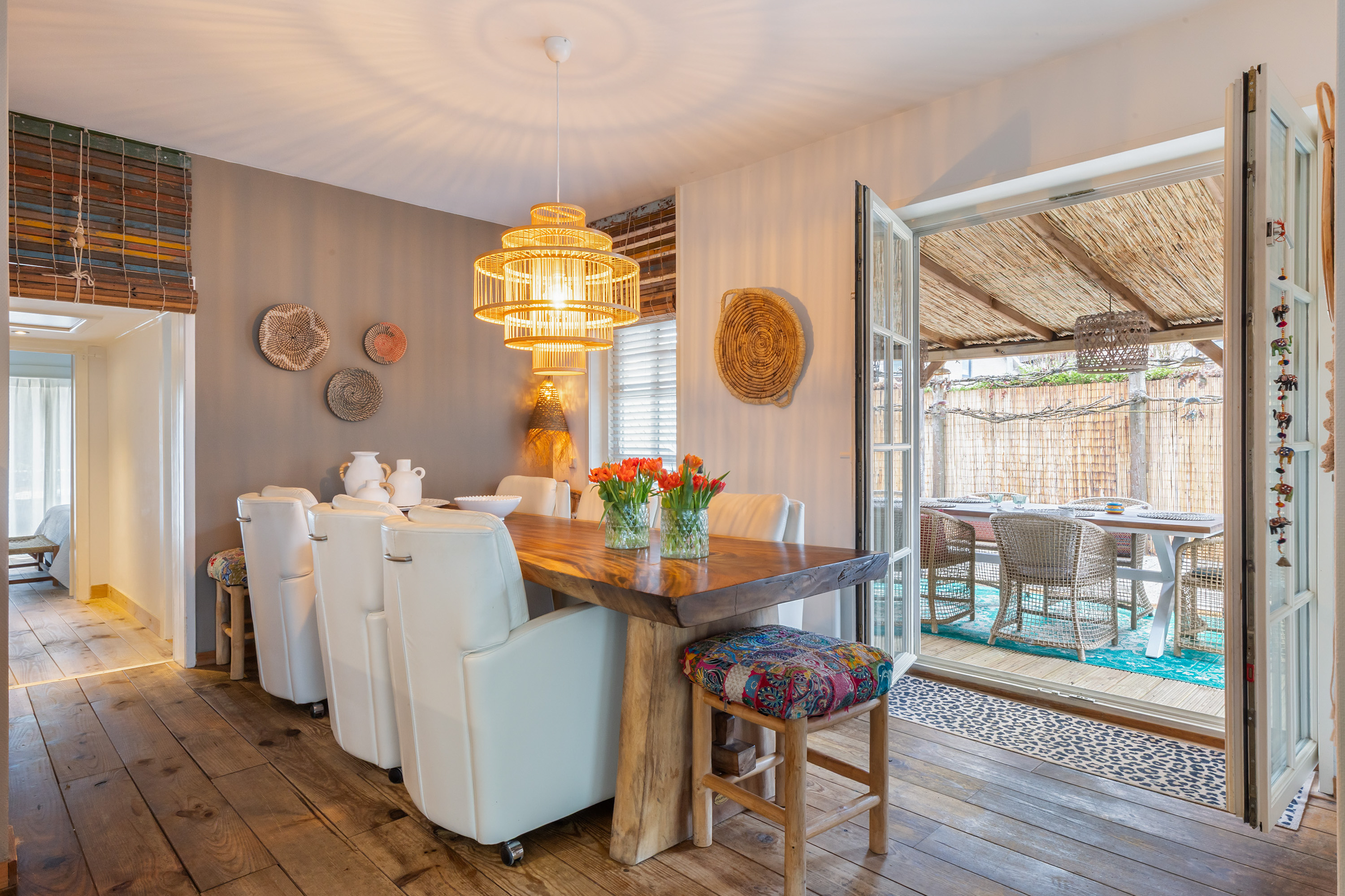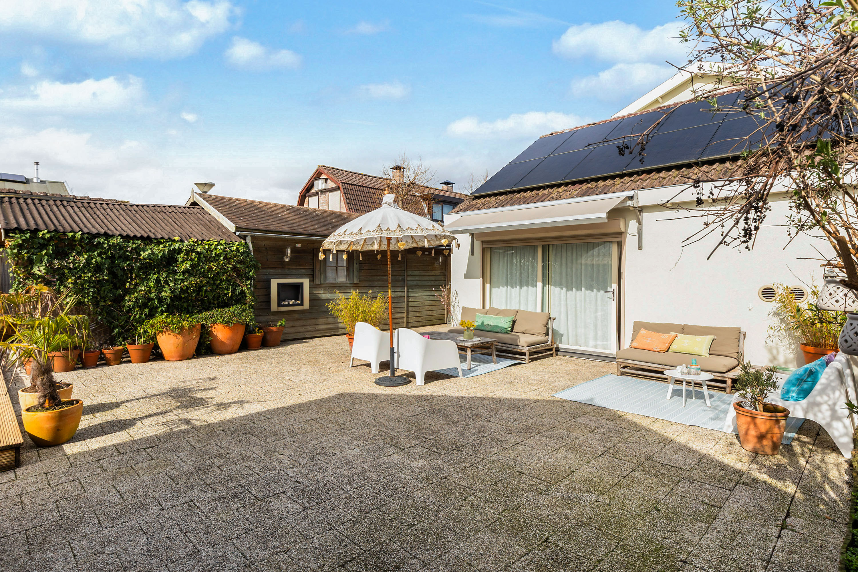 From the front of the property the full extent of the living space is hardly visible. Once inside, the space unfolds impressively, offering several living and sleeping areas, two bathrooms, two garages, two verandas and a sunny, fully private garden with swimming pool. The current finish is contemporary and inspired by a warm South-European Ibiza style. In 2026 the exterior was finished in a warm tone and fitted with characteristic louvre shutters. Combined with the sunny terraces and the pool, this creates a relaxed and almost Mediterranean atmosphere.