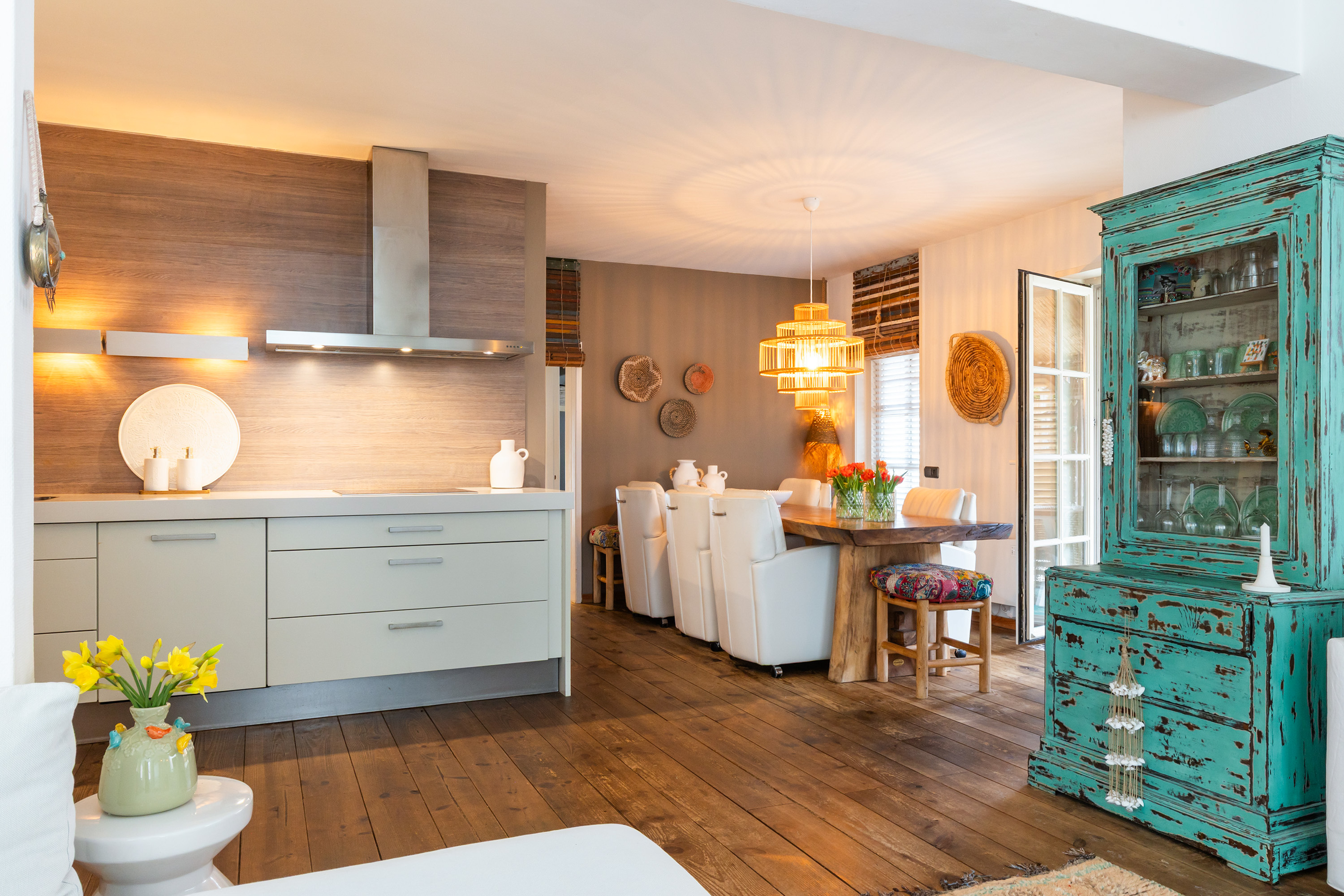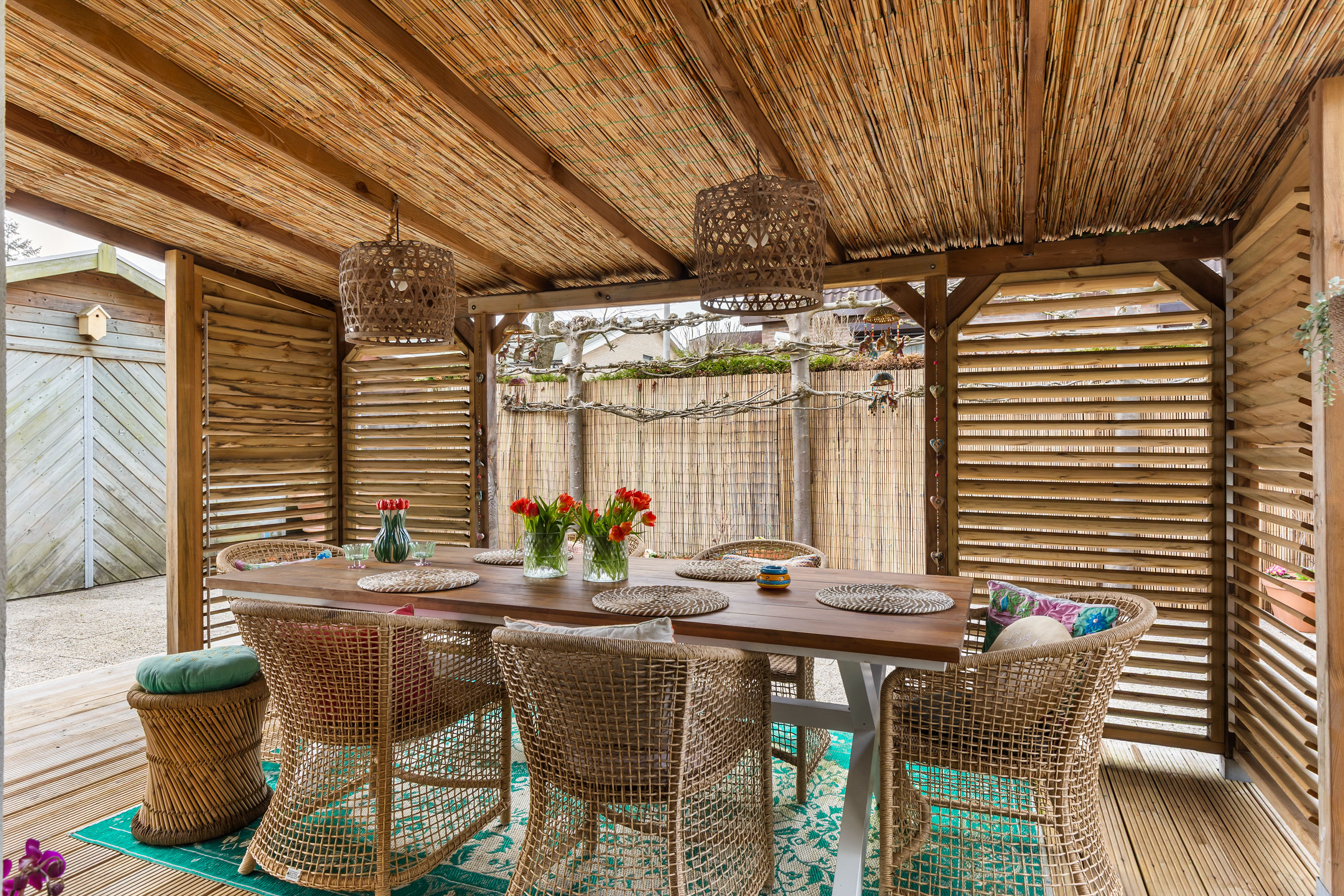 There is ample space for a large dining table with eight chairs, and the double French doors connect the kitchen directly with the veranda in the side garden. This creates a seamless transition between indoor and outdoor living. The veranda has a sunny appearance thanks to the wooden decking and wooden louvre screens which also serve as sun protection. It is an ideal place for outdoor dining and enjoying time with friends and family.
